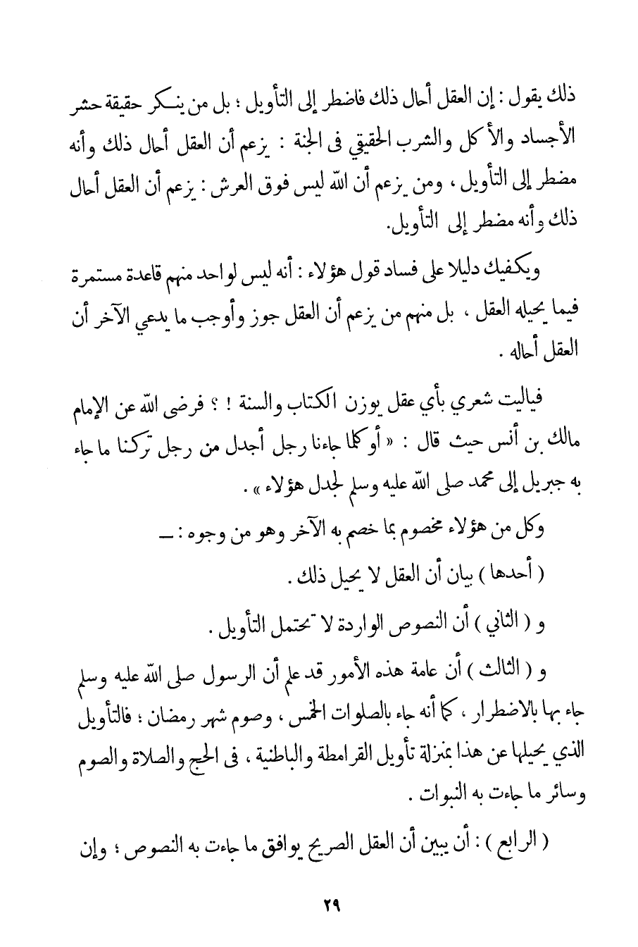 ذَلِكَ يَقُولُ: إنَّ الْعَقْلَ أَحَالَ ذَلِكَ فَاضْطَرَّ إلَى التَّأْوِيلِ؛ بَلْ مَنْ يُنْكِرُ حَقِيقَةَ حَشْرِ الْأَجْسَادِ وَالْأَكْلِ وَالشُّرْبِ الْحَقِيقِيِّ فِي الْجَنَّةِ: يَزْعُمُ أَنَّ الْعَقْلَ أَحَالَ ذَلِكَ وَأَنَّهُ مُضْطَرٌّ إلَى التَّأْوِيلِ وَمَنْ يَزْعُمُ أَنَّ اللَّهَ لَيْسَ فَوْقَ الْعَرْشِ: يَزْعُمُ أَنَّ الْعَقْلَ أَحَالَ ذَلِكَ وَأَنَّهُ مُضْطَرٌّ إلَى التَّأْوِيلِ. وَيَكْفِيك دَلِيلًا عَلَى فَسَادِ قَوْلِ هَؤُلَاءِ: إنَّهُ لَيْسَ لِوَاحِدِ مِنْهُمْ قَاعِدَةٌ مُسْتَمِرَّةٌ فِيمَا يُحِيلُهُ الْعَقْلُ بَلْ مِنْهُمْ مَنْ يَزْعُمُ أَنَّ الْعَقْلَ جَوَّزَ وَأَوْجَبَ مَا يَدَّعِي الْآخَرُ أَنَّ الْعَقْلَ أَحَالَهُ. فَيَا لَيْتَ شِعْرِي بِأَيِّ عَقْلٍ يُوزَنُ الْكِتَابُ وَالسُّنَّةُ؟ فَرَضِيَ اللَّهُ عَنْ الْإِمَامِ مَالِكِ بْنِ أَنَسٍ حَيْثُ قَالَ: " أَوَكُلَّمَا جَاءَنَا رَجُلٌ أَجْدَلُ مِنْ رَجُلٍ تَرَكْنَا مَا جَاءَ بِهِ جِبْرِيلُ إلَى مُحَمَّدٍ صَلَّى اللَّهُ عَلَيْهِ وَسَلَّمَ لِجَدَلِ هَؤُلَاءِ ". وَكُلٌّ مِنْ هَؤُلَاءِ مَخْصُومٌ بِمَا خُصِمَ بِهِ الْآخَرُ وَهُوَ مِنْ وُجُوهٍ: - (أَحَدُهَا بَيَانُ أَنَّ الْعَقْلَ لَا تُحِيلُ ذَلِكَ. وَ (الثَّانِي أَنَّ النُّصُوصَ الْوَارِدَةَ لَا تَحْتَمِلُ التَّأْوِيلَ. وَ (الثَّالِثُ أَنَّ عَامَّةَ هَذِهِ الْأُمُورِ قَدْ عُلِمَ أَنَّ الرَّسُولَ صَلَّى اللَّهُ عَلَيْهِ وَسَلَّمَ جَاءَ بِهَا بِالِاضْطِرَارِ كَمَا أَنَّهُ جَاءَ بِالصَّلَوَاتِ الْخَمْسِ وَصَوْمِ شَهْرِ رَمَضَانَ. فَالتَّأْوِيلُ الَّذِي يُحِيلُهَا عَنْ هَذَا بِمَنْزِلَةِ تَأْوِيلِ الْقَرَامِطَةِ وَالْبَاطِنِيَّةِ فِي الْحَجِّ وَالصَّلَاةِ وَالصَّوْمِ وَسَائِرِ مَا جَاءَتْ بِهِ النُّبُوَّاتُ. (الرَّابِعُ: أَنْ يُبَيَّنَ أَنَّ الْعَقْلَ الصَّرِيحَ يُوَافِقُ مَا جَاءَتْ بِهِ النُّصُوصُ؛ وَإِنْ