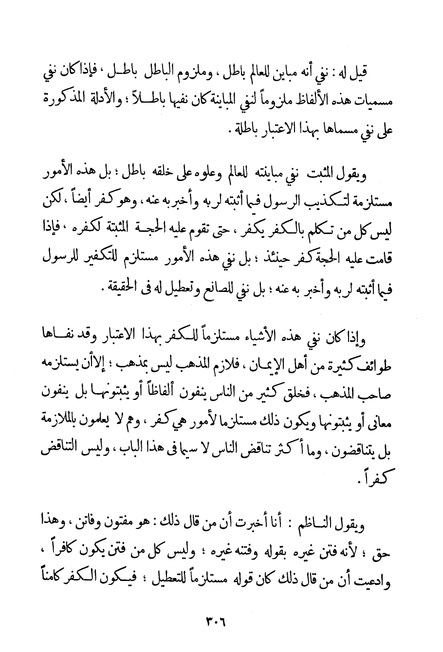 قِيلَ لَهُ: نَفْيُ أَنَّهُ مُبَايِنٌ لِلْعَالَمِ بَاطِلٌ وَمَلْزُومُ الْبَاطِلِ بَاطِلٌ فَإِذَا كَانَ نَفْيُ مُسَمَّيَاتِ هَذِهِ الْأَلْفَاظِ مَلْزُومًا لِنَفْيِ الْمُبَايَنَةِ كَانَ نَفْيُهَا بَاطِلًا؛ وَالْأَدِلَّةُ الْمَذْكُورَةُ عَلَى نَفْيِ مُسَمَّاهَا بِهَذَا الِاعْتِبَارِ بَاطِلَةٌ. وَيَقُولُ الْمُثْبِتُ نَفْيُ مُبَايَنَتِهِ لِلْعَالَمِ وَعُلُوِّهِ عَلَى خَلْقِهِ بَاطِلٌ؛ بَلْ هَذِهِ الْأُمُورُ مُسْتَلْزِمَةٌ لِتَكْذِيبِ الرَّسُولِ فِيمَا أَثْبَتَهُ لِرَبِّهِ وَأَخْبَرَ بِهِ عَنْهُ وَهُوَ كُفْرٌ أَيْضًا لَكِنْ لَيْسَ كُلُّ مَنْ تَكَلَّمَ بِالْكُفْرِ يَكْفُرُ حَتَّى تَقُومَ عَلَيْهِ الْحُجَّةُ الْمُثْبِتَةُ لِكُفْرِهِ فَإِذَا قَامَتْ عَلَيْهِ الْحُجَّةُ كَفَرَ حِينَئِذٍ؛ بَلْ نَفْيُ هَذِهِ الْأُمُورِ مُسْتَلْزِمٌ لِلتَّكْفِيرِ لِلرَّسُولِ فِيمَا أَثْبَتَهُ لِرَبِّهِ وَأَخْبَرَ بِهِ عَنْهُ؛ بَلْ نَفْيٌ لِلصَّانِعِ وَتَعْطِيلٌ لَهُ فِي الْحَقِيقَةِ. وَإِذَا كَانَ نَفْيُ هَذِهِ الْأَشْيَاءِ مُسْتَلْزِمًا لِلْكُفْرِ بِهَذَا الِاعْتِبَارِ وَقَدْ نَفَاهَا طَوَائِفُ كَثِيرَةٌ مِنْ أَهْلِ الْإِيمَانِ فَلَازِمُ الْمَذْهَبِ لَيْسَ بِمَذْهَبِ؛ إلَّا أَنْ يَسْتَلْزِمَهُ صَاحِبُ الْمَذْهَبِ فَخَلْقٌ كَثِيرٌ مِنْ النَّاسِ يَنْفُونَ أَلْفَاظًا أَوْ يُثْبِتُونَهَا بَلْ يَنْفُونَ مَعَانِيَ أَوْ يُثْبِتُونَهَا وَيَكُونُ ذَلِكَ مُسْتَلْزِمًا لِأُمُورِ هِيَ كُفْرٌ وَهُمْ لَا يَعْلَمُونَ بِالْمُلَازَمَةِ بَلْ يَتَنَاقَضُونَ وَمَا أَكْثَرَ تَنَاقُضِ النَّاسِ لَا سِيَّمَا فِي هَذَا الْبَابِ وَلَيْسَ التَّنَاقُضُ كُفْرًا. وَيَقُولُ النَّاظِمُ: أَنَا أُخْبِرْت أَنَّ مَنْ قَالَ ذَلِكَ: هُوَ مَفْتُونٌ وَفَاتِنٌ وَهَذَا حَقٌّ؛ لِأَنَّهُ فَتَنَ غَيْرَهُ بِقَوْلِهِ وَفَتَنَهُ غَيْرُهُ؛ وَلَيْسَ كُلُّ مَنْ فَتَنَ يَكُونُ كَافِرًا وَادَّعَيْت أَنَّ مَنْ قَالَ ذَلِكَ كَانَ قَوْلُهُ مُسْتَلْزِمًا لِلتَّعْطِيلِ؛ فَيَكُونُ الْكُفْرُ كَامِنًا
