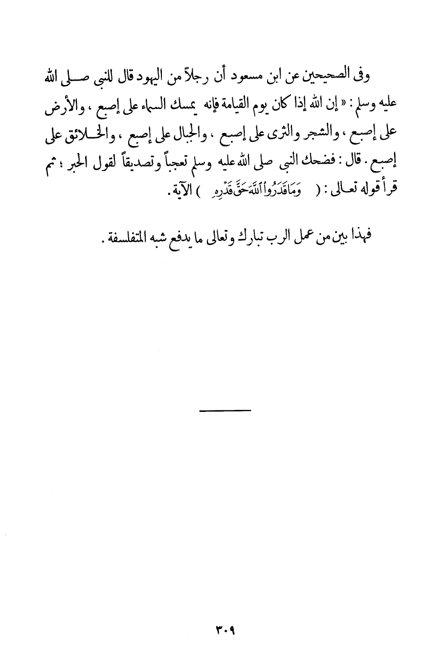 وَفِي الصَّحِيحَيْنِ عَنْ {ابْنِ مَسْعُودٍ أَنَّ رَجُلًا مِنْ الْيَهُودِ قَالَ لِلنَّبِيِّ صَلَّى اللَّهُ عَلَيْهِ وَسَلَّمَ إنَّ اللَّهَ إذَا كَانَ يَوْمُ الْقِيَامَةِ فَإِنَّهُ يُمْسِكُ السَّمَاءَ عَلَى إصْبَعٍ وَالْأَرْضَ عَلَى إصْبَعٍ وَالشَّجَرَ وَالثَّرَى عَلَى إصْبَعٍ وَالْجِبَالَ عَلَى إصْبَعٍ وَالْخَلَائِقَ عَلَى إصْبَعٍ. قَالَ: فَضَحِكَ النَّبِيُّ صَلَّى اللَّهُ عَلَيْهِ وَسَلَّمَ تَعَجُّبًا وَتَصْدِيقًا لِقَوْلِ الْحَبْرِ؛ ثُمَّ قَرَأَ قَوْله تَعَالَى {وَمَا قَدَرُوا اللَّهَ حَقَّ قَدْرِهِ} الْآيَةَ.} فَهَذَا بَيِّنٌ مِنْ عَمَلِ الرَّبِّ تَبَارَكَ وَتَعَالَى مَا يَدْفَعُ شُبَهَ الْمُتَفَلْسِفَةِ.