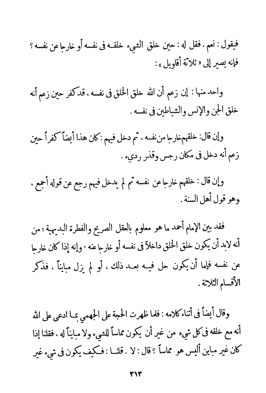 فَيَقُولُ: نَعَمْ. فَقُلْ لَهُ: حِينَ خَلَقَ الشَّيْءَ خَلَقَهُ فِي نَفْسِهِ أَوْ خَارِجًا عَنْ نَفْسِهِ؟ فَإِنَّهُ يَصِيرُ إلَى " ثَلَاثَةِ أَقَاوِيلَ ": وَاحِدٌ مِنْهَا: إنْ زَعَمَ أَنَّ اللَّهَ خَلَقَ الْخَلْقَ فِي نَفْسِهِ قَدْ كَفَرَ حِينَ زَعَمَ أَنَّهُ خَلَقَ الْجِنَّ وَالْإِنْسَ وَالشَّيَاطِينَ فِي نَفْسِهِ. وَإِنْ قَالَ: خَلَقَهُمْ خَارِجًا مِنْ نَفْسِهِ ثُمَّ دَخَلَ فِيهِمْ: كَانَ هَذَا أَيْضًا كُفْرًا حِينَ زَعَمَ أَنَّهُ دَخَلَ فِي مَكَانٍ رِجْسٍ وَقَذِرٍ رَدِيءٍ. وَإِنْ قَالَ: خَلَقَهُمْ خَارِجًا عَنْ نَفْسِهِ ثُمَّ لَمْ يَدْخُلْ فِيهِمْ رَجَعَ عَنْ قَوْلِهِ أَجْمَعَ وَهُوَ قَوْلُ أَهْلِ السُّنَّةِ. فَقَدْ بَيَّنَ الْإِمَامُ أَحْمَد مَا هُوَ مَعْلُومٌ بِالْعَقْلِ الصَّرِيحِ وَالْفِطْرَةِ الْبَدِيهِيَّةِ؛ مِنْ أَنَّهُ لَا بُدَّ أَنْ يَكُونَ خَلْقُ الْخَلْقِ دَاخِلًا فِي نَفْسِهِ أَوْ خَارِجًا عَنْهُ وَأَنَّهُ إذَا كَانَ خَارِجًا عَنْ نَفْسِهِ فَإِمَّا أَنْ يَكُونَ حَلَّ فِيهِ بَعْدَ ذَلِكَ أَوْ لَمْ يَزَلْ مُبَايِنًا فَذَكَرَ الْأَقْسَامَ الثَّلَاثَةَ. وَقَالَ أَيْضًا فِي أَثْنَاءِ كَلَامِهِ: فَلَمَّا ظَهَرَتْ الْحُجَّةُ عَلَى الجهمي بِمَا ادَّعَى عَلَى اللَّهِ أَنَّهُ مَعَ خَلْقِهِ فِي كُلِّ شَيْءٍ مِنْ غَيْرِ أَنْ يَكُونَ مُمَاسًّا لِلشَّيْءِ وَلَا مُبَايِنًا لَهُ فَقُلْنَا إذَا كَانَ غَيْرَ مُبَايِنٍ أَلَيْسَ هُوَ مُمَاسًّا؟ قَالَ: لَا. قُلْنَا: فَكَيْفَ يَكُونُ فِي شَيْءٍ غَيْرِ
