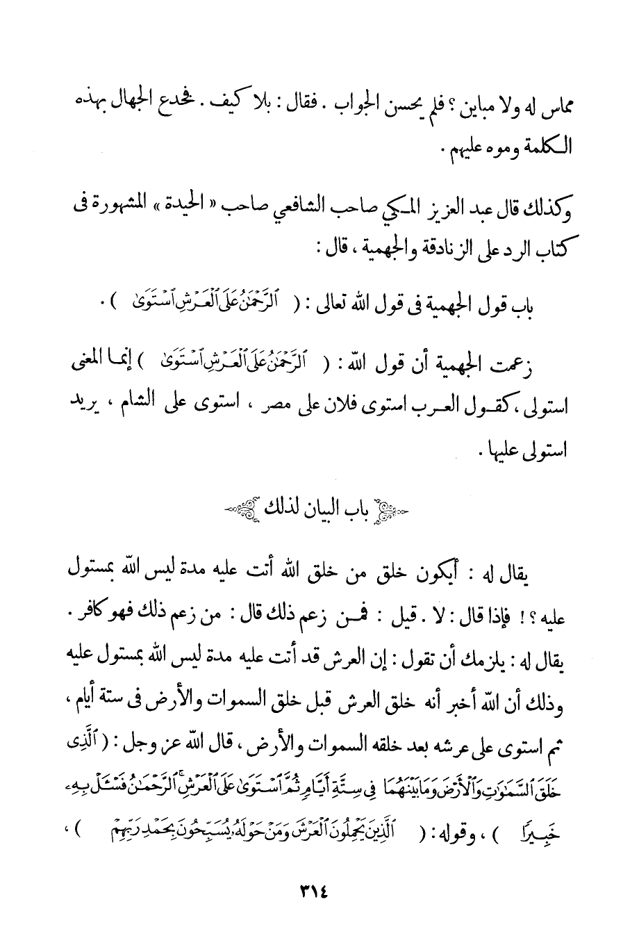 مُمَاسٍّ لَهُ وَلَا مُبَايِنٍ؟ فَلَمْ يُحْسِنْ الْجَوَابَ. فَقَالَ: بِلَا كَيْفٍ. فَخَدَعَ الْجُهَّالَ بِهَذِهِ الْكَلِمَةِ وَمَوَّهَ عَلَيْهِمْ. وَكَذَلِكَ قَالَ عَبْدُ الْعَزِيزِ الْمَكِّيُّ صَاحِبُ الشَّافِعِيِّ صَاحِبُ " الْحَيْدَةِ " الْمَشْهُورَةِ فِي كِتَابِ الرَّدِّ عَلَى الزَّنَادِقَةِ وَالْجَهْمِيَّة قَالَ: بَابُ قَوْلِ الْجَهْمِيَّة فِي قَوْلِ اللَّهِ تَعَالَى: {الرَّحْمَنُ عَلَى الْعَرْشِ اسْتَوَى} . زَعَمَتْ الْجَهْمِيَّة أَنَّ قَوْلَ اللَّهِ: {الرَّحْمَنُ عَلَى الْعَرْشِ اسْتَوَى} إنَّمَا الْمَعْنَى اسْتَوْلَى كَقَوْلِ الْعَرَبِ اسْتَوَى فُلَانٌ عَلَى مِصْرَ اسْتَوَى عَلَى الشَّامِ يُرِيدُ اسْتَوْلَى عَلَيْهَا.