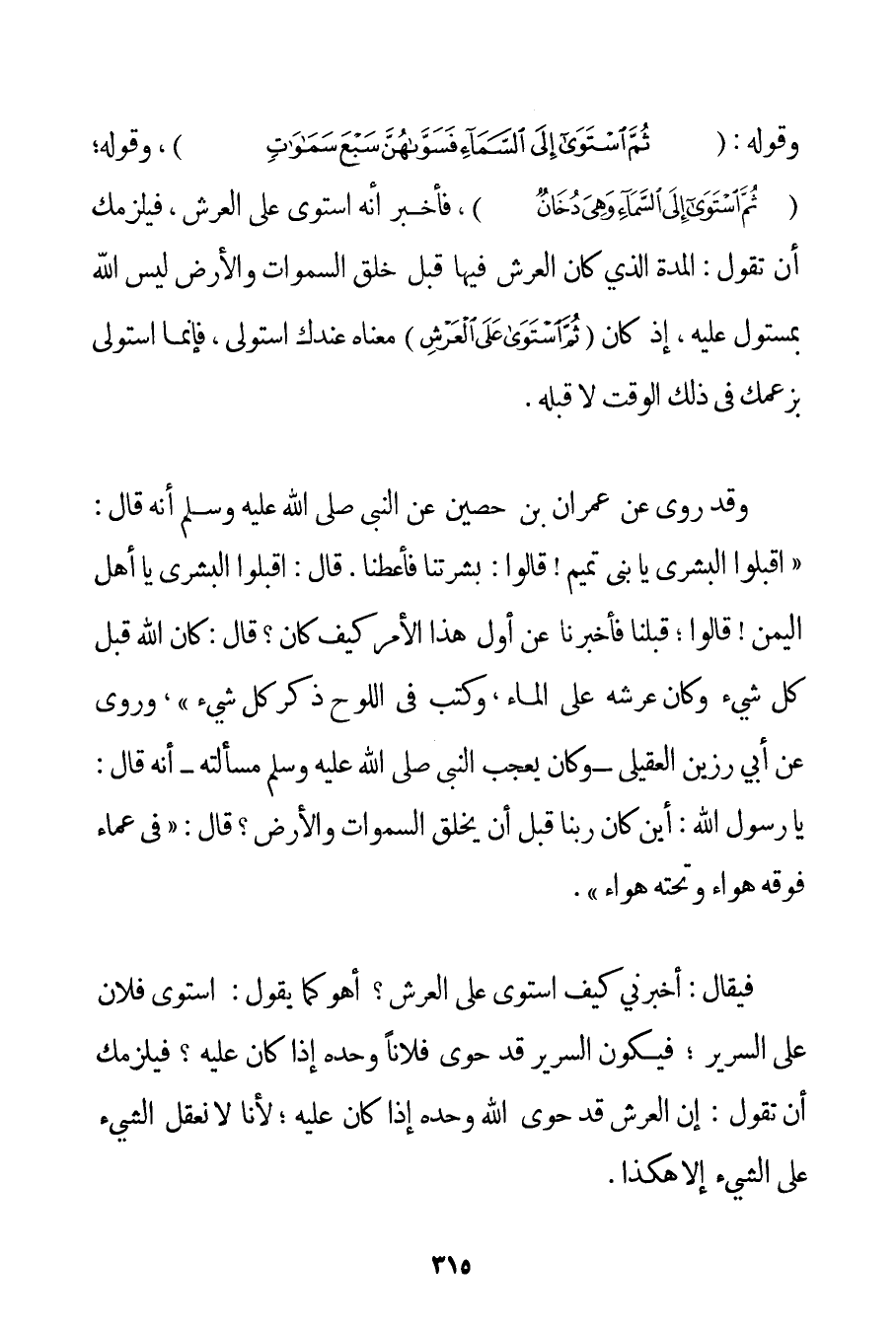 بِحَمْدِ رَبِّهِمْ} وَقَوْلُهُ: {ثُمَّ اسْتَوَى إلَى السَّمَاءِ فَسَوَّاهُنَّ سَبْعَ سَمَاوَاتٍ} وَقَوْلُهُ؛ {ثُمَّ اسْتَوَى إلَى السَّمَاءِ وَهِيَ دُخَانٌ} فَأَخْبَرَ أَنَّهُ اسْتَوَى عَلَى الْعَرْشِ فَيَلْزَمُك أَنْ تَقُولَ: الْمُدَّةُ الَّذِي كَانَ الْعَرْشُ فِيهَا قَبْلَ خَلْقِ السَّمَوَاتِ وَالْأَرْضِ لَيْسَ اللَّهُ بِمُسْتَوْلٍ عَلَيْهِ إذْ كَانَ {ثُمَّ اسْتَوَى عَلَى الْعَرْشِ} مَعْنَاهُ عِنْدَك اسْتَوْلَى فَإِنَّمَا اسْتَوْلَى بِزَعْمِك فِي ذَلِكَ الْوَقْتِ لَا قَبْلَهُ. وَقَدْ رُوِيَ عَنْ عِمْرَانَ بْنِ حُصَيْنٍ عَنْ النَّبِيِّ صَلَّى اللَّهُ عَلَيْهِ وَسَلَّمَ أَنَّهُ قَالَ: {اقْبَلُوا الْبُشْرَى يَا بَنِي تَمِيمٍ قَالُوا: بَشَّرْتنَا فَأَعْطِنَا. قَالَ: اقْبَلُوا الْبُشْرَى يَا أَهْلَ الْيَمَنِ قَالُوا؛ قَبِلْنَا فَأَخْبِرْنَا عَنْ أَوَّلِ هَذَا الْأَمْرِ كَيْفَ كَانَ؟ قَالَ: كَانَ اللَّهُ قَبْلَ كُلِّ شَيْءٍ وَكَانَ عَرْشُهُ عَلَى الْمَاءِ وَكَتَبَ فِي اللَّوْحِ ذِكْرَ كُلِّ شَيْءٍ} " وَرُوِيَ عَنْ {أَبِي رَزِينٍ العقيلي - وَكَانَ يُعْجِبُ النَّبِيَّ صَلَّى اللَّهُ عَلَيْهِ وَسَلَّمَ مَسْأَلَتُهُ - أَنَّهُ قَالَ: يَا رَسُولَ اللَّهِ: أَيْنَ كَانَ رَبُّنَا قَبْلَ أَنْ يَخْلُقَ السَّمَوَاتِ وَالْأَرْضَ؟ قَالَ: فِي عَمَاءٍ فَوْقَهُ هَوَاءٌ وَتَحْتَهُ هَوَاءٌ} . فَيُقَالُ: أَخْبِرْنِي كَيْفَ اسْتَوَى عَلَى الْعَرْشِ؟ أَهُوَ كَمَا يَقُولُ: اسْتَوَى فُلَانٌ عَلَى السَّرِيرِ؛ فَيَكُونُ السَّرِيرُ قَدْ حَوَى فُلَانًا وَحْدَهُ إذَا كَانَ عَلَيْهِ؟ فَيَلْزَمُك أَنْ تَقُولَ: إنَّ الْعَرْشَ قَدْ حَوَى اللَّهَ وَحْدَهُ إذَا كَانَ عَلَيْهِ؛ لِأَنَّا لَا نَعْقِلُ الشَّيْءَ عَلَى الشَّيْءِ إلَّا هَكَذَا.