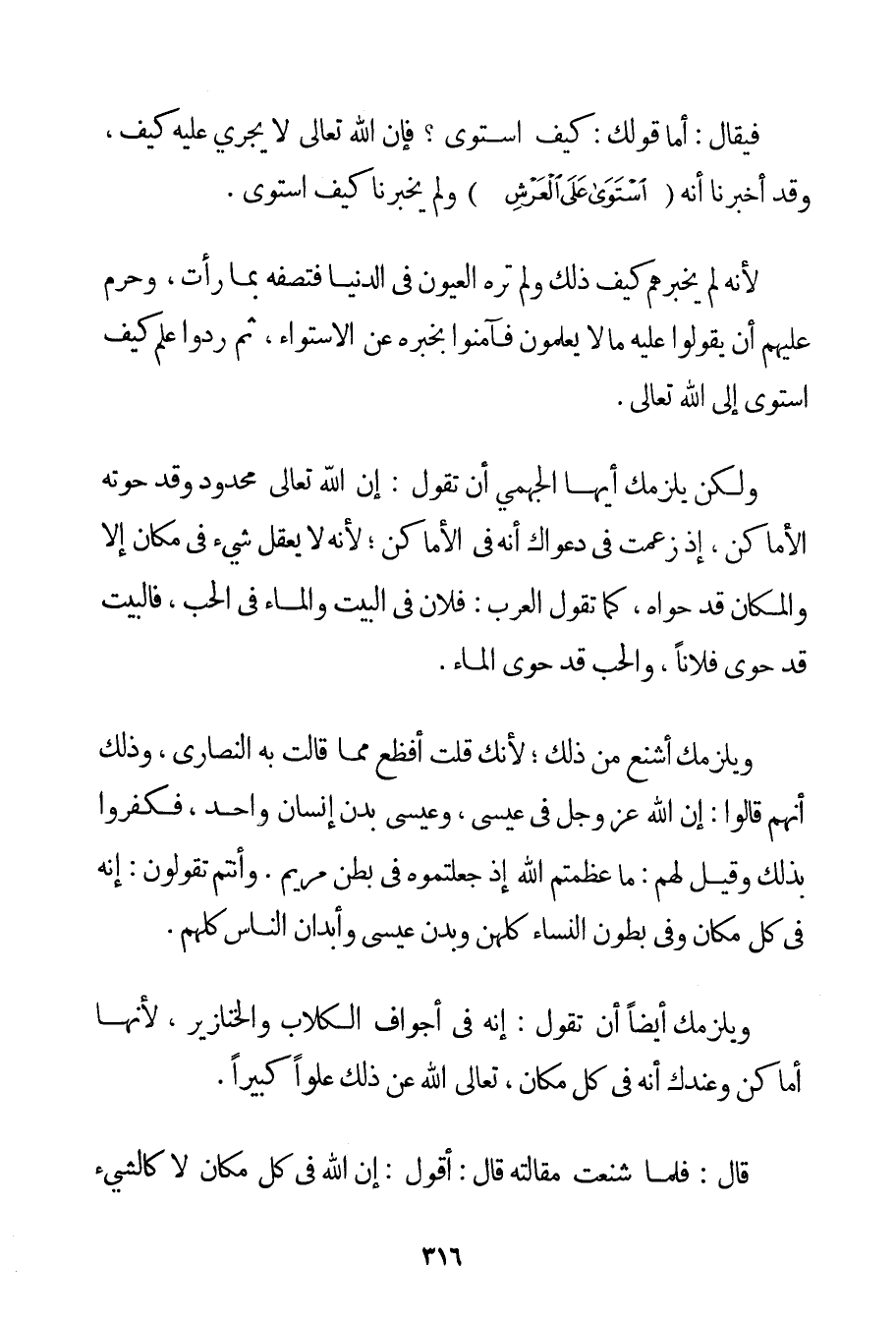 فَيُقَالُ: أَمَّا قَوْلُك: كَيْفَ اسْتَوَى؟ فَإِنَّ اللَّهَ تَعَالَى لَا يَجْرِي عَلَيْهِ كَيْفَ وَقَدْ أَخْبَرَنَا أَنَّهُ {اسْتَوَى عَلَى الْعَرْشِ} وَلَمْ يُخْبِرْنَا كَيْفَ اسْتَوَى. لِأَنَّهُ لَمْ يُخْبِرْهُمْ كَيْفَ ذَلِكَ وَلَمْ تَرَهُ الْعُيُونُ فِي الدُّنْيَا فَتَصِفُهُ بِمَا رَأَتْ وَحَرُمَ عَلَيْهِمْ أَنْ يَقُولُوا عَلَيْهِ مَا لَا يَعْلَمُونَ فَآمَنُوا بِخَبَرِهِ عَنْ الِاسْتِوَاءِ ثُمَّ رَدُّوا عِلْمَ كَيْفَ اسْتَوَى إلَى اللَّهِ تَعَالَى. وَلَكِنْ يَلْزَمُك أَيُّهَا الجهمي أَنْ تَقُولَ: إنَّ اللَّهَ تَعَالَى مَحْدُودٌ وَقَدْ حَوَتْهُ الْأَمَاكِنُ إذْ زَعَمْت فِي دَعْوَاك أَنَّهُ فِي الْأَمَاكِنِ؛ لِأَنَّهُ لَا يُعْقَلُ شَيْءٌ فِي مَكَانٍ إلَّا وَالْمَكَانُ قَدْ حَوَاهُ كَمَا تَقُولُ الْعَرَبُ: فُلَانٌ فِي الْبَيْتِ وَالْمَاءُ فِي الْجُبِّ فَالْبَيْتُ قَدْ حَوَى فُلَانًا وَالْجُبُّ قَدْ حَوَى الْمَاءَ. وَيَلْزَمُك أَشْنَعُ مِنْ ذَلِكَ؛ لِأَنَّك قُلْت أَفْظَعَ مِمَّا قَالَتْ بِهِ النَّصَارَى وَذَلِكَ أَنَّهُمْ قَالُوا: إنَّ اللَّهَ عَزَّ وَجَلَّ فِي عِيسَى وَعِيسَى بَدَنُ إنْسَانٍ وَاحِدٍ فَكَفَرُوا بِذَلِكَ وَقِيلَ لَهُمْ: مَا عَظَّمْتُمْ اللَّهَ إذْ جَعَلْتُمُوهُ فِي بَطْنِ مَرْيَمَ. وَأَنْتُمْ تَقُولُونَ: إنَّهُ فِي كُلِّ مَكَانٍ وَفِي بُطُونِ النِّسَاءِ كُلِّهِنَّ وَبَدَنِ عِيسَى وَأَبْدَانِ النَّاسِ كُلِّهِمْ. وَيَلْزَمُك أَيْضًا أَنْ تَقُولَ: إنَّهُ فِي أَجْوَافِ الْكِلَابِ وَالْخَنَازِيرِ لِأَنَّهَا أَمَاكِنُ وَعِنْدَك أَنَّهُ فِي كُلِّ مَكَانٍ تَعَالَى اللَّهُ عَنْ ذَلِكَ عُلُوًّا كَبِيرًا. قَالَ: فَلَمَّا شَنَّعْت مَقَالَتَهُ قَالَ: أَقُولُ: إنَّ اللَّهَ فِي كُلِّ مَكَانٍ لَا كَالشَّيْءِ