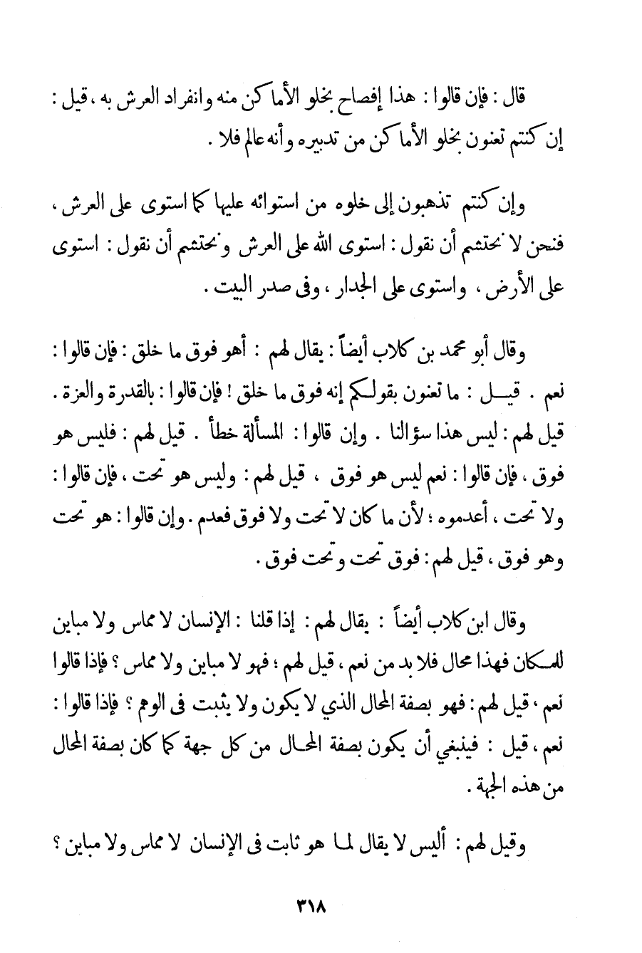 قَالَ: فَإِنْ قَالُوا: هَذَا إفْصَاحٌ بِخُلُوِّ الْأَمَاكِنِ مِنْهُ وَانْفِرَادِ الْعَرْشِ بِهِ قِيلَ: إنْ كُنْتُمْ تَعْنُونَ بِخُلُوِّ الْأَمَاكِنِ مِنْ تَدْبِيرِهِ وَأَنَّهُ عَالِمٌ فَلَا. وَإِنْ كُنْتُمْ تَذْهَبُونَ إلَى خُلُوِّهِ مِنْ اسْتِوَائِهِ عَلَيْهَا كَمَا اسْتَوَى عَلَى الْعَرْشِ فَنَحْنُ لَا نَحْتَشِمُ أَنْ نَقُولَ: اسْتَوَى اللَّهُ عَلَى الْعَرْشِ وَنَحْتَشِمُ أَنْ نَقُولَ: اسْتَوَى عَلَى الْأَرْضِ وَاسْتَوَى عَلَى الْجِدَارِ وَفِي صَدْرِ الْبَيْتِ. وَقَالَ أَبُو مُحَمَّدِ بْنُ كُلَّابٍ أَيْضًا: يُقَالُ لَهُمْ: أَهُوَ فَوْقَ مَا خَلَقَ: فَإِنْ قَالُوا: نَعَمْ. قِيلَ: مَا تَعْنُونَ بِقَوْلِكُمْ إنَّهُ فَوْقَ مَا خَلَقَ فَإِنْ قَالُوا: بِالْقُدْرَةِ وَالْعِزَّةِ. قِيلَ لَهُمْ: لَيْسَ هَذَا سُؤَالُنَا. وَإِنْ قَالُوا: الْمَسْأَلَةُ خَطَأٌ. قِيلَ لَهُمْ: فَلَيْسَ هُوَ فَوْقُ فَإِنْ قَالُوا: نَعَمْ لَيْسَ هُوَ فَوْقُ قِيلَ لَهُمْ: وَلَيْسَ هُوَ تَحْتُ فَإِنْ قَالُوا: وَلَا تَحْتُ أَعْدَمُوهُ؛ لِأَنَّ مَا كَانَ لَا تَحْتُ وَلَا فَوْقُ فَعَدَمٌ. وَإِنْ قَالُوا: هُوَ تَحْتُ وَهُوَ فَوْقُ قِيلَ لَهُمْ: فَوْقُ تَحْتُ وَتَحْتُ فَوْقُ. وَقَالَ ابْنُ كُلَّابٍ أَيْضًا: يُقَالُ لَهُمْ: إذَا قُلْنَا: الْإِنْسَانُ لَا مُمَاسَّ وَلَا مُبَايِنَ لِلْمَكَانِ فَهَذَا مُحَالٌ فَلَا بُدَّ مِنْ نَعَمْ قِيلَ لَهُمْ. فَهُوَ لَا مُبَايِنٌ وَلَا مُمَاسٌّ؟ فَإِذَا قَالُوا نَعَمْ قِيلَ لَهُمْ: فَهُوَ بِصِفَةِ الْمُحَالِ الَّذِي لَا يَكُونُ وَلَا يَثْبُتُ فِي الْوَهْمِ؟ فَإِذَا قَالُوا: نَعَمْ قِيلَ: فَيَنْبَغِي أَنْ يَكُونَ بِصِفَةِ الْمُحَالِ مِنْ كُلِّ جِهَةٍ كَمَا كَانَ بِصِفَةِ الْمُحَالِ مِنْ هَذِهِ الْجِهَةِ. وَقِيلَ لَهُمْ: أَلَيْسَ لَا يُقَالُ لِمَا هُوَ ثَابِتٌ فِي الْإِنْسَانِ لَا مُمَاسَّ وَلَا مُبَايِنَ؟