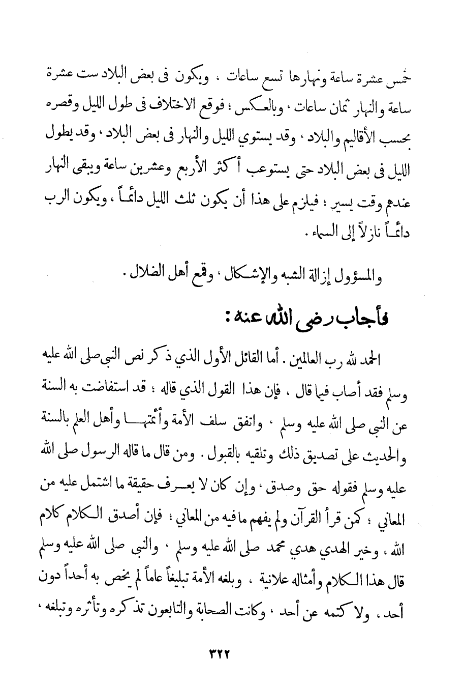 خَمْسَ عَشْرَةَ سَاعَةً وَنَهَارُهَا تِسْعَ سَاعَاتٍ وَيَكُونُ فِي بَعْضِ الْبِلَادِ سِتَّ عَشْرَةَ سَاعَةً وَالنَّهَارُ ثَمَانِ سَاعَاتٍ وَبِالْعَكْسِ؛ فَوَقَعَ الِاخْتِلَافُ فِي طُولِ اللَّيْلِ وَقِصَرِهِ بِحَسَبِ الْأَقَالِيمِ وَالْبِلَادِ وَقَدْ يَسْتَوِي اللَّيْلُ وَالنَّهَارُ فِي بَعْضِ الْبِلَادِ وَقَدْ يَطُولُ اللَّيْلُ فِي بَعْضِ الْبِلَادِ حَتَّى يَسْتَوْعِبَ أَكْثَرَ الْأَرْبَعِ وَعِشْرِينَ سَاعَةً وَيَبْقَى النَّهَارُ عِنْدَهُمْ وَقْتٌ يَسِيرٌ؛ فَيَلْزَمُ عَلَى هَذَا أَنْ يَكُونَ ثُلُثُ اللَّيْلِ دَائِمًا وَيَكُونُ الرَّبُّ دَائِمًا نَازِلًا إلَى السَّمَاءِ. وَالْمَسْئُولُ إزَالَةُ الشُّبَهِ وَالْإِشْكَالِ وَقَمْعِ أَهْلِ الضَّلَالِ.