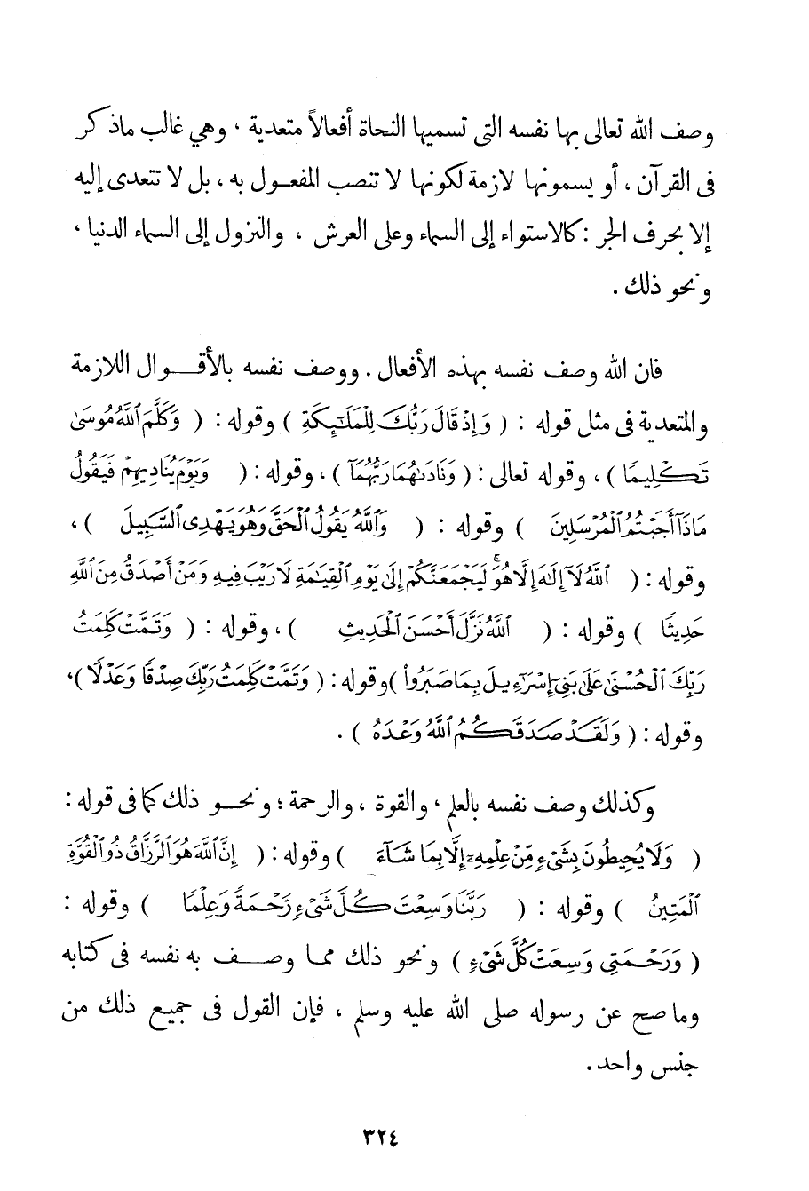 وَصَفَ اللَّهُ تَعَالَى بِهَا نَفْسَهُ الَّتِي تُسَمِّيهَا النُّحَاةُ أَفْعَالًا مُتَعَدِّيَةً وَهِيَ غَالِبُ مَا ذَكَرَ فِي الْقُرْآنِ أَوْ يُسَمُّونَهَا لَازِمَةً لِكَوْنِهَا لَا تَنْصِبُ الْمَفْعُولَ بِهِ بَلْ لَا تَتَعَدَّى إلَيْهِ إلَّا بِحَرْفِ الْجَرِّ: كَالِاسْتِوَاءِ إلَى السَّمَاءِ وَعَلَى الْعَرْشِ وَالنُّزُولِ إلَى السَّمَاءِ الدُّنْيَا وَنَحْوِ ذَلِكَ. فَإِنَّ اللَّهَ وَصَفَ نَفْسَهُ بِهَذِهِ الْأَفْعَالِ. وَوَصَفَ نَفْسَهُ بِالْأَقْوَالِ اللَّازِمَةِ وَالْمُتَعَدِّيَةِ فِي مِثْلِ قَوْلِهِ: {وَإِذْ قَالَ رَبُّكَ لِلْمَلَائِكَةِ} وَقَوْلِهِ: {وَكَلَّمَ اللَّهُ مُوسَى تَكْلِيمًا} وقَوْله تَعَالَى {وَنَادَاهُمَا رَبُّهُمَا} وَقَوْلِهِ: {وَيَوْمَ يُنَادِيهِمْ فَيَقُولُ مَاذَا أَجَبْتُمُ الْمُرْسَلِينَ} وَقَوْلِهِ: {وَاللَّهُ يَقُولُ الْحَقَّ وَهُوَ يَهْدِي السَّبِيلَ} وَقَوْلِهِ: {اللَّهُ لَا إلَهَ إلَّا هُوَ لَيَجْمَعَنَّكُمْ إلَى يَوْمِ الْقِيَامَةِ لَا رَيْبَ فِيهِ وَمَنْ أَصْدَقُ مِنَ اللَّهِ حَدِيثًا} وَقَوْلِهِ: {اللَّهُ نَزَّلَ أَحْسَنَ الْحَدِيثِ} وَقَوْلِهِ: {وَتَمَّتْ كَلِمَةُ رَبِّكَ الْحُسْنَى عَلَى بَنِي إسْرَائِيلَ بِمَا صَبَرُوا} وَقَوْلِهِ: {وَتَمَّتْ كَلِمَةُ رَبِّكَ صِدْقًا وَعَدْلًا} وَقَوْلِهِ: {وَلَقَدْ صَدَقَكُمُ اللَّهُ وَعْدَهُ} . وَكَذَلِكَ وَصَفَ نَفْسَهُ بِالْعِلْمِ وَالْقُوَّةِ وَالرَّحْمَةِ؛ وَنَحْوِ ذَلِكَ كَمَا فِي قَوْلِهِ: {وَلَا يُحِيطُونَ بِشَيْءٍ مِنْ عِلْمِهِ إلَّا بِمَا شَاءَ} وَقَوْلِهِ: {إنَّ اللَّهَ هُوَ الرَّزَّاقُ ذُو الْقُوَّةِ الْمَتِينُ} وَقَوْلِهِ: {رَبَّنَا وَسِعْتَ كُلَّ شَيْءٍ رَحْمَةً وَعِلْمًا} وَقَوْلِهِ: {وَرَحْمَتِي وَسِعَتْ كُلَّ شَيْءٍ} وَنَحْوِ ذَلِكَ مِمَّا وَصَفَ بِهِ نَفْسَهُ فِي كِتَابِهِ وَمَا صَحَّ عَنْ رَسُولِهِ صَلَّى اللَّهُ عَلَيْهِ وَسَلَّمَ فَإِنَّ الْقَوْلَ فِي جَمِيعِ ذَلِكَ مِنْ جِنْسٍ وَاحِدٍ.