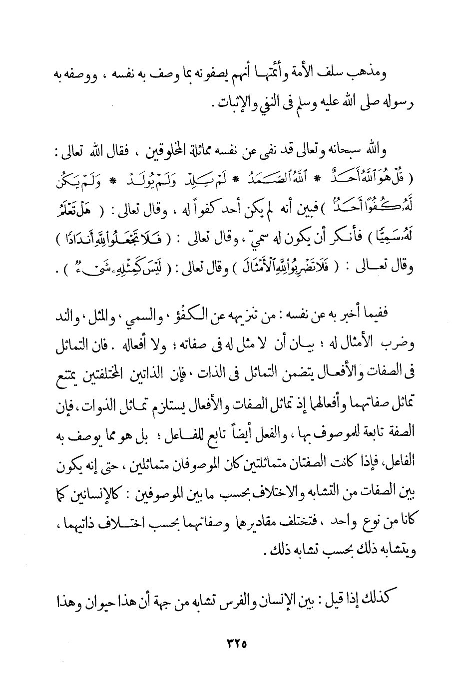 وَمَذْهَبُ سَلَفِ الْأُمَّةِ وَأَئِمَّتِهَا أَنَّهُمْ يَصِفُونَهُ بِمَا وَصَفَ بِهِ نَفْسَهُ وَوَصَفَهُ بِهِ رَسُولُهُ صَلَّى اللَّهُ عَلَيْهِ وَسَلَّمَ فِي النَّفْيِ وَالْإِثْبَاتِ. وَاَللَّهُ سُبْحَانَهُ وَتَعَالَى قَدْ نَفَى عَنْ نَفْسِهِ مُمَاثَلَةَ الْمَخْلُوقِينَ فَقَالَ اللَّهُ تَعَالَى: {قُلْ هُوَ اللَّهُ أَحَدٌ} {اللَّهُ الصَّمَدُ} {لَمْ يَلِدْ وَلَمْ يُولَدْ} {وَلَمْ يَكُنْ لَهُ كُفُوًا أَحَدٌ} فَبَيَّنَ أَنَّهُ لَمْ يَكُنْ أَحَدٌ كُفُوًا لَهُ وَقَالَ تَعَالَى: {هَلْ تَعْلَمُ لَهُ سَمِيًّا} فَأَنْكَرَ أَنْ يَكُونَ لَهُ سَمِيٌّ وَقَالَ تَعَالَى: {فَلَا تَجْعَلُوا لِلَّهِ أَنْدَادًا} وَقَالَ تَعَالَى: {فَلَا تَضْرِبُوا لِلَّهِ الْأَمْثَالَ} وَقَالَ تَعَالَى: {لَيْسَ كَمِثْلِهِ شَيْءٌ} . فَفِيمَا أَخْبَرَ بِهِ عَنْ نَفْسِهِ: مِنْ تَنْزِيهِهِ عَنْ الْكُفُؤِ وَالسَّمِيِّ وَالْمِثْلِ وَالنِّدِّ وَضَرْبِ الْأَمْثَالِ لَهُ؛ بَيَانُ أَنْ لَا مِثْلَ لَهُ فِي صِفَاتِهِ؛ وَلَا أَفْعَالِهِ؛ فَإِنَّ التَّمَاثُلَ فِي الصِّفَاتِ وَالْأَفْعَالِ يَتَضَمَّنُ التَّمَاثُلَ فِي الذَّاتِ فَإِنَّ الذَّاتَيْنِ المختلفتين يَمْتَنِعُ تَمَاثُلُ صِفَاتِهِمَا وَأَفْعَالِهِمَا إذْ تَمَاثُلُ الصِّفَاتِ وَالْأَفْعَالِ يَسْتَلْزِمُ تَمَاثُلَ الذَّوَاتِ فَإِنَّ الصِّفَةَ تَابِعَةٌ لِلْمَوْصُوفِ بِهَا وَالْفِعْلُ أَيْضًا تَابِعٌ لِلْفَاعِلِ؛ بَلْ هُوَ مِمَّا يُوصَفُ بِهِ الْفَاعِلُ فَإِذَا كَانَتْ الصِّفَتَانِ مُتَمَاثِلَتَيْنِ كَانَ الْمَوْصُوفَانِ مُتَمَاثِلَيْنِ حَتَّى إنَّهُ يَكُونُ بَيْنَ الصِّفَاتِ مِنْ التَّشَابُهِ وَالِاخْتِلَافِ بِحَسَبِ مَا بَيْنَ الْمَوْصُوفَيْنِ: كَالْإِنْسَانَيْنِ كَمَا كَانَا مِنْ نَوْعٍ وَاحِدٍ فَتَخْتَلِفُ مَقَادِيرُهُمَا وَصِفَاتُهُمَا بِحَسَبِ اخْتِلَافِ ذَاتَيْهِمَا وَيَتَشَابَهُ ذَلِكَ بِحَسَبِ تَشَابُهِ ذَلِكَ. كَذَلِكَ إذَا قِيلَ: بَيْنَ الْإِنْسَانِ وَالْفَرَس تَشَابُهٌ مِنْ جِهَةِ أَنَّ هَذَا حَيَوَانٌ وَهَذَا