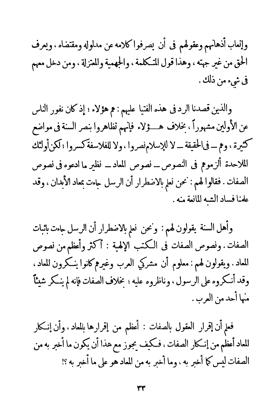 وَإِتْعَابُ أَذْهَانِهِمْ وَعُقُولِهِمْ فِي أَنْ يَصْرِفُوا كَلَامَهُ عَنْ مَدْلُولِهِ وَمُقْتَضَاهُ وَيَعْرِفُ الْحَقَّ مِنْ غَيْرِ جِهَتِهِ وَهَذَا قَوْلُ الْمُتَكَلِّمَةِ وَالْجَهْمِيَّة وَالْمُعْتَزِلَةِ وَمَنْ دَخَلَ مَعَهُمْ فِي شَيْءٍ مِنْ ذَلِكَ. وَاَلَّذِينَ قَصَدْنَا الرَّدَّ فِي هَذِهِ الْفُتْيَا عَلَيْهِمْ: هُمْ هَؤُلَاءِ؛ إذْ كَانَ نُفُورُ النَّاسِ عَنْ الْأَوَّلِينَ مَشْهُورًا بِخِلَافِ هَؤُلَاءِ فَإِنَّهُمْ تَظَاهَرُوا بِنَصْرِ السُّنَّةِ فِي مَوَاضِعَ كَثِيرَةٍ وَهُمْ - فِي الْحَقِيقَةِ - لَا لِلْإِسْلَامِ نَصَرُوا وَلَا لِلْفَلَاسِفَةِ كَسَرُوا؛ لَكِنَّ أُولَئِكَ الْمَلَاحِدَةَ أَلْزَمُوهُمْ فِي النُّصُوصِ - نُصُوصِ الْمَعَادِ - نَظِيرَ مَا ادَّعُوهُ فِي نُصُوصِ الصِّفَاتِ. فَقَالُوا لَهُمْ: نَحْنُ نَعْلَمُ بِالِاضْطِرَارِ أَنَّ الرُّسُلَ جَاءَتْ بِمَعَادِ الْأَبْدَانِ وَقَدْ عَلِمْنَا فَسَادَ الشُّبَهِ الْمَانِعَةِ مِنْهُ. وَأَهْلُ السُّنَّةِ يَقُولُونَ لَهُمْ: وَنَحْنُ نَعْلَمُ بِالِاضْطِرَارِ أَنَّ الرُّسُلَ جَاءَتْ بِإِثْبَاتِ الصِّفَاتِ. وَنُصُوصُ الصِّفَاتِ فِي الْكُتُبِ الْإِلَهِيَّةِ: أَكْثَرُ وَأَعْظَمُ مِنْ نُصُوصِ الْمَعَادِ. وَيَقُولُونَ لَهُمْ: مَعْلُومٌ أَنَّ مُشْرِكِي الْعَرَبِ وَغَيْرِهِمْ كَانُوا يُنْكِرُونَ الْمَعَادَ وَقَدْ أَنْكَرُوهُ عَلَى الرَّسُولِ وَنَاظَرُوهُ عَلَيْهِ؛ بِخِلَافِ الصِّفَاتِ فَإِنَّهُ لَمْ يُنْكِرْ شَيْئًا مِنْهَا أَحَدٌ مِنْ الْعَرَبِ. فَعُلِمَ أَنَّ إقْرَارَ الْعُقُولِ بِالصِّفَاتِ: أَعْظَمُ مِنْ إقْرَارِهَا بِالْمَعَادِ وَأَنَّ إنْكَارَ الْمَعَادِ أَعْظَمُ مِنْ إنْكَارِ الصِّفَاتِ فَكَيْفَ يَجُوزُ مَعَ هَذَا أَنْ يَكُونَ مَا أَخْبَرَ بِهِ مِنْ الصِّفَاتِ لَيْسَ كَمَا أَخْبَرَ بِهِ وَمَا أَخْبَرَ بِهِ مِنْ الْمَعَادِ هُوَ عَلَى مَا أَخْبَرَ بِهِ