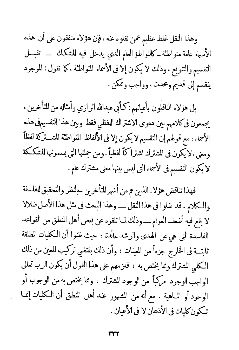 وَهَذَا النَّقْلُ غَلَطٌ عَظِيمٌ عَمَّنْ نَقَلُوهُ عَنْهُ فَإِنَّ هَؤُلَاءِ مُتَّفِقُونَ عَلَى أَنَّ هَذِهِ الْأَسْمَاءَ عَامَّةٌ مُتَوَاطِئَةٌ - كَالتَّوَاطُؤِ الْعَامِّ الَّذِي يَدْخُلُ فِيهِ الْمُشَكِّكُ - تَقْبَلُ التَّقْسِيمَ وَالتَّنْوِيعَ وَذَلِكَ لَا يَكُونُ إلَّا فِي الْأَسْمَاءِ الْمُتَوَاطِئَةِ كَمَا نَقُولُ: الْمَوْجُودُ يَنْقَسِمُ إلَى قَدِيمٍ وَمُحْدَثٍ وَوَاجِبٍ وَمُمْكِنٍ. بَلْ هَؤُلَاءِ النَّاقِلُونَ بِأَعْيَانِهِمْ: كَأَبِي عَبْدِ اللَّهِ الرَّازِي وَأَمْثَالِهِ مِنْ الْمُتَأَخِّرِينَ يَجْمَعُونَ فِي كَلَامِهِمْ بَيْنَ دَعْوَى الِاشْتِرَاكِ اللَّفْظِيِّ فَقَطْ وَبَيْنَ هَذَا التَّقْسِيمِ فِي هَذِهِ الْأَسْمَاءِ؛ مَعَ قَوْلِهِمْ إنَّ التَّقْسِيمَ لَا يَكُونُ إلَّا فِي الْأَلْفَاظِ الْمُتَوَاطِئَةِ الْمُشْتَرَكَةِ لَفْظًا وَمَعْنًى لَا يَكُونُ فِي الْمُشْتَرَكِ اشْتِرَاكًا لَفْظِيًّا. وَمِنْ جُمْلَتِهَا الَّتِي يُسَمُّونَهَا الْمُشَكِّكَةَ لَا يَكُونُ التَّقْسِيمُ فِي الْأَسْمَاءِ الَّتِي لَيْسَ بَيْنَهَا مَعْنًى مُشْتَرَكٌ عَامٌّ. فَهَذَا تَنَاقُضُ هَؤُلَاءِ الَّذِينَ هُمْ مِنْ أَشْهَرِ الْمُتَأَخِّرِينَ - بِالنَّظَرِ وَالتَّحْقِيقِ لِلْفَلْسَفَةِ وَالْكَلَامِ قَدْ ضَلُّوا فِي هَذَا النَّقْلِ - وَهَذَا الْبَحْثُ فِي مِثْلِ هَذَا الْأَصْلِ ضَلَالٌ لَا يَقَعُ فِيهِ أَضْعَفُ الْعَوَامِّ - وَذَلِكَ لِمَا تَلَقَّوْهُ عَنْ بَعْضِ أَهْلِ الْمَنْطِقِ مِنْ الْقَوَاعِدِ الْفَاسِدَةِ الَّتِي هِيَ عَنْ الْهُدَى وَالرُّشْدِ حَائِدَةٌ؛ حَيْثُ ظَنُّوا أَنَّ الْكُلِّيَّاتِ الْمُطْلَقَةَ ثَابِتَةٌ فِي الْخَارِجِ جُزْءًا مِنْ الْمُعَيَّنَاتِ؛ وَأَنَّ ذَلِكَ يَقْتَضِي تَرْكِيبَ الْمُعَيَّنِ مِنْ ذَلِكَ الْكُلِّيِّ الْمُشْتَرَكِ وَمِمَّا يَخْتَصُّ بِهِ؛ فَلَزِمَهُمْ عَلَى هَذَا الْقَوْلِ أَنْ يَكُونَ الرَّبُّ تَعَالَى الْوَاجِبُ الْوُجُودِ مُرَكَّبًا مِنْ الْوُجُودِ الْمُشْتَرَكِ وَمِمَّا يَخْتَصُّ بِهِ مِنْ الْوُجُوبِ أَوْ الْوُجُودِ أَوْ الْمَاهِيَّةِ. مَعَ أَنَّهُ مِنْ الْمَشْهُورِ عِنْدَ أَهْلِ الْمَنْطِقِ أَنَّ الْكُلِّيَّاتِ إنَّمَا تَكُونُ كُلِّيَّاتٍ فِي الْأَذْهَانِ لَا فِي الْأَعْيَانِ.