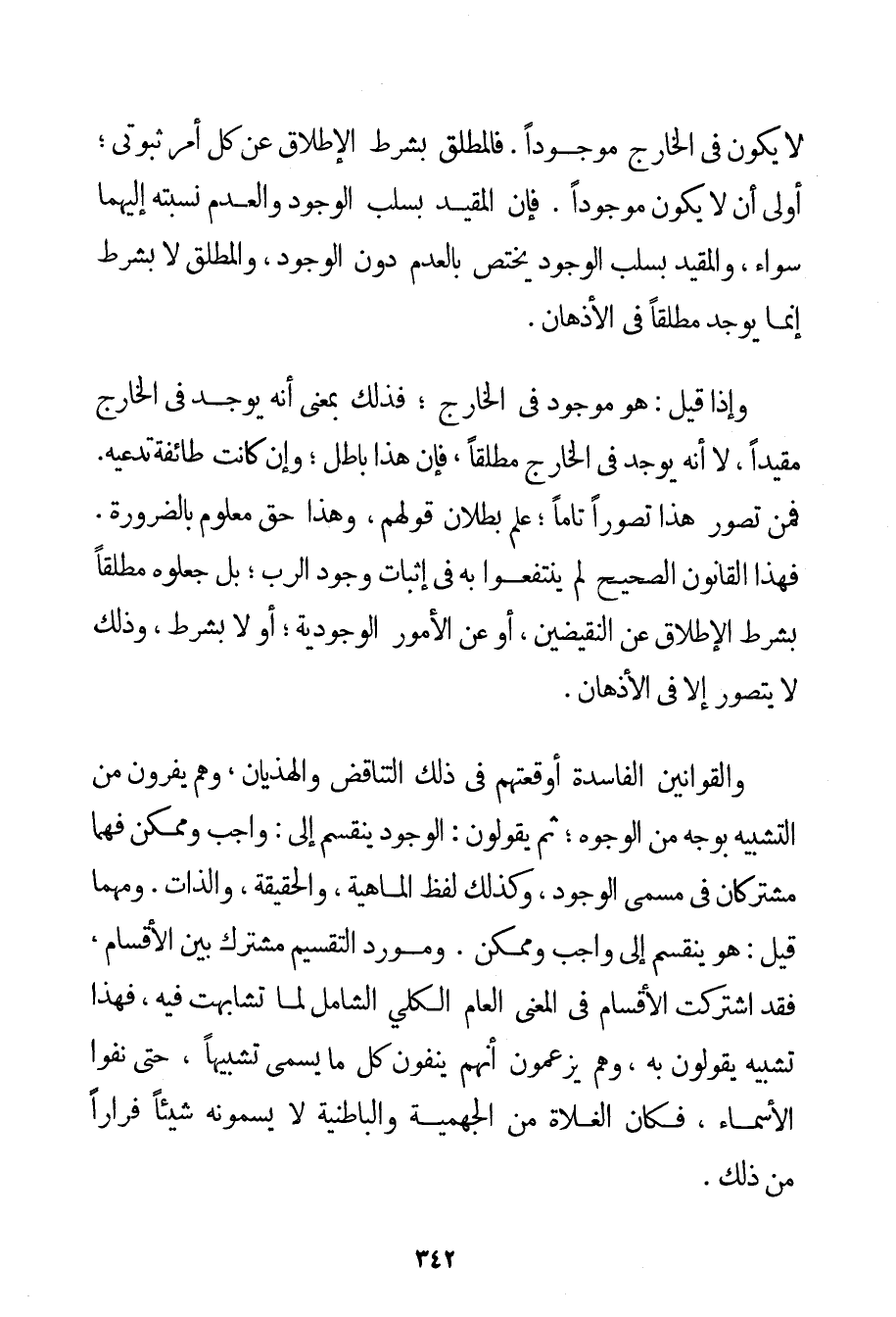 فَالْمُطْلَقُ بِشَرْطِ الْإِطْلَاقِ عَنْ كُلِّ أَمْرٍ ثُبُوتِيٍّ؛ أَوْلَى أَنْ لَا يَكُونَ مَوْجُودًا. فَإِنَّ الْمُقَيَّدَ بِسَلْبِ الْوُجُودِ وَالْعَدَمِ نِسْبَتُهُ إلَيْهِمَا سَوَاءٌ وَالْمُقَيَّدَ بِسَلْبِ الْوُجُودِ يَخْتَصُّ بِالْعَدَمِ دُونَ الْوُجُودِ وَالْمُطْلَقَ لَا بِشَرْطِ إنَّمَا يُوجَدُ مُطْلَقًا فِي الْأَذْهَانِ. وَإِذَا قِيلَ: هُوَ مَوْجُودٌ فِي الْخَارِجِ؛ فَذَلِكَ بِمَعْنَى أَنَّهُ يُوجَدُ فِي الْخَارِجِ مُقَيَّدًا لَا أَنَّهُ يُوجَدُ فِي الْخَارِجِ مُطْلَقًا فَإِنَّ هَذَا بَاطِلٌ؛ وَإِنْ كَانَتْ طَائِفَةٌ تَدَّعِيهِ. فَمَنْ تَصَوَّرَ هَذَا تَصَوُّرًا تَامًّا؛ عَلِمَ بُطْلَانَ قَوْلِهِمْ وَهَذَا حَقٌّ مَعْلُومٌ بِالضَّرُورَةِ. فَهَذَا الْقَانُونُ الصَّحِيحُ لَمْ يَنْتَفِعُوا بِهِ فِي إثْبَاتِ وُجُودِ الرَّبِّ؛ بَلْ جَعَلُوهُ مُطْلَقًا بِشَرْطِ الْإِطْلَاقِ عَنْ النَّقِيضَيْنِ أَوْ عَنْ الْأُمُورِ الْوُجُودِيَّةِ. أَوْ لَا بِشَرْطِ وَذَلِكَ لَا يُتَصَوَّرُ إلَّا فِي الْأَذْهَانِ. وَالْقَوَانِينُ الْفَاسِدَةُ أَوْقَعَتْهُمْ فِي ذَلِكَ التَّنَاقُضِ وَالْهَذَيَانِ وَهُمْ يَفِرُّونَ مِنْ التَّشْبِيهِ بِوَجْهِ مِنْ الْوُجُوهِ؛ ثُمَّ يَقُولُونَ: الْوُجُودُ يَنْقَسِمُ إلَى: وَاجِبٍ وَمُمْكِنٍ فَهُمَا مُشْتَرِكَانِ فِي مُسَمَّى الْوُجُودِ وَكَذَلِكَ لَفْظُ الْمَاهِيَّةِ وَالْحَقِيقَةِ وَالذَّاتِ. وَمَهْمَا قِيلَ: هُوَ يَنْقَسِمُ إلَى وَاجِبٍ وَمُمْكِنٍ. وَمَوْرِدُ التَّقْسِيمِ مُشْتَرَكٌ بَيْنَ الْأَقْسَامِ فَقَدْ اشْتَرَكَتْ الْأَقْسَامُ فِي الْمَعْنَى الْعَامِّ الْكُلِّيِّ الشَّامِلِ لِمَا تَشَابَهَتْ فِيهِ فَهَذَا تَشْبِيهٌ يَقُولُونَ بِهِ وَهُمْ يَزْعُمُونَ أَنَّهُمْ يَنْفُونَ كُلَّ مَا يُسَمَّى تَشْبِيهًا حَتَّى نَفَوْا الْأَسْمَاءَ فَكَانَ الْغُلَاةُ مِنْ الْجَهْمِيَّة وَالْبَاطِنِيَّةِ لَا يُسَمُّونَهُ شَيْئًا فِرَارًا مِنْ ذَلِكَ.