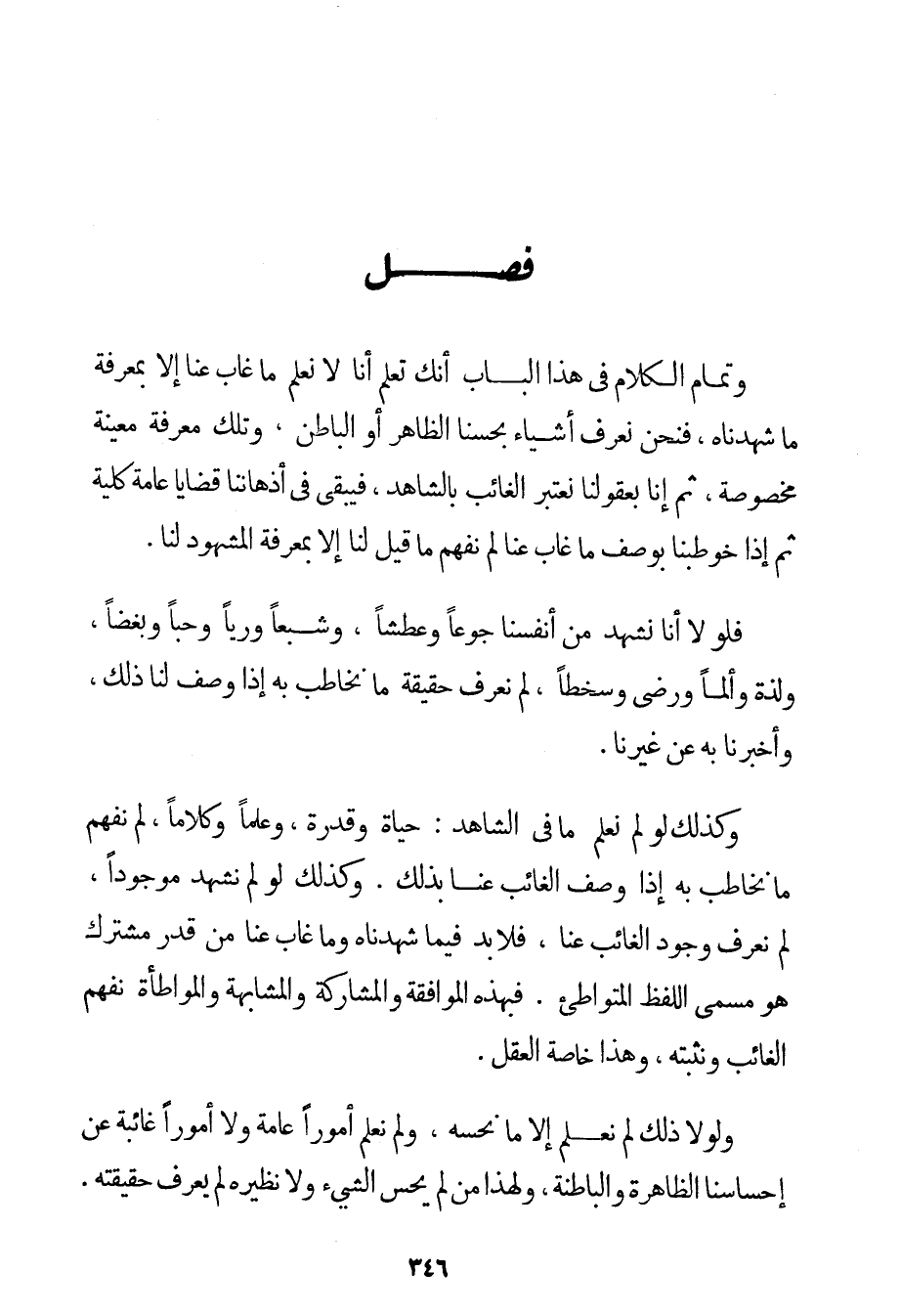 وَتَمَامُ الْكَلَامِ فِي هَذَا الْبَابِ أَنَّك تَعْلَمُ أَنَّا لَا نَعْلَمُ مَا غَابَ عَنَّا إلَّا بِمَعْرِفَةِ مَا شَهِدْنَاهُ فَنَحْنُ نَعْرِفُ أَشْيَاءَ بِحِسِّنَا الظَّاهِرِ أَوْ الْبَاطِنِ وَتِلْكَ مَعْرِفَةٌ مُعَيَّنَةٌ مَخْصُوصَةٌ ثُمَّ إنَّا بِعُقُولِنَا نَعْتَبِرُ الْغَائِبَ بِالشَّاهِدِ فَيَبْقَى فِي أَذْهَانِنَا قَضَايَا عَامَّةٌ كُلِّيَّةٌ ثُمَّ إذَا خُوطِبْنَا بِوَصْفِ مَا غَابَ عَنَّا لَمْ نَفْهَمْ مَا قِيلَ لَنَا إلَّا بِمَعْرِفَةِ الْمَشْهُودِ لَنَا. فَلَوْلَا أَنَّا نَشْهَدُ مِنْ أَنْفُسِنَا جُوعًا وَعَطَشًا وَشِبَعًا وَرِيًّا وَحُبًّا وَبُغْضًا وَلَذَّةً وَأَلَمًا وَرِضًى وَسُخْطًا لَمْ نَعْرِفْ حَقِيقَةَ مَا نُخَاطَبُ بِهِ إذَا وُصِفَ لَنَا ذَلِكَ وَأُخْبِرْنَا بِهِ عَنْ غَيْرِنَا. وَكَذَلِكَ لَوْ لَمْ نَعْلَمْ مَا فِي الشَّاهِدِ: حَيَاةً وَقُدْرَةً وَعِلْمًا وَكَلَامًا لَمْ نَفْهَمْ مَا نُخَاطَبُ بِهِ إذَا وُصِفَ الْغَائِبُ عَنَّا بِذَلِكَ. وَكَذَلِكَ لَوْ لَمْ نَشْهَدْ مَوْجُودًا لَمْ نَعْرِفْ وُجُودَ الْغَائِبِ عَنَّا فَلَا بُدَّ فِيمَا شَهِدْنَاهُ وَمَا غَابَ عَنَّا مِنْ قَدْرٍ مُشْتَرَكٍ هُوَ مُسَمَّى اللَّفْظِ الْمُتَوَاطِئِ. فَبِهَذِهِ الْمُوَافَقَةِ وَالْمُشَارَكَةِ وَالْمُشَابَهَةِ وَالْمُوَاطَأَةِ نَفْهَمُ الْغَائِبَ وَنُثْبِتُهُ وَهَذَا خَاصَّةُ الْعَقْلِ. وَلَوْلَا ذَلِكَ لَمْ نَعْلَمْ إلَّا مَا نُحِسُّهُ وَلَمْ نَعْلَمْ أُمُورًا عَامَّةً وَلَا أُمُورًا غَائِبَةً عَنْ إحْسَاسِنَا الظَّاهِرَةِ وَالْبَاطِنَةِ وَلِهَذَا مَنْ لَمْ يُحِسَّ الشَّيْءَ وَلَا نَظِيرَهُ لَمْ يَعْرِفْ حَقِيقَتَهُ.