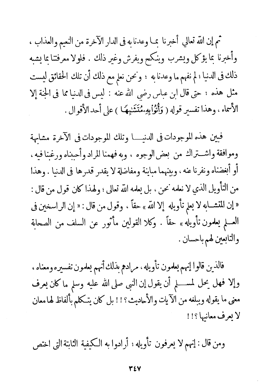 ثُمَّ إنَّ اللَّهَ تَعَالَى أَخْبَرَنَا بِمَا وَعَدَنَا بِهِ فِي الدَّارِ الْآخِرَة مِنْ النَّعِيمِ وَالْعَذَابِ وَأَخْبَرَنَا بِمَا يُؤْكَلُ وَيُشْرَبُ وَيُنْكَحُ وَيُفْرَشُ وَغَيْرِ ذَلِكَ. فَلَوْلَا مَعْرِفَتُنَا بِمَا يُشْبِهُ ذَلِكَ فِي الدُّنْيَا؛ لَمْ نَفْهَمْ مَا وَعَدَنَا بِهِ؛ وَنَحْنُ نَعْلَمُ مَعَ ذَلِكَ أَنَّ تِلْكَ الْحَقَائِقَ لَيْسَتْ مِثْلَ هَذِهِ؛ حَتَّى قَالَ ابْنُ عَبَّاسٍ رَضِيَ اللَّهُ عَنْهُ لَيْسَ فِي الدُّنْيَا مِمَّا فِي الْجَنَّةِ إلَّا الْأَسْمَاءُ وَهَذَا تَفْسِيرُ قَوْلِهِ {وَأُتُوا بِهِ مُتَشَابِهًا} عَلَى أَحَدِ الْأَقْوَالِ. فَبَيْنَ هَذِهِ الْمَوْجُودَاتِ فِي الدُّنْيَا وَتِلْكَ الْمَوْجُودَاتِ فِي الْآخِرَةِ مُشَابَهَةٌ وَمُوَافَقَةٌ وَاشْتِرَاكٌ مِنْ بَعْضِ الْوُجُوهِ وَبِهِ فَهِمْنَا الْمُرَادَ وَأَحْبَبْنَاهُ وَرَغِبْنَا فِيهِ أَوْ أَبْغَضْنَاهُ وَنَفَرْنَا عَنْهُ وَبَيْنَهُمَا مُبَايَنَةٌ وَمُفَاضَلَةٌ لَا يُقَدَّرُ قَدْرُهَا فِي الدُّنْيَا. وَهَذَا مِنْ التَّأْوِيلِ الَّذِي لَا نَعْلَمُهُ نَحْنُ بَلْ يَعْلَمُهُ اللَّهُ تَعَالَى؛ وَلِهَذَا كَانَ قَوْلُ مَنْ قَالَ: " إنَّ الْمُتَشَابِهَ لَا يَعْلَمُ تَأْوِيلَهُ إلَّا اللَّهُ " حَقًّا وَقَوْلُ مَنْ قَالَ: " إنَّ الرَّاسِخِينَ فِي الْعِلْمِ يَعْلَمُونَ تَأْوِيلَهُ " حَقًّا. وَكِلَا الْقَوْلَيْنِ مَأْثُورٌ عَنْ السَّلَفِ مِنْ الصَّحَابَةِ وَالتَّابِعِينَ لَهُمْ بِإِحْسَانِ. فَاَلَّذِينَ قَالُوا إنَّهُمْ يَعْلَمُونَ تَأْوِيلَهُ مُرَادُهُمْ بِذَلِكَ أَنَّهُمْ يَعْلَمُونَ تَفْسِيرَهُ وَمَعْنَاهُ وَإِلَّا فَهَلْ يَحِلُّ لِمُسْلِمِ أَنْ يَقُولَ إنَّ النَّبِيَّ صَلَّى اللَّهُ عَلَيْهِ وَسَلَّمَ مَا كَانَ يَعْرِفُ مَعْنَى مَا يَقُولُهُ وَيُبَلِّغُهُ مِنْ الْآيَاتِ وَالْأَحَادِيثِ بَلْ كَانَ يَتَكَلَّمُ بِأَلْفَاظِ لَهَا مَعَانٍ لَا يَعْرِفُ مَعَانِيَهَا وَمَنْ قَالَ: إنَّهُمْ لَا يَعْرِفُونَ تَأْوِيلَهُ؛ أَرَادُوا بِهِ الْكَيْفِيَّةَ الثَّابِتَةَ الَّتِي اُخْتُصَّ