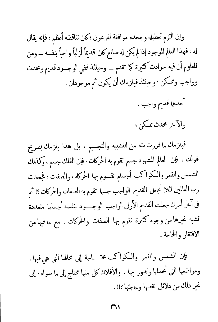 وَإِنْ الْتَزَمَ تَعْطِيلَهُ وَجَحْدَهُ مُوَافَقَةً لِفِرْعَوْنَ؛ كَانَ تَنَاقُضُهُ أَعْظَمَ؛ فَإِنَّهُ يُقَالُ لَهُ: فَهَذَا الْعَالَمُ الْمَوْجُودُ إذَا لَمْ يَكُنْ لَهُ صَانِعٌ كَانَ قَدِيمًا أَزَلِيًّا وَاجِبًا بِنَفْسِهِ - وَمِنْ الْمَعْلُومِ أَنَّ فِيهِ حَوَادِثَ كَثِيرَةً كَمَا تَقَدَّمَ - وَحِينَئِذٍ فَفِي الْوُجُودِ قَدِيمٌ وَمُحْدَثٌ وَوَاجِبٌ وَمُمْكِنٌ وَحِينَئِذٍ فَيَلْزَمُك أَنْ يَكُونَ ثَمَّ مَوْجُودَانِ: أَحَدُهُمَا قَدِيمٌ وَاجِبٌ. وَالْآخَرُ مُحْدَثٌ مُمْكِنٌ؛ فَيَلْزَمُك مَا فَرَرْت مِنْهُ مِنْ التَّشْبِيهِ وَالتَّجْسِيمِ بَلْ هَذَا يَلْزَمُك بِصَرِيحِ قَوْلِك فَإِنَّ الْعَالَمَ الْمَشْهُودَ جِسْمٌ تَقُومُ بِهِ الْحَرَكَاتُ فَإِنَّ الْفُلْكَ جِسْمٌ وَكَذَلِكَ الشَّمْسُ وَالْقَمَرُ وَالْكَوَاكِبُ أَجْسَامٌ تَقُومُ بِهَا الْحَرَكَاتُ وَالصِّفَاتُ؛ فَجَحَدْت رَبَّ الْعَالَمِينَ لِئَلَّا تَجْعَلَ الْقَدِيمَ الْوَاجِبَ جِسْمًا تَقُومُ بِهِ الصِّفَاتُ وَالْحَرَكَاتُ ثُمَّ فِي آخِرِ أَمْرِك جَعَلْت الْقَدِيمَ الْأَزَلِيَّ الْوَاجِبَ الْوُجُودَ بِنَفْسِهِ أَجْسَامًا مُتَعَدِّدَةً تُشْبِهُ غَيْرَهَا مِنْ وُجُوهٍ كَثِيرَةٍ تَقُومُ بِهَا الصِّفَاتُ وَالْحَرَكَاتُ مَعَ مَا فِيهَا مِنْ الِافْتِقَارِ وَالْحَاجَةِ. فَإِنَّ الشَّمْسَ وَالْقَمَرَ وَالْكَوَاكِبَ مُحْتَاجَةٌ إلَى مَحَالِّهَا الَّتِي هِيَ فِيهَا وَمَوَاضِعِهَا الَّتِي تَحْمِلُهَا وَتَدُورُ بِهَا وَالْأَفْلَاكُ كُلٌّ مِنْهَا مُحْتَاجٌ إلَى مَا سِوَاهُ إلَى غَيْرِ ذَلِكَ مِنْ دَلَائِلِ نَقْصِهَا وَحَاجَتِهَا.