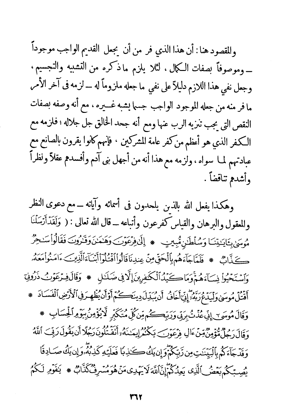 وَالْمَقْصُودُ هُنَا: أَنَّ هَذَا الَّذِي فَرَّ مِنْ أَنْ يَجْعَلَ الْقَدِيمَ الْوَاجِبَ مَوْجُودًا - وَمَوْصُوفًا بِصِفَاتِ الْكَمَالِ لِئَلَّا يَلْزَمَ مَا ذَكَرَهُ مِنْ التَّشْبِيهِ وَالتَّجْسِيمِ وَجَعَلَ نَفْيَ هَذَا اللَّازِمِ دَلِيلًا عَلَى نَفْيِ مَا جَعَلَهُ مَلْزُومًا لَهُ - لَزِمَهُ فِي آخِرِ الْأَمْرِ مَا فَرَّ مِنْهُ مِنْ جَعْلِهِ الْمَوْجُودَ الْوَاجِبَ جِسْمًا يُشْبِهُ غَيْرَهُ مَعَ أَنَّهُ وَصَفَهُ بِصِفَاتِ النَّقْصِ الَّتِي يَجِبُ تَنْزِيهُ الرَّبِّ عَنْهَا وَمَعَ أَنَّهُ جَحَدَ الْخَالِقَ جَلَّ جَلَالُهُ؛ فَلَزِمَهُ مَعَ الْكُفْرِ الَّذِي هُوَ أَعْظَمُ مِنْ كُفْرِ عَامَّةِ الْمُشْرِكِينَ فَإِنَّهُمْ كَانُوا يُقِرُّونَ بِالصَّانِعِ مَعَ عِبَادَتِهِمْ لِمَا سِوَاهُ وَلَزِمَهُ مَعَ هَذَا أَنَّهُ مِنْ أَجْهَلِ بَنِي آدَمَ وَأَفْسَدِهِمْ عَقْلًا وَنَظَرًا وَأَشَدِّهِمْ تَنَاقُضًا. وَهَكَذَا يَفْعَلُ اللَّهُ بالذين يُلْحِدُونَ فِي أَسْمَائِهِ وَآيَاتِهِ - مَعَ دَعْوَى النَّظَرِ وَالْمَعْقُولِ وَالْبُرْهَانِ وَالْقِيَاسِ كَفِرْعَوْنَ وَأَتْبَاعِهِ - قَالَ اللَّهُ تَعَالَى: {وَلَقَدْ أَرْسَلْنَا مُوسَى بِآيَاتِنَا وَسُلْطَانٍ مُبِينٍ} {إلَى فِرْعَوْنَ وَهَامَانَ وَقَارُونَ فَقَالُوا سَاحِرٌ كَذَّابٌ} {فَلَمَّا جَاءَهُمْ بِالْحَقِّ مِنْ عِنْدِنَا قَالُوا اقْتُلُوا أَبْنَاءَ الَّذِينَ آمَنُوا مَعَهُ وَاسْتَحْيُوا نِسَاءَهُمْ وَمَا كَيْدُ الْكَافِرِينَ إلَّا فِي ضَلَالٍ} {وَقَالَ فِرْعَوْنُ ذَرُونِي أَقْتُلْ مُوسَى وَلْيَدْعُ رَبَّهُ إنِّي أَخَافُ أَنْ يُبَدِّلَ دِينَكُمْ أَوْ أَنْ يُظْهِرَ فِي الْأَرْضِ الْفَسَادَ} {وَقَالَ مُوسَى إنِّي عُذْتُ بِرَبِّي وَرَبِّكُمْ مِنْ كُلِّ مُتَكَبِّرٍ لَا يُؤْمِنُ بِيَوْمِ الْحِسَابِ} {وَقَالَ رَجُلٌ مُؤْمِنٌ مِنْ آلِ فِرْعَوْنَ يَكْتُمُ إيمَانَهُ أَتَقْتُلُونَ رَجُلًا أَنْ يَقُولَ رَبِّيَ اللَّهُ وَقَدْ جَاءَكُمْ بِالْبَيِّنَاتِ مِنْ رَبِّكُمْ وَإِنْ يَكُ كَاذِبًا فَعَلَيْهِ كَذِبُهُ وَإِنْ يَكُ صَادِقًا يُصِبْكُمْ بَعْضُ الَّذِي يَعِدُكُمْ إنَّ اللَّهَ لَا يَهْدِي مَنْ هُوَ مُسْرِفٌ كَذَّابٌ} {يَا قَوْمِ لَكُمُ الْمُلْكُ الْيَوْمَ ظَاهِرِينَ