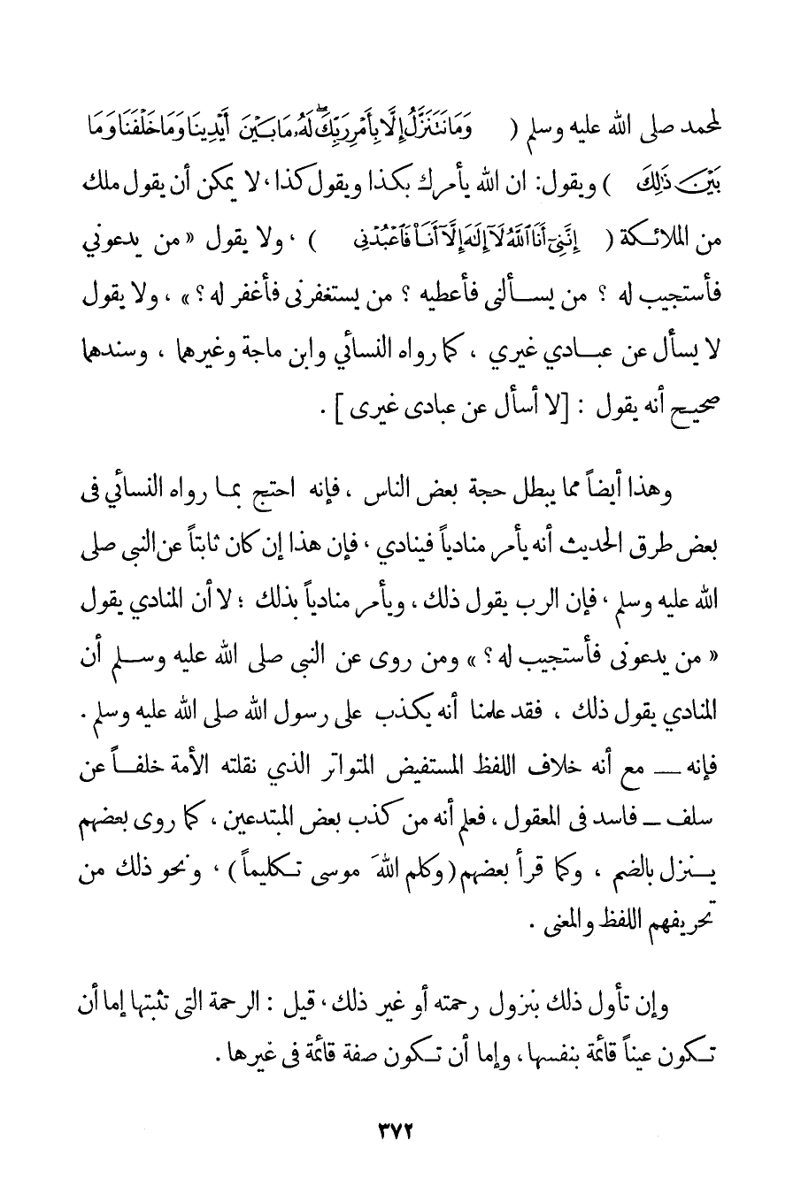لِمُحَمَّدِ صَلَّى اللَّهُ عَلَيْهِ وَسَلَّمَ {وَمَا نَتَنَزَّلُ إلَّا بِأَمْرِ رَبِّكَ لَهُ مَا بَيْنَ أَيْدِينَا وَمَا خَلْفَنَا وَمَا بَيْنَ ذَلِكَ} وَيَقُولُ: إنَّ اللَّهَ يَأْمُرُك بِكَذَا وَيَقُولُ كَذَا لَا يُمْكِنُ أَنْ يَقُولَ مَلَكٌ مِنْ الْمَلَائِكَةِ {إنَّنِي أَنَا اللَّهُ لَا إلَهَ إلَّا أَنَا فَاعْبُدْنِي} وَلَا يَقُولَ {مَنْ يَدْعُونِي فَأَسْتَجِيبَ لَهُ؟ مَنْ يَسْأَلُنِي فَأُعْطِيَهُ؟ مَنْ يَسْتَغْفِرُنِي فَأَغْفِرَ لَهُ؟} وَلَا يَقُولَ {لَا يَسْأَلُ عَنْ عِبَادِي غَيْرِي} كَمَا رَوَاهُ النَّسَائِي وَابْنُ مَاجَه وَغَيْرُهُمَا وَسَنَدُهُمَا صَحِيحٌ أَنَّهُ يَقُولُ: {لَا أَسْأَلُ عَنْ عِبَادِي غَيْرِي} . وَهَذَا أَيْضًا مِمَّا يُبْطِلُ حُجَّةَ بَعْضِ النَّاسِ فَإِنَّهُ احْتَجَّ بِمَا رَوَاهُ النَّسَائِي فِي بَعْضِ طُرُقِ الْحَدِيثِ أَنَّهُ يَأْمُرُ مُنَادِيًا فَيُنَادِي فَإِنَّ هَذَا إنْ كَانَ ثَابِتًا عَنْ النَّبِيِّ صَلَّى اللَّهُ عَلَيْهِ وَسَلَّمَ فَإِنَّ الرَّبَّ يَقُولُ ذَلِكَ وَيَأْمُرُ مُنَادِيًا بِذَلِكَ؛ لَا أَنَّ الْمُنَادِيَ يَقُولُ {مَنْ يَدْعُونِي فَأَسْتَجِيبَ لَهُ؟} وَمَنْ رَوَى عَنْ النَّبِيِّ صَلَّى اللَّهُ عَلَيْهِ وَسَلَّمَ أَنَّ الْمُنَادِيَ يَقُولُ ذَلِكَ فَقَدْ عَلِمْنَا أَنَّهُ يَكْذِبُ عَلَى رَسُولِ اللَّهِ صَلَّى اللَّهُ عَلَيْهِ وَسَلَّمَ. فَإِنَّهُ - مَعَ أَنَّهُ خِلَافُ اللَّفْظِ الْمُسْتَفِيضِ الْمُتَوَاتِرِ الَّذِي نَقَلَتْهُ الْأُمَّةُ خَلَفًا عَنْ سَلَفٍ - فَاسِدٌ فِي الْمَعْقُولِ فَعُلِمَ أَنَّهُ مِنْ كَذِبِ بَعْضِ الْمُبْتَدِعِينَ كَمَا رَوَى بَعْضُهُمْ يُنْزِلُ بِالضَّمِّ وَكَمَا قَرَأَ بَعْضُهُمْ ( {وَكَلَّمَ اللَّهُ مُوسَى تَكْلِيمًا} ) وَنَحْوَ ذَلِكَ مِنْ تَحْرِيفِهِمْ اللَّفْظَ وَالْمَعْنَى. وَإِنْ تَأَوَّلَ ذَلِكَ بِنُزُولِ رَحْمَتِهِ أَوْ غَيْرِ ذَلِكَ قِيلَ: الرَّحْمَةُ الَّتِي تُثْبِتُهَا إمَّا أَنْ تَكُونَ عَيْنًا قَائِمَةً بِنَفْسِهَا وَإِمَّا أَنْ تَكُونَ صِفَةً قَائِمَةً فِي غَيْرِهَا.