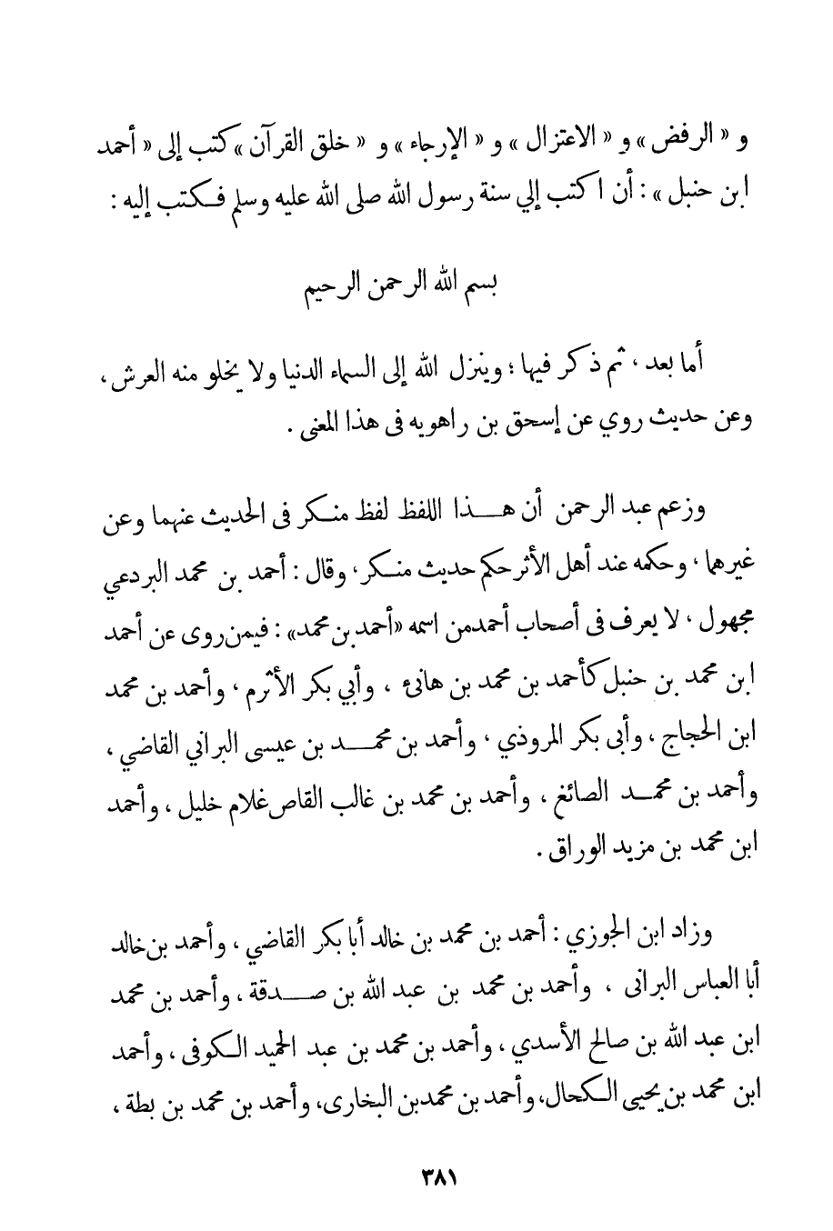 وَ " الرَّفْضِ " وَ " الِاعْتِزَالِ " وَ " الْإِرْجَاءِ " وَ " الْقُرْآنِ " كَتَبَ إلَى " أَحْمَد بْنِ حَنْبَلٍ ": أَنْ اُكْتُبْ إلَيَّ سُنَّةَ رَسُولِ اللَّهِ صَلَّى اللَّهُ عَلَيْهِ وَسَلَّمَ فَكَتَبَ إلَيْهِ: بِسْمِ اللَّهِ الرَّحْمَنِ الرَّحِيمِ أَمَّا بَعْدُ ثُمَّ ذَكَرَ فِيهَا؛ وَيَنْزِلُ اللَّهُ إلَى السَّمَاءِ الدُّنْيَا وَلَا يَخْلُو مِنْهُ الْعَرْشُ وَعَنْ حَدِيثٍ رُوِيَ عَنْ إسْحَاقَ بْنِ رَاهَوَيْه فِي هَذَا الْمَعْنَى. وَزَعَمَ عَبْدُ الرَّحْمَنِ أَنَّ هَذَا اللَّفْظَ لَفْظٌ مُنْكَرٌ فِي الْحَدِيثِ عَنْهُمَا وَعَنْ غَيْرِهِمَا وَحُكْمُهُ عِنْدَ أَهْلِ الْأَثَرِ حُكْمُ حَدِيثٍ مُنْكَرٍ وَقَالَ: أَحْمَد بْنُ مُحَمَّدٍ البردعي مَجْهُولٌ لَا يُعْرَفُ فِي أَصْحَابِ أَحْمَد مَنْ اسْمُهُ " أَحْمَد بْنُ مُحَمَّدٍ ": فِيمَنْ رَوَى عَنْ أَحْمَد بْنِ مُحَمَّدِ بْنِ حَنْبَلٍ كَأَحْمَدَ بْنِ مُحَمَّدِ بْنِ هَانِئٍ وَأَبِي بَكْرٍ الْأَثْرَمِ وَأَحْمَد بْنِ مُحَمَّدِ بْنِ الْحَجَّاجِ وَأَبِي بَكْرٍ المروذي (*) وَأَحْمَد بْنِ مُحَمَّدِ بْنِ عِيسَى البراني الْقَاضِي وَأَحْمَد بْنِ مُحَمَّدٍ الصَّائِغِ وَأَحْمَد بْنِ مُحَمَّدِ بْنِ غَالِبٍ الْقَاصِّ غُلَامِ خَلِيلٍ وَأَحْمَد بْنِ مُحَمَّدِ بْنِ مَزِيدٍ الْوَرَّاقِ. وَزَادَ ابْنُ الْجَوْزِيِّ: أَحْمَد بْنَ مُحَمَّدِ بْنِ خَالِدٍ أَبَا بَكْرٍ الْقَاضِيَ وَأَحْمَد بْنَ خَالِدٍ أَبَا الْعَبَّاسِ البراني وَأَحْمَد بْنَ مُحَمَّدِ بْنِ عَبْدِ اللَّهِ بْنِ صَدَقَةَ وَأَحْمَد بْنَ مُحَمَّدِ بْنِ عَبْدِ اللَّهِ بْنِ صَالِحٍ الأسدي وَأَحْمَد بْنَ مُحَمَّدِ بْنِ عَبْدِ الْحَمِيدِ الْكُوفِيَّ وَأَحْمَد بْنَ مُحَمَّدِ بْنِ يَحْيَى الْكَحَّالَ وَأَحْمَد بْنَ مُحَمَّدِ بْنِ الْبُخَارِيِّ وَأَحْمَد بْنَ مُحَمَّدِ بْنِ بَطَّةَ