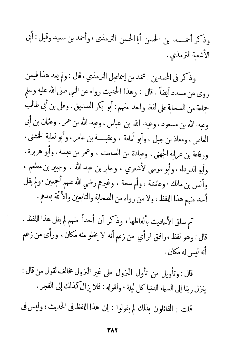 وَذَكَرَ أَحْمَد بْنُ الْحَسَنِ أَبَا الْحَسَنِ التِّرْمِذِيَّ؛ وَأَحْمَد بْنَ سَعِيدٍ وَقِيلَ: أَبُو الأشعبة التِّرْمِذِيُّ. وَذَكَرَ فِي الْمُحَمَّدِينَ: مُحَمَّدَ بْنَ إسْمَاعِيلَ التِّرْمِذِيَّ قَالَ: وَلَمْ يُعَدَّ هَذَا فِيمَنْ رَوَى عَنْ مُسَدَّدٍ أَيْضًا. قَالَ: وَهَذَا الْحَدِيثُ رَوَاهُ عَنْ النَّبِيِّ صَلَّى اللَّهُ عَلَيْهِ وَسَلَّمَ جَمَاعَةٌ مِنْ الصَّحَابَةِ عَلَى لَفْظٍ وَاحِدٍ مِنْهُمْ: أَبُو بَكْرٍ الصِّدِّيقُ وَعَلِيُّ بْنُ أَبِي طَالِبٍ وَعَبْدُ اللَّهِ بْنُ مَسْعُودٍ وَعَبْدُ اللَّهِ بْنُ عَبَّاسٍ وَعَبْدُ اللَّهِ بْنُ عُمَرَ وَعُثْمَانُ بْنُ أَبِي العاص وَمُعَاذُ بْنُ جَبَلٍ وَأَبُو أمامة وَعُقْبَةُ بْنُ عَامِرٍ وَأَبُو ثَعْلَبَةَ المروذي وَرِفَاعَةُ بْنُ عَرَابَةَ الجهني وعبادة بْنُ الصَّامِتِ وَعُمَرُ بْنُ عبسة وَأَبُو هُرَيْرَةَ وَأَبُو الدَّرْدَاءِ وَأَبُو مُوسَى الْأَشْعَرِيُّ وَجَابِرُ بْنُ عَبْدِ اللَّهِ وَجُبَيْرُ بْنُ مُطْعَمٍ وَأَنَسُ بْنُ مَالِكٍ وَعَائِشَةُ وَأُمُّ سَلَمَةَ وَغَيْرُهُمْ رَضِيَ اللَّهُ عَنْهُمْ أَجْمَعِينَ وَلَمْ يَقُلْ أَحَدٌ مِنْهُمْ هَذَا اللَّفْظَ؛ وَلَا مَنْ رَوَاهُ مِنْ الصَّحَابَةِ وَالتَّابِعِينَ وَالْأَئِمَّةِ بَعْدَهُمْ. ثُمَّ سَاقَ الْأَحَادِيثَ بِأَلْفَاظِهَا؛ وَذَكَرَ أَنَّ أَحَدًا مِنْهُمْ لَمْ يَقُلْ هَذَا اللَّفْظَ. قَالَ: وَهُوَ لَفْظٌ مُوَافِقٌ لِرَأْيِ مَنْ زَعَمَ أَنَّهُ لَا يَخْلُو مِنْهُ مَكَانٌ وَرَأَى مَنْ زَعَمَ أَنَّهُ لَيْسَ لَهُ مَكَانٌ. قَالَ: وَتَأْوِيلُ مَنْ تَأَوَّلَ النُّزُولَ عَلَى غَيْرِ النُّزُولِ مُخَالِفٌ لِقَوْلِ مَنْ قَالَ: يَنْزِلُ رَبُّنَا إلَى السَّمَاءِ الدُّنْيَا كُلَّ لَيْلَةٍ وَلِقَوْلِهِ: فَلَا يَزَالُ كَذَلِكَ إلَى الْفَجْرِ. قُلْت: الْقَائِلُونَ بِذَلِكَ لَمْ يَقُولُوا: إنَّ هَذَا اللَّفْظَ فِي الْحَدِيثِ؛ وَلَيْسَ فِي