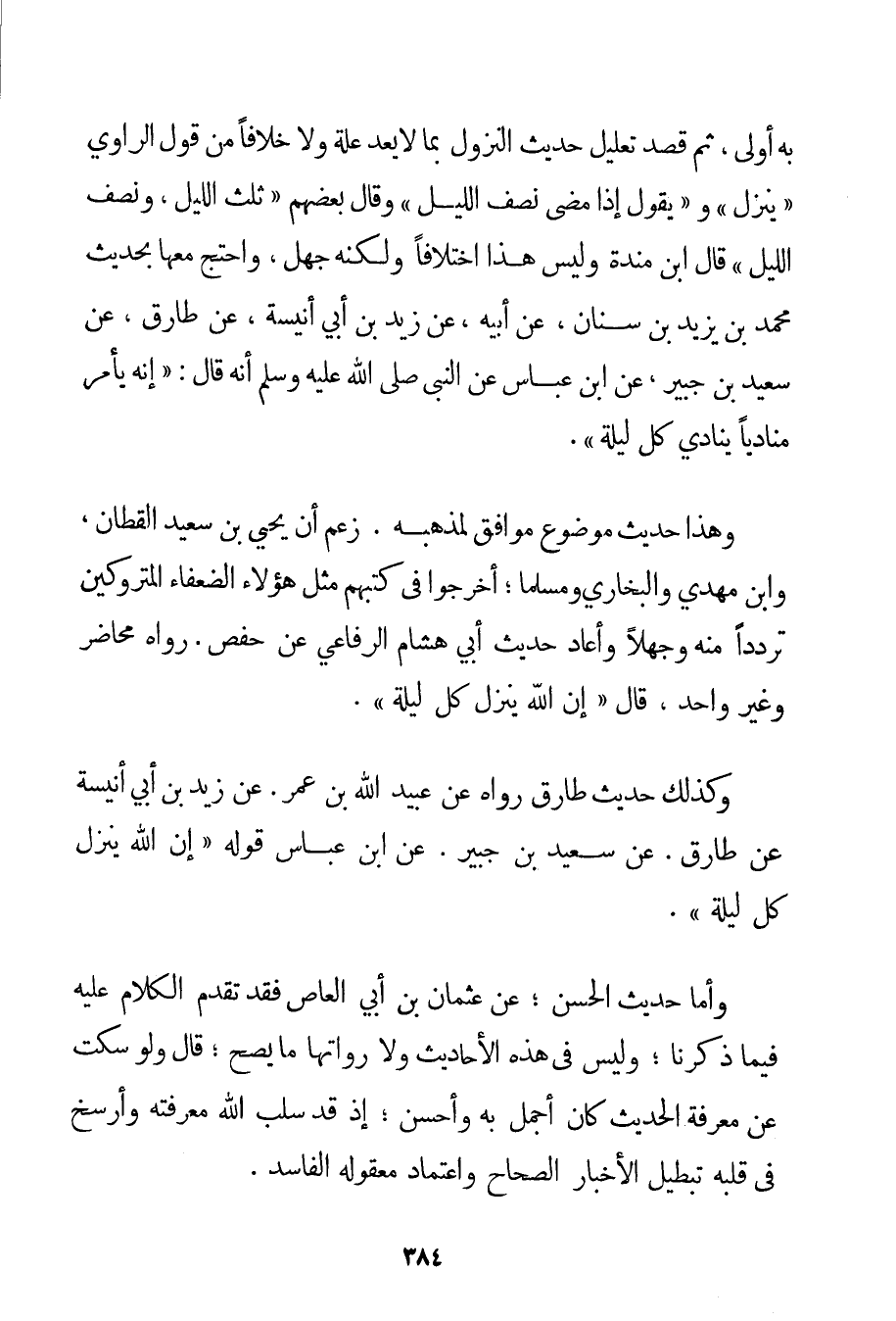 بِهِ أَوْلَى ثُمَّ قَصَدَ تَعْلِيلَ حَدِيثِ النُّزُولِ بِمَا لَا يُعَدُّ عِلَّةً وَلَا خِلَافًا مِنْ قَوْلِ الرَّاوِي " يَنْزِلُ " وَ " يَقُولُ إذَا مَضَى نِصْفُ اللَّيْلِ " وَقَالَ بَعْضُهُمْ " ثُلُثُ اللَّيْلِ وَنِصْفُ اللَّيْلِ " قَالَ ابْنُ منده وَلَيْسَ هَذَا اخْتِلَافًا وَلَكِنَّهُ جَهْلٌ وَاحْتَجَّ مَعَهَا بِحَدِيثِ مُحَمَّدِ بْنِ يَزِيدَ بْنِ سِنَانٍ عَنْ أَبِيهِ عَنْ زَيْدِ بْنِ أَبِي أنيسة عَنْ طَارِقٍ عَنْ سَعِيدِ بْنِ جُبَيْرٍ عَنْ ابْنِ عَبَّاسٍ عَنْ النَّبِيِّ صَلَّى اللَّهُ عَلَيْهِ وَسَلَّمَ أَنَّهُ قَالَ: " إنَّهُ يَأْمُرُ مُنَادِيًا يُنَادِي كُلَّ لَيْلَةٍ ". وَهَذَا حَدِيثٌ مَوْضُوعٌ مُوَافِقٌ لِمَذْهَبِهِ. زَعَمَ أَنَّ يَحْيَى بْنَ سَعِيدٍ الْقَطَّانَ وَابْنَ مَهْدِيٍّ وَالْبُخَارِيَّ وَمُسْلِمًا؛ أَخْرَجُوا فِي كُتُبِهِمْ مِثْلَ هَؤُلَاءِ الضُّعَفَاءِ الْمَتْرُوكِينَ تَرَدُّدًا مِنْهُ وَجَهْلًا وَأَعَادَ حَدِيثَ أَبِي هِشَامٍ الرِّفَاعِيِّ عَنْ حَفْصٍ. رَوَاهُ مُحَاضِرٌ وَغَيْرُ وَاحِدٍ قَالَ {إنَّ اللَّهَ يَنْزِلُ كُلَّ لَيْلَةٍ} . وَكَذَلِكَ حَدِيثُ طَارِقٍ رَوَاهُ عَنْ عُبَيْدِ اللَّهِ بْنِ عُمَرَ. عَنْ زَيْدِ بْنِ أَبِي أنيسة عَنْ طَارِقٍ. عَنْ سَعِيدِ بْنِ جُبَيْرٍ. عَنْ ابْنِ عَبَّاسٍ قَوْلُهُ {إنَّ اللَّهَ يَنْزِلُ كُلَّ لَيْلَةٍ} . وَأَمَّا حَدِيثُ الْحَسَنِ؛ عَنْ عُثْمَانَ بْنِ أَبِي العاص فَقَدْ تَقَدَّمَ الْكَلَامُ عَلَيْهِ فِيمَا ذَكَرْنَا؛ وَلَيْسَ فِي هَذِهِ الْأَحَادِيثِ وَلَا رُوَاتِهَا مَا يَصِحُّ؛ قَالَ وَلَوْ سَكَتَ عَنْ مَعْرِفَةِ الْحَدِيثِ كَانَ أَجْمَلَ بِهِ وَأَحْسَنَ؛ إذْ قَدْ سَلَبَ اللَّهُ مَعْرِفَتَهُ وَأَرْسَخَ فِي قَلْبِهِ تَبْطِيلَ الْأَخْبَارِ الصِّحَاحِ وَاعْتِمَادَ مَعْقُولِهِ الْفَاسِدِ.