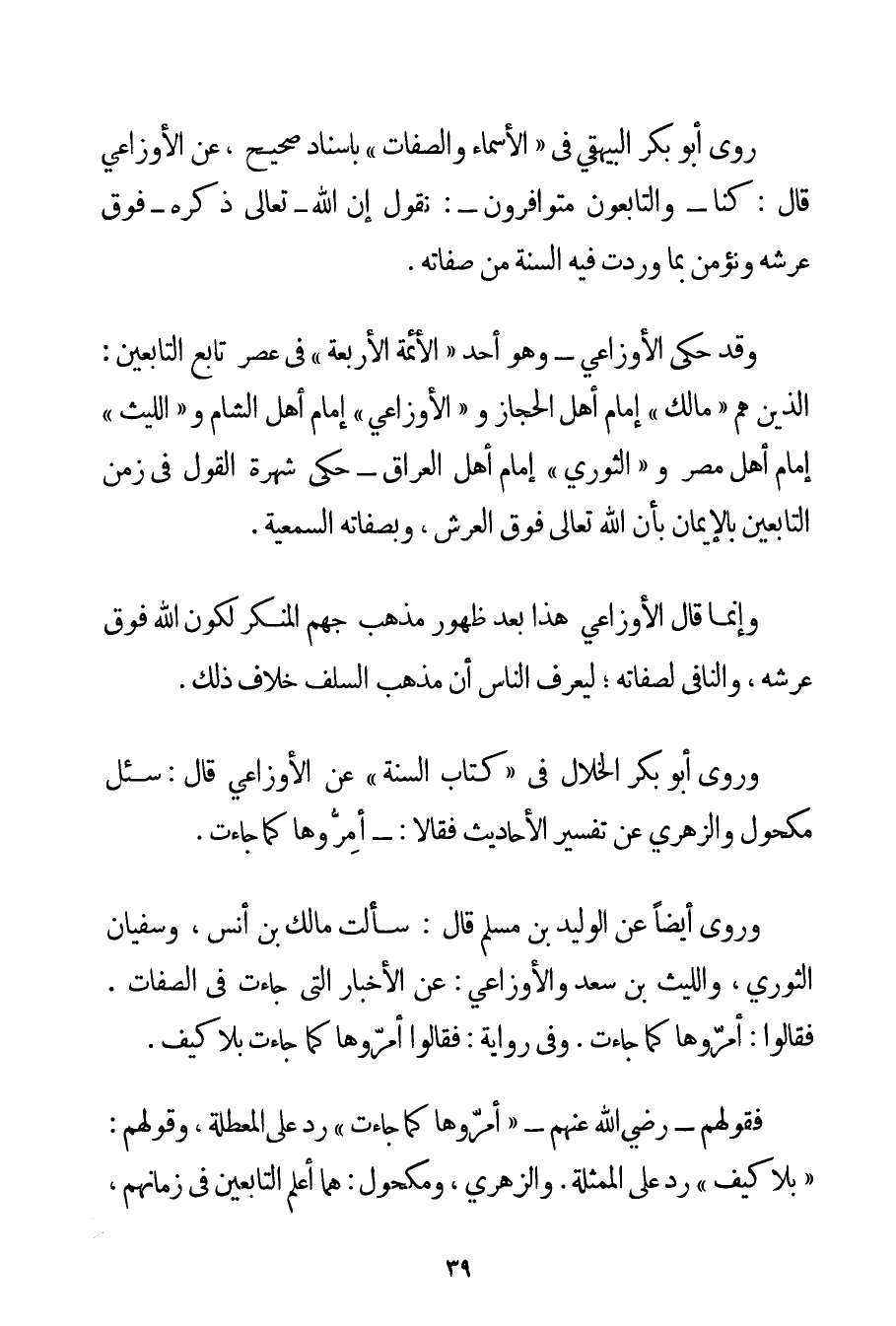 رَوَى أَبُو بَكْرٍ البيهقي فِي " الْأَسْمَاءِ وَالصِّفَاتِ " بِإِسْنَادِ صَحِيحٍ عَنْ الأوزاعي قَالَ: كُنَّا - وَالتَّابِعُونَ مُتَوَافِرُونَ -: نَقُولُ إنَّ اللَّهَ - تَعَالَى ذِكْرُهُ - فَوْقَ عَرْشِهِ وَنُؤْمِنُ بِمَا وَرَدَتْ فِيهِ السُّنَّةُ مِنْ صِفَاتِهِ. وَقَدْ حَكَى الأوزاعي - وَهُوَ أَحَدُ " الْأَئِمَّةِ الْأَرْبَعَةِ " فِي عَصْرِ تَابِعِ التَّابِعِينَ: الَّذِينَ هُمْ " مَالِكٌ " إمَامُ أَهْلِ الْحِجَازِ وَ " الأوزاعي " إمَامُ أَهْلِ الشَّامِ وَ " اللَّيْثُ " إمَامُ أَهْلِ مِصْرَ وَ " الثَّوْرِيُّ " إمَامُ أَهْلِ الْعِرَاقِ - حَكَى شُهْرَةَ الْقَوْلِ فِي زَمَنِ التَّابِعِينَ بِالْإِيمَانِ بِأَنَّ اللَّهَ تَعَالَى فَوْقَ الْعَرْشِ وَبِصِفَاتِهِ السَّمْعِيَّةِ. وَإِنَّمَا قَالَ الأوزاعي هَذَا بَعْدَ ظُهُورِ مَذْهَبِ جَهْمٍ الْمُنْكِرِ لِكَوْنِ اللَّهِ فَوْقَ عَرْشِهِ وَالنَّافِي لِصِفَاتِهِ؛ لِيَعْرِفَ النَّاسُ أَنَّ مَذْهَبَ السَّلَفِ خِلَافُ ذَلِكَ. وَرَوَى أَبُو بَكْرٍ الْخَلَّالُ فِي " كِتَابِ السُّنَّةِ " عَنْ الأوزاعي قَالَ: سُئِلَ مَكْحُولٌ وَالزُّهْرِيُّ عَنْ تَفْسِيرِ الْأَحَادِيثِ فَقَالَا: - أَمِرُّوهَا كَمَا جَاءَتْ. وَرَوَى أَيْضًا عَنْ الْوَلِيدِ بْنِ مُسْلِمٍ قَالَ: سَأَلْت مَالِكَ بْنَ أَنَسٍ وَسُفْيَانَ الثَّوْرِيَّ وَاللَّيْثَ بْنَ سَعْدٍ وَالْأَوْزَاعِي: عَنْ الْأَخْبَارِ الَّتِي جَاءَتْ فِي الصِّفَاتِ. فَقَالُوا: أَمِرُّوهَا كَمَا جَاءَتْ. وَفِي رِوَايَةٍ: فَقَالُوا أَمِرُّوهَا كَمَا جَاءَتْ بِلَا كَيْفٍ. فَقَوْلُهُمْ - رَضِيَ اللَّهُ عَنْهُمْ - " أَمِرُّوهَا كَمَا جَاءَتْ " رَدٌّ عَلَى الْمُعَطِّلَةِ وَقَوْلُهُمْ: " بِلَا كَيْفٍ " رَدٌّ عَلَى الْمُمَثِّلَةِ. وَالزُّهْرِيُّ وَمَكْحُولٌ: هُمَا أَعْلَمُ التَّابِعِينَ فِي زَمَانِهِمْ
