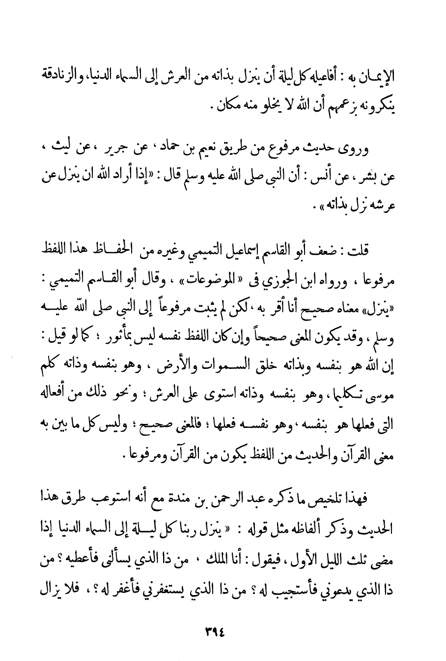 الْإِيمَانَ بِهِ: أَفَاعِيلَهُ كُلَّ لَيْلَةٍ أَنْ يَنْزِلَ بِذَاتِهِ مِنْ الْعَرْشِ إلَى السَّمَاءِ الدُّنْيَا وَالزَّنَادِقَةُ يُنْكِرُونَهُ بِزَعْمِهِمْ أَنَّ اللَّهَ لَا يَخْلُو مِنْهُ مَكَانٌ. وَرُوِيَ حَدِيثٌ مَرْفُوعٌ مِنْ طَرِيقِ نُعَيْمِ بْنِ حَمَّادٍ عَنْ جَرِيرٍ عَنْ لَيْثٍ عَنْ بِشْرٍ عَنْ أَنَسٍ: أَنَّ النَّبِيَّ صَلَّى اللَّهُ عَلَيْهِ وَسَلَّمَ قَالَ: {إذَا أَرَادَ اللَّهُ أَنْ يَنْزِلَ عَنْ عَرْشِهِ نَزَلَ بِذَاتِهِ} . قُلْت: ضَعَّفَ أَبُو الْقَاسِمِ إسْمَاعِيلُ التَّيْمِيُّ وَغَيْرُهُ مِنْ الْحُفَّاظِ هَذَا اللَّفْظَ مَرْفُوعًا وَرَوَاهُ ابْنُ الْجَوْزِيِّ فِي " الْمَوْضُوعَاتِ " وَقَالَ أَبُو الْقَاسِمِ التَّيْمِيُّ: " يَنْزِلُ " مَعْنَاهُ صَحِيحٌ أَنَا أُقِرُّ بِهِ لَكِنْ لَمْ يَثْبُتْ مَرْفُوعًا إلَى النَّبِيِّ صَلَّى اللَّهُ عَلَيْهِ وَسَلَّمَ (*) وَقَدْ يَكُونُ الْمَعْنَى صَحِيحًا وَإِنْ كَانَ اللَّفْظُ نَفْسُهُ لَيْسَ بِمَأْثُورِ؛ كَمَا لَوْ قِيلَ: إنَّ اللَّهَ هُوَ بِنَفْسِهِ وَبِذَاتِهِ خَلَقَ السَّمَوَاتِ وَالْأَرْضَ وَهُوَ بِنَفْسِهِ وَذَاتِهِ كَلَّمَ مُوسَى تَكْلِيمًا وَهُوَ بِنَفْسِهِ وَذَاتِهِ اسْتَوَى عَلَى الْعَرْشِ؛ وَنَحْوَ ذَلِكَ مِنْ أَفْعَالِهِ الَّتِي فَعَلَهَا هُوَ بِنَفْسِهِ وَهُوَ نَفْسُهُ فَعَلَهَا. فَالْمَعْنَى صَحِيحٌ؛ وَلَيْسَ كُلُّ مَا بُيِّنَ بِهِ مَعْنَى الْقُرْآنِ وَالْحَدِيثِ مِنْ اللَّفْظِ يَكُونُ مِنْ الْقُرْآنِ وَمَرْفُوعًا. فَهَذَا تَلْخِيصُ مَا ذَكَرَهُ عَبْدُ الرَّحْمَنِ بْنُ منده مَعَ أَنَّهُ اسْتَوْعَبَ طُرُقَ هَذَا الْحَدِيثِ وَذَكَرَ أَلْفَاظَهُ مِثْلَ قَوْلِهِ: {يَنْزِلُ رَبُّنَا كُلَّ لَيْلَةٍ إلَى السَّمَاءِ الدُّنْيَا إذَا مَضَى ثُلُثُ اللَّيْلِ الْأَوَّلِ فَيَقُولُ: أَنَا الْمَلِكُ مَنْ ذَا الَّذِي يَسْأَلُنِي فَأُعْطِيَهُ؟ مَنْ ذَا الَّذِي يَدْعُونِي فَأَسْتَجِيبَ لَهُ؟ مَنْ ذَا الَّذِي يَسْتَغْفِرُنِي فَأَغْفِرَ لَهُ؟ فَلَا يَزَالُ