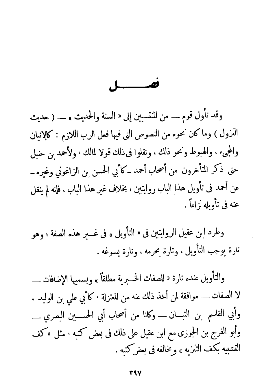 وَقَدْ تَأَوَّلَ قَوْمٌ - مِنْ الْمُنْتَسِبِينَ إلَى " السُّنَّةِ وَالْحَدِيثِ " - حَدِيثَ النُّزُولِ وَمَا كَانَ نَحْوَهُ مِنْ النُّصُوصِ الَّتِي فِيهَا فِعْلُ الرَّبِّ اللَّازِمِ: كَالْإِتْيَانِ وَالْمَجِيءِ وَالْهُبُوطِ وَنَحْوِ ذَلِكَ وَنَقَلُوا فِي ذَلِكَ قَوْلًا لِمَالِكٍ وَلِأَحْمَدَ بْنِ حَنْبَلٍ حَتَّى ذَكَرَ الْمُتَأَخِّرُونَ مِنْ أَصْحَابِ أَحْمَد - كَأَبِي الْحَسَنِ بْنِ الزَّاغُونِي وَغَيْرِهِ - عَنْ أَحْمَد فِي تَأْوِيلِ هَذَا الْبَابِ رِوَايَتَيْنِ؛ بِخِلَافِ غَيْرِ هَذَا الْبَابِ فَإِنَّهُ لَمْ يُنْقَلْ عَنْهُ فِي تَأْوِيلِهِ نِزَاعًا. وَطَرَدَ ابْنُ عَقِيلٍ الرِّوَايَتَيْنِ فِي " التَّأْوِيلِ " فِي غَيْرِ هَذِهِ الصِّفَةِ؛ وَهُوَ تَارَةً يُوجِبُ التَّأْوِيلَ وَتَارَةً يُحَرِّمُهُ وَتَارَةً يُسَوِّغُهُ. وَالتَّأْوِيلُ عِنْدَهُ تَارَةً " لِلصِّفَاتِ الْخَبَرِيَّةِ مُطْلَقًا " وَيُسَمِّيهَا الْإِضَافَاتِ - لَا الصِّفَاتِ - مُوَافَقَةً لِمَنْ أَخَذَ ذَلِكَ عَنْهُ مِنْ الْمُعْتَزِلَةِ كَأَبِي عَلِيِّ بْنِ الْوَلِيدِ وَأَبِي الْقَاسِمِ بْنِ التَّبَّانِ - وَكَانَا مِنْ أَصْحَابِ أَبِي الْحُسَيْنِ الْبَصْرِيِّ - وَأَبُو الْفَرَجِ بْنُ الْجَوْزِيِّ مَعَ ابْنِ عَقِيلٍ عَلَى ذَلِكَ فِي بَعْضِ كُتُبِهِ مِثْلُ " كَفِّ التَّشْبِيهِ بِكَفِّ التَّنْزِيهِ " وَيُخَالِفُهُ فِي بَعْضِ كُتُبِهِ.