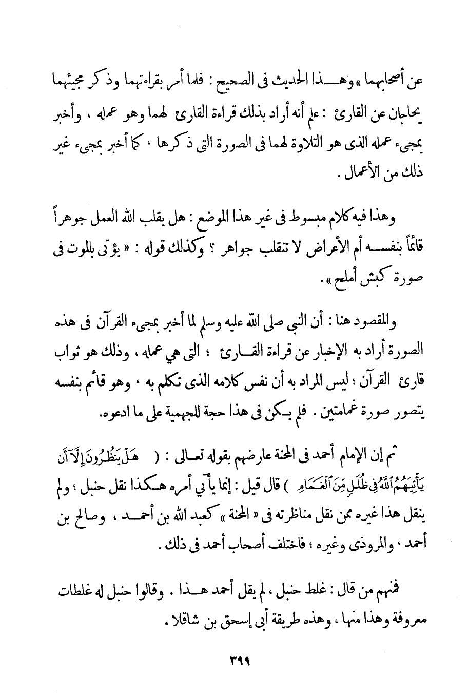 عَنْ أَصْحَابِهِمَا} وَهَذَا الْحَدِيثُ فِي الصَّحِيحِ: فَلَمَّا أَمَرَ بِقِرَاءَتِهِمَا وَذَكَرَ مَجِيئَهُمَا يُحَاجَّانِ عَنْ الْقَارِئِ: عُلِمَ أَنَّهُ أَرَادَ بِذَلِكَ قِرَاءَةَ الْقَارِئِ لَهُمَا وَهُوَ عَمَلُهُ وَأَخْبَرَ بِمَجِيءِ عَمَلِهِ الَّذِي هُوَ التِّلَاوَةُ لَهُمَا فِي الصُّورَةِ الَّتِي ذَكَرَهَا كَمَا أَخْبَرَ بِمَجِيءِ غَيْرِ ذَلِكَ مِنْ الْأَعْمَالِ. وَهَذَا فِيهِ كَلَامٌ مَبْسُوطٌ فِي غَيْرِ هَذَا الْمَوْضِعِ: هَلْ يُقَلِّبُ اللَّهُ الْعَمَلَ جَوْهَرًا قَائِمًا بِنَفْسِهِ أَمْ الْأَعْرَاضُ لَا تَنْقَلِبُ جَوَاهِرَ؟ وَكَذَلِكَ قَوْلُهُ: {يُؤْتَى بِالْمَوْتِ فِي صُورَةِ كَبْشٍ أَمْلَحَ} . وَالْمَقْصُودُ هُنَا: أَنَّ النَّبِيَّ صَلَّى اللَّهُ عَلَيْهِ وَسَلَّمَ لَمَّا أَخْبَرَ بِمَجِيءِ الْقُرْآنِ فِي هَذِهِ الصُّورَةِ أَرَادَ بِهِ الْإِخْبَارَ عَنْ قِرَاءَةِ الْقَارِئِ؛ الَّتِي هِيَ عَمَلُهُ وَذَلِكَ هُوَ ثَوَابُ قَارِئِ الْقُرْآنِ؛ لَيْسَ الْمُرَادُ بِهِ أَنَّ نَفْسَ كَلَامِهِ الَّذِي تَكَلَّمَ بِهِ وَهُوَ قَائِمٌ بِنَفْسِهِ يَتَصَوَّرُ صُورَةَ غَمَامَتَيْنِ. فَلَمْ يَكُنْ فِي هَذَا حُجَّةٌ للجهمية عَلَى مَا ادَّعَوْهُ. ثُمَّ إنَّ الْإِمَامَ أَحْمَد فِي الْمِحْنَةِ عَارَضَهُمْ بِقَوْلِهِ تَعَالَى: {هَلْ يَنْظُرُونَ إلَّا أَنْ يَأْتِيَهُمُ اللَّهُ فِي ظُلَلٍ مِنَ الْغَمَامِ} قَالَ قِيلَ: إنَّمَا يَأْتِي أَمْرُهُ هَكَذَا نَقَلَ حَنْبَلٌ؛ وَلَمْ يَنْقُلْ هَذَا غَيْرُهُ مِمَّنْ نَقَلَ مُنَاظَرَتَهُ فِي " الْمِحْنَةِ " كَعَبْدِ اللَّهِ بْنِ أَحْمَد وَصَالِحِ بْنِ أَحْمَد والمروذي وَغَيْرِهِ؛ فَاخْتَلَفَ أَصْحَابُ أَحْمَد فِي ذَلِكَ. فَمِنْهُمْ مَنْ قَالَ: غَلِطَ حَنْبَلٌ لَمْ يَقُلْ أَحْمَد هَذَا. وَقَالُوا حَنْبَلٌ لَهُ غَلَطَاتٌ مَعْرُوفَةٌ وَهَذَا مِنْهَا وَهَذِهِ طَرِيقَةُ أَبِي إسْحَاقَ بْنِ شاقلا.
