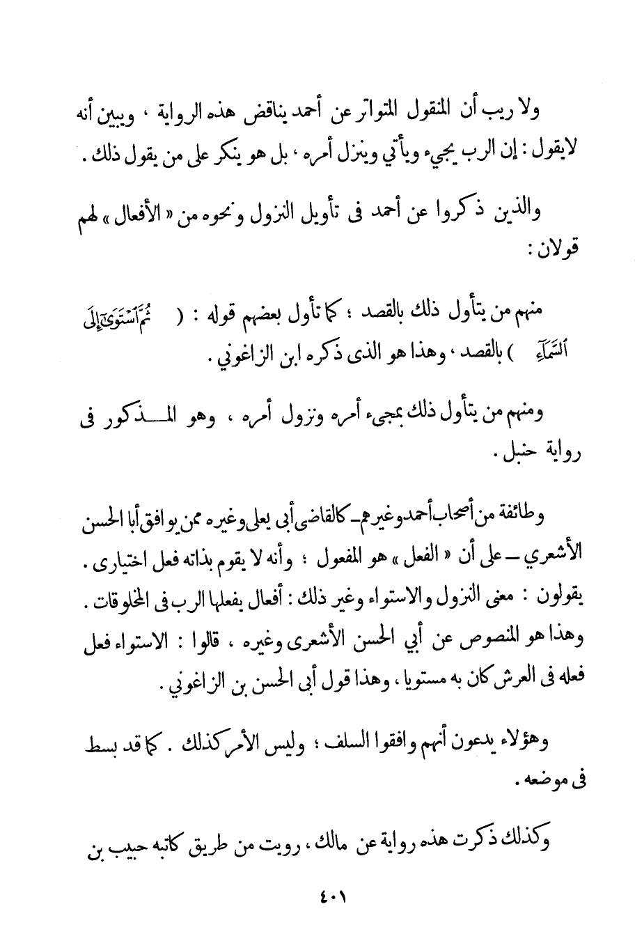 وَلَا رَيْبَ أَنَّ الْمَنْقُولَ الْمُتَوَاتِرَ عَنْ أَحْمَد يُنَاقِضُ هَذِهِ الرِّوَايَةَ وَيُبَيِّنُ أَنَّهُ لَا يَقُولُ: إنَّ الرَّبَّ يَجِيءُ وَيَأْتِي وَيَنْزِلُ أَمْرُهُ بَلْ هُوَ يُنْكِرُ عَلَى مَنْ يَقُولُ ذَلِكَ. وَاَلَّذِينَ ذَكَرُوا عَنْ أَحْمَد فِي تَأْوِيلِ النُّزُولِ وَنَحْوِهِ مِنْ " الْأَفْعَالِ " لَهُمْ قَوْلَانِ: مِنْهُمْ مَنْ يَتَأَوَّلُ ذَلِكَ بِالْقَصْدِ؛ كَمَا تَأَوَّلَ بَعْضُهُمْ قَوْلَهُ: {ثُمَّ اسْتَوَى إلَى السَّمَاءِ} بِالْقَصْدِ وَهَذَا هُوَ الَّذِي ذَكَرَهُ ابْنُ الزَّاغُونِي. وَمِنْهُمْ مَنْ يَتَأَوَّلُ ذَلِكَ بِمَجِيءِ أَمْرِهِ وَنُزُولِ أَمْرِهِ وَهُوَ الْمَذْكُورُ فِي رِوَايَةِ حَنْبَلٍ. وَطَائِفَةٌ مِنْ أَصْحَابِ أَحْمَد وَغَيْرُهُمْ - كَالْقَاضِي أَبِي يَعْلَى وَغَيْرِهِ مِمَّنْ يُوَافِقُ أَبَا الْحَسَنِ الْأَشْعَرِيَّ - عَلَى أَنَّ " الْفِعْلَ " هُوَ الْمَفْعُولُ؛ وَأَنَّهُ لَا يَقُومُ بِذَاتِهِ فِعْلٌ اخْتِيَارِيٌّ. يَقُولُونَ: مَعْنَى النُّزُولِ وَالِاسْتِوَاءِ وَغَيْرِ ذَلِكَ: أَفْعَالٌ يَفْعَلُهَا الرَّبُّ فِي الْمَخْلُوقَاتِ. وَهَذَا هُوَ الْمَنْصُوصُ عَنْ أَبِي الْحَسَنِ الْأَشْعَرِيِّ وَغَيْرِهِ قَالُوا: الِاسْتِوَاءُ فِعْلٌ فَعَلَهُ فِي الْعَرْشِ كَانَ بِهِ مُسْتَوِيًا وَهَذَا قَوْلُ أَبِي الْحَسَنِ بْنِ الزَّاغُونِي. وَهَؤُلَاءِ يَدَّعُونَ أَنَّهُمْ وَافَقُوا السَّلَفَ؛ وَلَيْسَ الْأَمْرُ كَذَلِكَ. كَمَا قَدْ بُسِطَ فِي مَوْضِعِهِ. وَكَذَلِكَ ذُكِرَتْ هَذِهِ رِوَايَةً عَنْ مَالِكٍ رُوِيَتْ مِنْ طَرِيقِ كَاتِبِهِ حَبِيبِ بْنِ