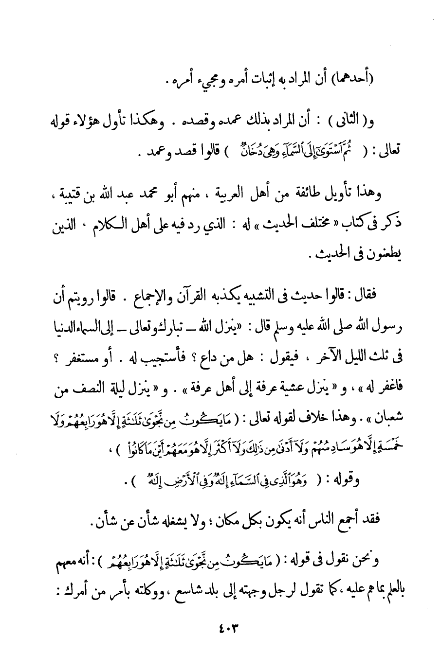 أَحَدُهُمَا: أَنَّ الْمُرَادَ بِهِ إثْبَاتُ أَمْرِهِ وَمَجِيءُ أَمْرِهِ. والثَّانِي: أَنَّ الْمُرَادَ بِذَلِكَ عَمْدُهُ وَقَصْدُهُ. وَهَكَذَا تَأَوَّلَ هَؤُلَاءِ قَوْله تَعَالَى {ثُمَّ اسْتَوَى إلَى السَّمَاءِ وَهِيَ دُخَانٌ} قَالُوا قَصَدَ وَعَمَدَ. وَهَذَا تَأْوِيلُ طَائِفَةٍ مِنْ أَهْلِ الْعَرَبِيَّةِ مِنْهُمْ أَبُو مُحَمَّدٍ عَبْدُ اللَّهِ بْنُ قُتَيْبَةَ ذَكَرَ فِي كِتَابِ " مُخْتَلِفِ الْحَدِيثِ " لَهُ: الَّذِي رَدَّ فِيهِ عَلَى أَهْلِ الْكَلَامِ الَّذِينَ يَطْعَنُونَ فِي الْحَدِيثِ. فَقَالَ: قَالُوا حَدِيثٌ فِي التَّشْبِيهِ يُكَذِّبُهُ الْقُرْآنُ وَالْإِجْمَاعُ. قَالُوا رَوَيْتُمْ أَنَّ رَسُولَ اللَّهِ صَلَّى اللَّهُ عَلَيْهِ وَسَلَّمَ قَالَ: {يَنْزِلُ اللَّهُ - تَبَارَكَ وَتَعَالَى - إلَى السَّمَاءِ الدُّنْيَا فِي ثُلُثِ اللَّيْلِ الْآخِرِ فَيَقُولُ: هَلْ مِنْ دَاعٍ؟ فَأَسْتَجِيبَ لَهُ. أَوْ مُسْتَغْفِرٍ؟ فَأَغْفِرَ لَهُ} و {يَنْزِلُ عَشِيَّةَ عَرَفَةَ إلَى أَهْلِ عَرَفَةَ} . و {يَنْزِلُ لَيْلَةَ النِّصْفِ مِنْ شَعْبَانَ} . وَهَذَا خِلَافٌ لِقَوْلِهِ تَعَالَى {مَا يَكُونُ مِنْ نَجْوَى ثَلَاثَةٍ إلَّا هُوَ رَابِعُهُمْ وَلَا خَمْسَةٍ إلَّا هُوَ سَادِسُهُمْ وَلَا أَدْنَى مِنْ ذَلِكَ وَلَا أَكْثَرَ إلَّا هُوَ مَعَهُمْ أَيْنَ مَا كَانُوا} وَقَوْلُهُ: {وَهُوَ الَّذِي فِي السَّمَاءِ إلَهٌ وَفِي الْأَرْضِ إلَهٌ} . فَقَدْ أَجْمَعَ النَّاسُ أَنَّهُ يَكُونُ بِكُلِّ مَكَانٍ. وَلَا يَشْغَلُهُ شَأْنٌ عَنْ شَأْنٍ. وَنَحْنُ نَقُولُ فِي قَوْلِهِ: {مَا يَكُونُ مِنْ نَجْوَى ثَلَاثَةٍ إلَّا هُوَ رَابِعُهُمْ} أَنَّهُ مَعَهُمْ بِالْعِلْمِ بِمَا هُمْ عَلَيْهِ كَمَا تَقُولُ لِرَجُلِ وَجَّهْته إلَى بَلَدٍ شَاسِعٍ وَوَكَّلْته بِأَمْرِ مِنْ أَمْرِك: