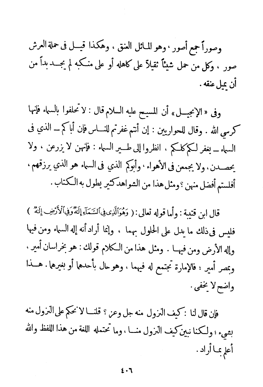 وَصَوْرًا جَمْعُ أَصْوَرَ وَهُوَ الْمَائِلُ الْعُنُقِ وَهَكَذَا قِيلَ فِي حَمَلَةِ الْعَرْشِ صُورٌ وَكُلُّ مَنْ حَمَلَ شَيْئًا ثَقِيلًا عَلَى كَاهِلِهِ أَوْ عَلَى مَنْكِبِهِ لَمْ يَجِدْ بُدًّا مِنْ أَنْ يَمِيلَ عُنُقُهُ. وَفِي " الْإِنْجِيلِ " أَنَّ الْمَسِيحَ عَلَيْهِ السَّلَامُ قَالَ: لَا تَحْلِفُوا بِالسَّمَاءِ فَإِنَّهَا كُرْسِيُّ اللَّهِ. وَقَالَ لِلْحَوَارِيِّينَ: إنْ أَنْتُمْ غَفَرْتُمْ لِلنَّاسِ فَإِنَّ أَبَاكُمْ - الَّذِي فِي السَّمَاءِ - يَغْفِرُ لَكُمْ كُلِّكُمْ اُنْظُرُوا إلَى طَيْرِ السَّمَاءِ: فَإِنَّهُنَّ لَا يَزْرَعْنَ وَلَا يَحْصُدْنَ وَلَا يَجْمَعْنَ فِي الْأَهْوَاءِ وَأَبُوكُمْ الَّذِي فِي السَّمَاءِ هُوَ الَّذِي يَرْزُقُهُمْ أَفَلَسْتُمْ أَفْضَلَ مِنْهُنَّ؟ وَمِثْلُ هَذَا مِنْ الشَّوَاهِدِ كَثِيرٌ يَطُولُ بِهِ الْكِتَابُ. قَالَ ابْنُ قُتَيْبَةَ: وَأَمَّا قَوْله تَعَالَى {وَهُوَ الَّذِي فِي السَّمَاءِ إلَهٌ وَفِي الْأَرْضِ إلَهٌ} فَلَيْسَ فِي ذَلِكَ مَا يَدُلُّ عَلَى الْحُلُولِ بِهِمَا وَإِنَّمَا أَرَادَ أَنَّهُ إلَهُ السَّمَاءِ وَمَنْ فِيهَا وَإِلَهُ الْأَرْضِ وَمَنْ فِيهَا. وَمِثْلُ هَذَا مِنْ الْكَلَامِ قَوْلُك: هُوَ بِخُرَاسَانَ أَمِيرٌ وَبِمِصْرِ أَمِيرٌ؛ فَالْإِمَارَةُ تَجْتَمِعُ لَهُ فِيهِمَا وَهُوَ حَالٌّ بِأَحَدِهِمَا أَوْ بِغَيْرِهِمَا. هَذَا وَاضِحٌ لَا يَخْفَى. فَإِنْ قَالَ لَنَا: كَيْفَ النُّزُولُ مِنْهُ جَلَّ وَعَزَّ؟ قُلْنَا لَا نَحْكُمُ عَلَى النُّزُولِ مِنْهُ بِشَيْءِ؛ وَلَكِنَّا نُبَيِّنُ كَيْفَ النُّزُولُ مِنَّا وَمَا تَحْتَمِلُهُ اللُّغَةُ مِنْ هَذَا اللَّفْظِ وَاَللَّهُ أَعْلَمُ بِمَا أَرَادَ.