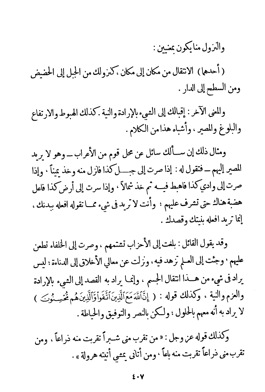 وَالنُّزُولُ مِنَّا يَكُونُ بِمَعْنَيَيْنِ: أَحَدُهُمَا: الِانْتِقَالُ مِنْ مَكَانٍ إلَى مَكَانٍ كَنُزُولِك مِنْ الْجَبَلِ إلَى الْحَضِيضِ وَمِنْ السَّطْحِ إلَى الدَّارِ. وَالْمَعْنَى الْآخَرُ: إقْبَالُك إلَى الشَّيْءِ بِالْإِرَادَةِ وَالنِّيَّةِ. كَذَلِكَ الْهُبُوطُ وَالِارْتِفَاعُ وَالْبُلُوغُ وَالْمَصِيرُ وَأَشْبَاهُ هَذَا مِنْ الْكَلَامِ. وَمِثَالُ ذَلِكَ إنْ سَأَلَك سَائِلٌ عَنْ مَحَلِّ قَوْمٍ مِنْ الْأَعْرَابِ - وَهُوَ لَا يُرِيدُ الْمَصِيرَ إلَيْهِمْ - فَتَقُولُ لَهُ: إذَا صِرْت إلَى جَبَلِ كَذَا فَانْزِلْ مِنْهُ وَخُذْ يَمِينًا وَإِذَا صِرْت إلَى وَادِي كَذَا فَاهْبِطْ فِيهِ ثُمَّ خُذْ شِمَالًا وَإِذَا سِرْت إلَى أَرْضِ كَذَا فَاعْلُ هَضْبَةً هُنَاكَ حَتَّى تُشْرِفَ عَلَيْهِمْ؛ وَأَنْتَ لَا تُرِيدُ فِي شَيْءٍ مِمَّا تَقُولُهُ افْعَلْهُ بِبَدَنِك إنَّمَا تُرِيدُ افْعَلْهُ بِنِيَّتِك وَقَصْدِك. وَقَدْ يَقُولُ الْقَائِلُ: بَلَغْت إلَى الْأَحْزَابِ تَشْتُمُهُمْ وَصِرْت إلَى الْخُلَفَاءِ تَطْعَنُ عَلَيْهِمْ وَجِئْت إلَى الْعِلْمِ تَزْهَدُ فِيهِ وَنَزَلْت عَنْ مَعَالِي الْأَخْلَاقِ إلَى الدَّنَاءَةِ؛ لَيْسَ يُرَادُ فِي شَيْءٍ مِنْ هَذَا انْتِقَالَ الْجِسْمِ وَإِنَّمَا يُرَادُ بِهِ الْقَصْدُ إلَى الشَّيْءِ بِالْإِرَادَةِ وَالْعَزْمِ وَالنِّيَّةِ، وَكَذَلِكَ قَوْلُهُ: {إنَّ اللَّهَ مَعَ الَّذِينَ اتَّقَوْا وَالَّذِينَ هُمْ مُحْسِنُونَ} لَا يُرَادُ بِهِ أَنَّهُ مَعَهُمْ بِالْحُلُولِ؛ وَلَكِنْ بِالنَّصْرِ وَالتَّوْفِيقِ وَالْحِيَاطَةِ. وَكَذَلِكَ قَوْلُهُ عَزَّ وَجَلَّ: {مَنْ تَقَرَّبَ مِنِّي شِبْرًا تَقَرَّبْت مِنْهُ ذِرَاعًا وَمَنْ تَقَرَّبَ مِنِّي ذِرَاعًا تَقَرَّبْت مِنْهُ بَاعًا وَمَنْ أَتَانِي يَمْشِي أَتَيْته هَرْوَلَةً} .