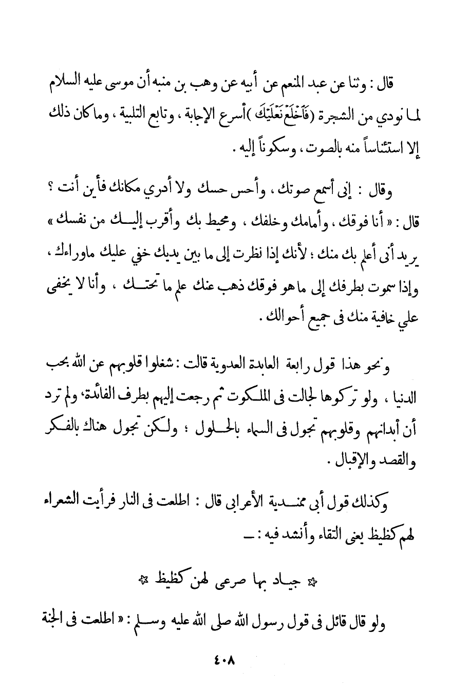 قَالَ: ثَنَا عَنْ عَبْدِ الْمُنْعِمِ عَنْ أَبِيهِ عَنْ وَهْبِ بْنِ مُنَبِّهٍ {أَنَّ مُوسَى عَلَيْهِ السَّلَامُ لَمَّا نُودِيَ مِنْ الشَّجَرَةِ {فَاخْلَعْ نَعْلَيْكَ} أَسْرَعَ الْإِجَابَةَ وَتَابَعَ التَّلْبِيَةَ وَمَا كَانَ ذَلِكَ إلَّا اسْتِئْنَاسًا مِنْهُ بِالصَّوْتِ وَسُكُونًا إلَيْهِ. وَقَالَ: إنِّي أَسْمَعُ صَوْتَك وَأَحُسُّ حِسَّك وَلَا أَدْرِي مَكَانَك فَأَيْنَ أَنْتَ؟ . قَالَ: أَنَا فَوْقَك وَأَمَامَك وَخَلْفَك وَمُحِيطٌ بِك وَأَقْرَبُ إلَيْك مِنْ نَفْسِك} يُرِيدُ أَنِّي أَعْلَمُ بِك مِنْك؛ لِأَنَّك إذَا نَظَرْت إلَى مَا بَيْنَ يَدَيْك خَفِيَ عَلَيْك مَا وَرَاءَك وَإِذَا سَمَوْت بِطَرْفِك إلَى مَا هُوَ فَوْقَك ذَهَبَ عَنْك عِلْمُ مَا تَحْتَك وَأَنَا لَا يَخْفَى عَلَيَّ خَافِيَةٌ مِنْك فِي جَمِيعِ أَحْوَالِك. وَنَحْوُ هَذَا قَوْلُ رَابِعَةَ الْعَابِدَةِ العدوية قَالَتْ: شَغَلُوا قُلُوبَهُمْ عَنْ اللَّهِ بِحُبِّ الدُّنْيَا وَلَوْ تَرَكُوهَا لَجَالَتْ فِي الْمَلَكُوتِ ثُمَّ رَجَعَتْ إلَيْهِمْ بِطَرْفِ الْفَائِدَةِ وَلَمْ تُرِدْ أَنَّ أَبْدَانَهُمْ وَقُلُوبَهُمْ تَجُولُ فِي السَّمَاءِ بِالْحُلُولِ؛ وَلَكِنْ تَجُولُ هُنَاكَ بِالْفِكْرِ وَالْقَصْدِ وَالْإِقْبَالِ. وَكَذَلِكَ قَوْلُ أَبِي ممندية الْأَعْرَابِيِّ قَالَ: اطَّلَعْت فِي النَّارِ فَرَأَيْت الشُّعَرَاءَ لَهُمْ كظيظ يَعْنِي الْتِقَاءً وَأَنْشَدَ فِيهِ: - جِيَادٌ بِهَا صَرْعَى لَهُنَّ كظيظ وَلَوْ قَالَ قَائِلٌ فِي قَوْلِ رَسُولِ اللَّهِ صَلَّى اللَّهُ عَلَيْهِ وَسَلَّمَ {اطَّلَعْت فِي الْجَنَّةِ