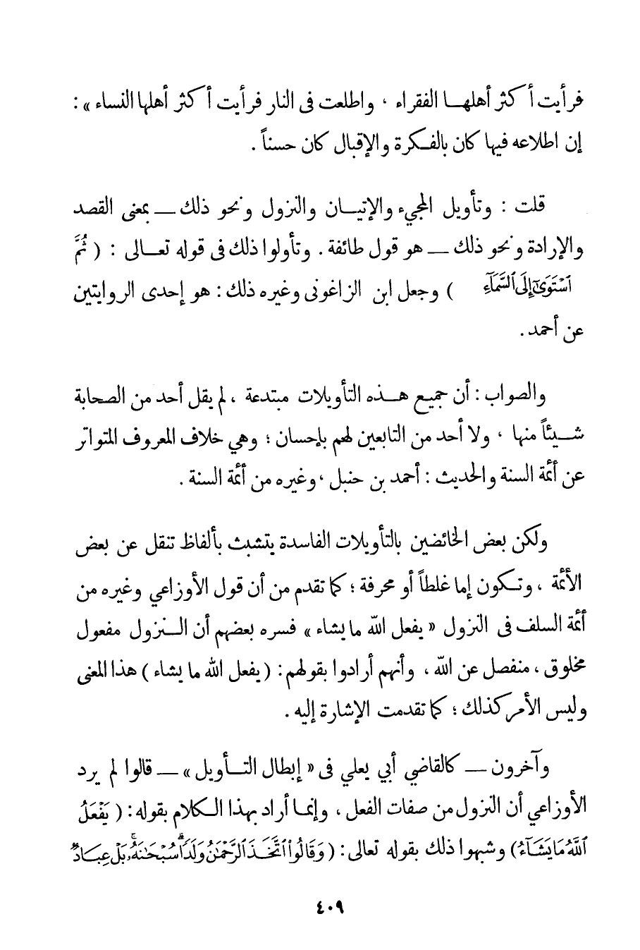 فَرَأَيْت أَكْثَرَ أَهْلِهَا الْفُقَرَاءَ وَاطَّلَعْت فِي النَّارِ فَرَأَيْت أَكْثَرَ أَهْلِهَا النِّسَاءَ} إنَّ اطِّلَاعَهُ فِيهَا كَانَ بِالْفِكْرَةِ وَالْإِقْبَالِ كَانَ حَسَنًا. قُلْت: وَتَأْوِيلُ الْمَجِيءِ وَالْإِتْيَانِ وَالنُّزُولِ وَنَحْوِ ذَلِكَ - بِمَعْنَى الْقَصْدِ وَالْإِرَادَةِ وَنَحْوِ ذَلِكَ - هُوَ قَوْلُ طَائِفَةٍ. وَتَأَوَّلُوا ذَلِكَ فِي قَوْله تَعَالَى {ثُمَّ اسْتَوَى إلَى السَّمَاءِ} وَجَعَلَ ابْنُ الزَّاغُونِي وَغَيْرُهُ ذَلِكَ: هُوَ إحْدَى الرِّوَايَتَيْنِ عَنْ أَحْمَد. وَالصَّوَابُ: أَنَّ جَمِيعَ هَذِهِ التَّأْوِيلَاتِ مُبْتَدَعَةٌ لَمْ يَقُلْ أَحَدٌ مِنْ الصَّحَابَةِ شَيْئًا مِنْهَا وَلَا أَحَدٌ مِنْ التَّابِعِينَ لَهُمْ بِإِحْسَانِ؛ وَهِيَ خِلَافُ الْمَعْرُوفِ الْمُتَوَاتِرُ عَنْ أَئِمَّةِ السُّنَّةِ وَالْحَدِيثِ: أَحْمَد بْنِ حَنْبَلٍ وَغَيْرِهِ مِنْ أَئِمَّةِ السُّنَّةِ. وَلَكِنَّ بَعْضَ الْخَائِضِينَ بِالتَّأْوِيلَاتِ الْفَاسِدَةِ يَتَشَبَّثُ بِأَلْفَاظِ تُنْقَلُ عَنْ بَعْضِ الْأَئِمَّةِ وَتَكُونُ إمَّا غَلَطًا أَوْ مُحَرَّفَةً؛ كَمَا تَقَدَّمَ مِنْ أَنَّ قَوْلَ الأوزاعي وَغَيْرِهِ مِنْ أَئِمَّةِ السَّلَفِ فِي النُّزُولِ " يَفْعَلُ اللَّهُ مَا يَشَاءُ " فَسَّرَهُ بَعْضُهُمْ أَنَّ النُّزُولَ مَفْعُولٌ مَخْلُوقٌ مُنْفَصِلٌ عَنْ اللَّهِ وَأَنَّهُمْ أَرَادُوا بِقَوْلِهِمْ: (يَفْعَلُ اللَّهُ مَا يَشَاءُ) هَذَا الْمَعْنَى وَلَيْسَ الْأَمْرُ كَذَلِكَ؛ كَمَا تَقَدَّمَتْ الْإِشَارَةُ إلَيْهِ. [وَآخَرُونَ - كَالْقَاضِي أَبِي يَعْلَى فِي " إبْطَالِ التَّأْوِيلِ " - قَالُوا لَمْ يُرِدْ الأوزاعي أَنَّ النُّزُولَ مِنْ صِفَاتِ الْفِعْلِ وَإِنَّمَا أَرَادَ بِهَذَا الْكَلَامِ بِقَوْلِهِ: يَفْعَلُ اللَّهُ مَا يَشَاءُ وَشَبَّهُوا ذَلِكَ (*) بِقَوْلِهِ تَعَالَى: {وَقَالُوا اتَّخَذَ الرَّحْمَنُ وَلَدًا سُبْحَانَهُ بَلْ