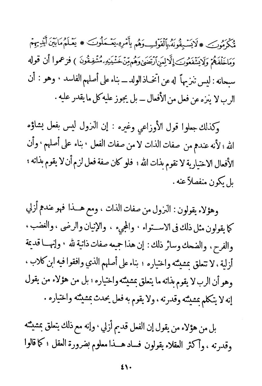عِبَادٌ مُكْرَمُونَ} {لَا يَسْبِقُونَهُ بِالْقَوْلِ وَهُمْ بِأَمْرِهِ يَعْمَلُونَ} {يَعْلَمُ مَا بَيْنَ أَيْدِيهِمْ وَمَا خَلْفَهُمْ وَلَا يَشْفَعُونَ إلَّا لِمَنِ ارْتَضَى وَهُمْ مِنْ خَشْيَتِهِ مُشْفِقُونَ} فَزَعَمُوا أَنَّ قَوْلَهُ " سُبْحَانَهُ ": لَيْسَ تَنْزِيهًا لَهُ عَنْ اتِّخَاذِ الْوَلَدِ] (*) - بِنَاءً عَلَى أَصْلِهِمْ الْفَاسِدِ وَهُوَ: أَنَّ الرَّبَّ لَا يُنَزَّهُ عَنْ فِعْلٍ مِنْ الْأَفْعَالِ - بَلْ يَجُوزُ عَلَيْهِ كُلُّ مَا يَقْدِرُ عَلَيْهِ. وَكَذَلِكَ جَعَلُوا قَوْلَ الأوزاعي وَغَيْرِهِ: إنَّ النُّزُولَ لَيْسَ بِفِعْلِ يَشَاؤُهُ اللَّهُ؛ لِأَنَّهُ عِنْدَهُمْ مِنْ صِفَاتِ الذَّاتِ لَا مِنْ صِفَاتِ الْفِعْلِ بِنَاءً عَلَى أَصْلِهِمْ وَأَنَّ الْأَفْعَالَ الِاخْتِيَارِيَّةَ لَا تَقُومُ بِذَاتِ اللَّهِ. فَلَوْ كَانَ صِفَةَ فِعْلٍ لَزِمَ أَنْ لَا يَقُومَ بِذَاتِهِ؛ بَلْ يَكُونُ مُنْفَصِلًا عَنْهُ. وَهَؤُلَاءِ يَقُولُونَ: النُّزُولُ مِنْ صِفَاتِ الذَّاتِ وَمَعَ هَذَا فَهُوَ عِنْدَهُمْ أَزَلِيٌّ كَمَا يَقُولُونَ مِثْلَ ذَلِكَ فِي الِاسْتِوَاءِ وَالْمَجِيءِ وَالْإِتْيَانِ وَالرِّضَى وَالْغَضَبِ وَالْفَرَحِ وَالضَّحِكِ وَسَائِرِ ذَلِكَ: إنَّ هَذَا جَمِيعَهُ صِفَاتٌ ذَاتِيَّةٌ لِلَّهِ وَإِنَّهَا قَدِيمَةٌ أَزَلِيَّةٌ لَا تَتَعَلَّقُ بِمَشِيئَتِهِ وَاخْتِيَارِهِ؛ بِنَاءً عَلَى أَصْلِهِمْ الَّذِي وَافَقُوا فِيهِ ابْنَ كُلَّابٍ وَهُوَ أَنَّ الرَّبَّ لَا يَقُومُ بِذَاتِهِ مَا يَتَعَلَّقُ بِمَشِيئَتِهِ وَاخْتِيَارِهِ؛ بَلْ مِنْ هَؤُلَاءِ مَنْ يَقُولُ إنَّهُ لَا يَتَكَلَّمُ بِمَشِيئَتِهِ وَقُدْرَتِهِ وَلَا يَقُومُ بِهِ فِعْلٌ يَحْدُثُ بِمَشِيئَتِهِ وَاخْتِيَارِهِ. بَلْ مِنْ هَؤُلَاءِ مَنْ يَقُولُ إنَّ الْفِعْلَ قَدِيمٌ أَزَلِيٌّ وَإِنَّهُ مَعَ ذَلِكَ يَتَعَلَّقُ بِمَشِيئَتِهِ وَقُدْرَتِهِ وَأَكْثَرُ الْعُقَلَاءِ يَقُولُونَ فَسَادُ هَذَا مَعْلُومٌ بِضَرُورَةِ الْعَقْلِ؛ كَمَا قَالُوا