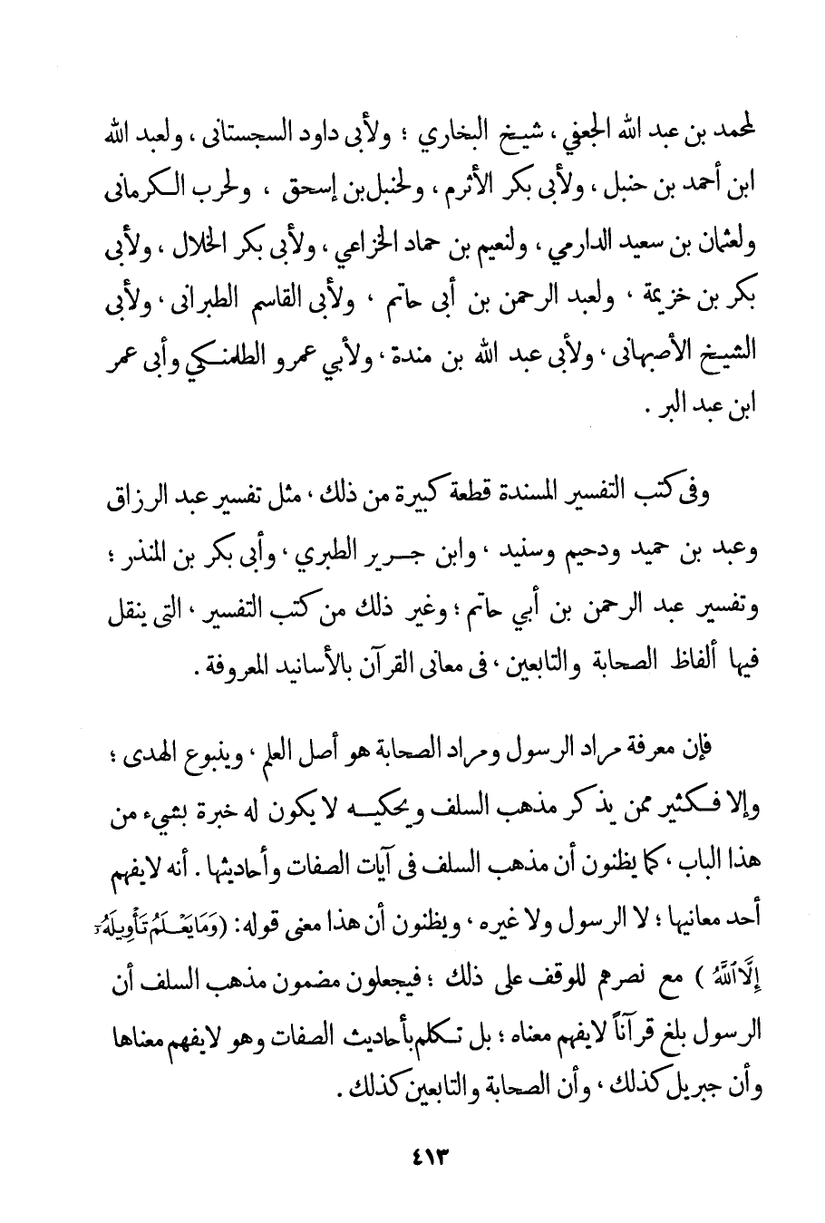 لِمُحَمَّدِ بْنِ عَبْدِ اللَّهِ الجعفي شَيْخِ الْبُخَارِيِّ؛ وَلِأَبِي دَاوُد السجستاني وَلِعَبْدِ اللَّهِ بْنِ أَحْمَد بْنِ حَنْبَلٍ وَلِأَبِي بَكْرٍ الْأَثْرَمِ وَلِحَنْبَلِ بْنِ إسْحَاقَ وَلِحَرْبِ الكرماني وَلِعُثْمَانِ بْنِ سَعِيدٍ الدارمي وَلِنُعَيْمِ بْنِ حَمَّادٍ الخزاعي وَلِأَبِي بَكْرٍ الْخَلَّالِ وَلِأَبِي بَكْرِ بْنِ خُزَيْمَة وَلِعَبْدِ الرَّحْمَنِ بْنِ أَبِي حَاتِمٍ وَلِأَبِي الْقَاسِمِ الطَّبَرَانِي وَلِأَبِي الشَّيْخِ الأصبهاني وَلِأَبِي عَبْدِ اللَّهِ بْنِ منده وَلِأَبِي عَمْرٍو الطلمنكي وَأَبِي عُمَرَ بْنِ عَبْدِ الْبَرِّ. وَفِي كُتُبِ التَّفْسِيرِ الْمُسْنَدَةِ قِطْعَةٌ كَبِيرَةٌ مِنْ ذَلِكَ مِثْلُ تَفْسِيرِ عَبْدِ الرَّزَّاقِ وَعَبْدِ بْنِ حميد ودحيم وسنيد وَابْنِ جَرِيرٍ الطبري وَأَبِي بَكْرِ بْنِ الْمُنْذِرِ؛ وَتَفْسِيرِ عَبْدِ الرَّحْمَنِ بْنِ أَبِي حَاتِمٍ؛ وَغَيْرِ ذَلِكَ مِنْ كُتُبِ التَّفْسِيرِ الَّتِي يُنْقَلُ فِيهَا أَلْفَاظُ الصَّحَابَةِ وَالتَّابِعِينَ فِي مَعَانِي الْقُرْآنِ بِالْأَسَانِيدِ الْمَعْرُوفَةِ. فَإِنَّ مَعْرِفَةَ مُرَادِ الرَّسُولِ وَمُرَادِ الصَّحَابَةِ هُوَ أَصْلُ الْعِلْمِ وَيَنْبُوعُ الْهُدَى؛ وَإِلَّا فَكَثِيرٌ مِمَّنْ يَذْكُرُ مَذْهَبَ السَّلَفِ وَيَحْكِيهِ لَا يَكُونُ لَهُ خِبْرَةٌ بِشَيْءِ مِنْ هَذَا الْبَابِ كَمَا يَظُنُّونَ أَنَّ مَذْهَبَ السَّلَفِ فِي آيَاتِ الصِّفَاتِ وَأَحَادِيثِهَا. أَنَّهُ لَا يَفْهَمُ أَحَدٌ مَعَانِيَهَا؛ لَا الرَّسُولُ وَلَا غَيْرُهُ وَيَظُنُّونَ أَنَّ هَذَا مَعْنَى قَوْلِهِ: {وَمَا يَعْلَمُ تَأْوِيلَهُ إلَّا اللَّهُ} مَعَ نَصْرِهِمْ لِلْوَقْفِ عَلَى ذَلِكَ؛ فَيَجْعَلُونَ مَضْمُونَ مَذْهَبِ السَّلَفِ أَنَّ الرَّسُولَ بَلَّغَ قُرْآنًا لَا يُفْهَمُ مَعْنَاهُ؛ بَلْ تَكَلَّمَ بِأَحَادِيثِ الصِّفَاتِ وَهُوَ لَا يَفْهَمُ مَعْنَاهَا وَأَنَّ جِبْرِيلَ كَذَلِكَ؛ وَأَنَّ الصَّحَابَةَ وَالتَّابِعِينَ كَذَلِكَ.