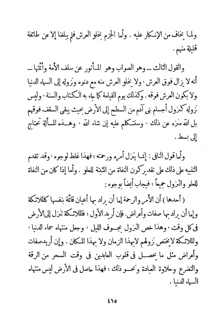 وَلِمَا يُخَافُ مِنْ الْإِنْكَارِ عَلَيْهِ. وَأَمَّا الْجَزْمُ بِخُلُوِّ الْعَرْشِ فَلَمْ يَبْلُغْنَا إلَّا عَنْ طَائِفَةٍ قَلِيلَةٍ مِنْهُمْ. وَالْقَوْلُ الثَّالِثُ - وَهُوَ الصَّوَابُ وَهُوَ الْمَأْثُورُ عَنْ سَلَفِ الْأُمَّةِ وَأَئِمَّتِهَا - أَنَّهُ لَا يَزَالُ فَوْقَ الْعَرْشِ وَلَا يَخْلُو الْعَرْشُ مِنْهُ مَعَ دُنُوِّهِ وَنُزُولِهِ إلَى السَّمَاءِ الدُّنْيَا وَلَا يَكُونُ الْعَرْشُ فَوْقَهُ. وَكَذَلِكَ يَوْمُ الْقِيَامَةِ كَمَا جَاءَ بِهِ الْكِتَابُ وَالسُّنَّةُ وَلَيْسَ نُزُولُهُ كَنُزُولِ أَجْسَامِ بَنِي آدَمَ مِنْ السَّطْحِ إلَى الْأَرْضِ بِحَيْثُ يَبْقَى السَّقْفُ فَوْقَهُمْ بَلْ اللَّهُ مُنَزَّهٌ عَنْ ذَلِكَ وَسَنَتَكَلَّمُ عَلَيْهِ إنْ شَاءَ اللَّهُ وَهَذِهِ الْمَسْأَلَةُ تَحْتَاجُ إلَى بَسْطٍ.