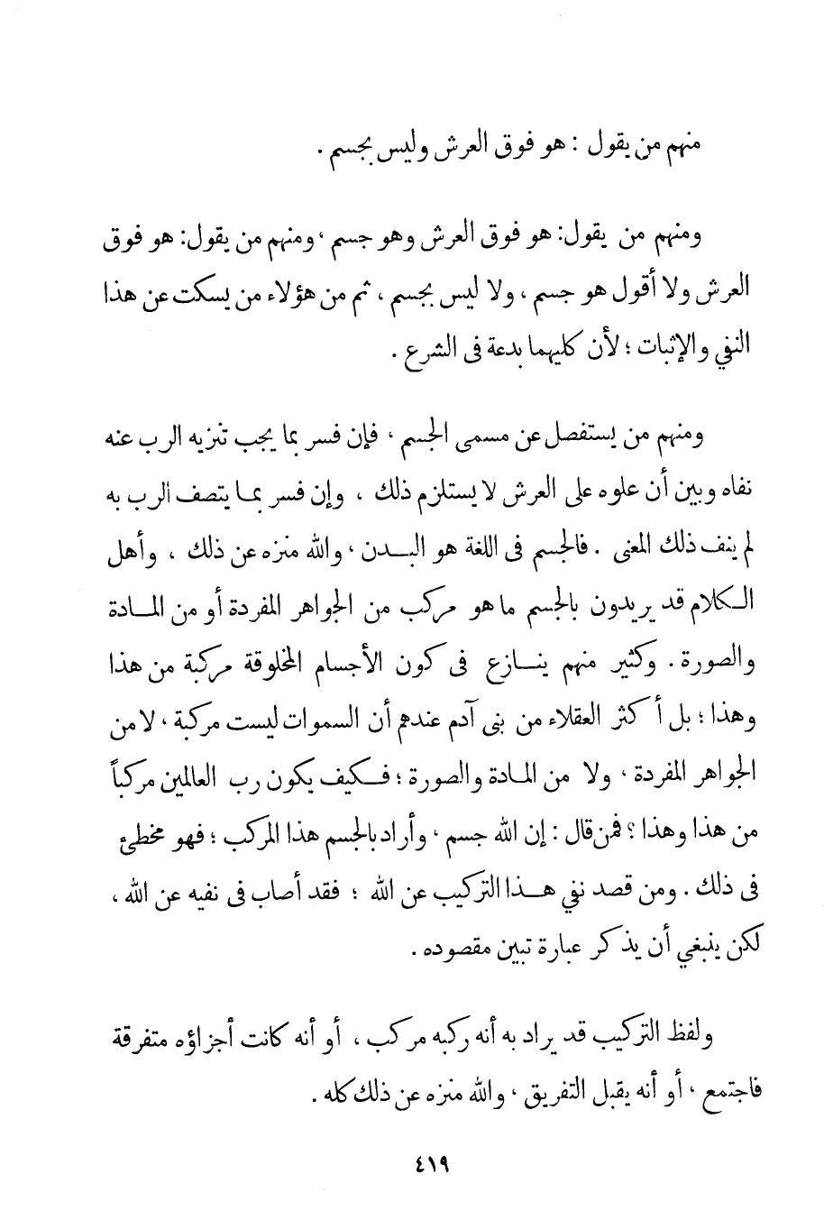 وَمِنْهُمْ مَنْ يَقُولُ: هُوَ فَوْقَ الْعَرْشِ وَلَا أَقُولُ هُوَ جِسْمٌ وَلَا لَيْسَ بِجِسْمِ ثُمَّ مِنْ هَؤُلَاءِ مَنْ يَسْكُتُ عَنْ هَذَا النَّفْيِ وَالْإِثْبَاتِ؛ لِأَنَّ كِلَيْهِمَا بِدْعَةٌ فِي الشَّرْعِ. وَمِنْهُمْ مَنْ يَسْتَفْصِلُ عَنْ مُسَمَّى الْجِسْمِ. فَإِنْ فَسَّرَ بِمَا يَجِبُ تَنْزِيهُ الرَّبِّ عَنْهُ نَفَاهُ وَبَيَّنَ أَنَّ عُلُوَّهُ عَلَى الْعَرْشِ لَا يَسْتَلْزِمُ ذَلِكَ وَإِنْ فَسَّرَ بِمَا يَتَّصِفُ الرَّبُّ بِهِ لَمْ يَنْفِ ذَلِكَ الْمَعْنَى. فَالْجِسْمُ فِي اللُّغَةِ هُوَ الْبَدَنُ وَاَللَّهُ مُنَزَّهٌ عَنْ ذَلِكَ وَأَهْلُ الْكَلَامِ قَدْ يُرِيدُونَ بِالْجِسْمِ مَا هُوَ مُرَكَّبٌ مِنْ الْجَوَاهِرِ الْمُفْرَدَةِ أَوْ مِنْ الْمَادَّةِ وَالصُّورَةِ. وَكَثِيرٌ مِنْهُمْ يُنَازِعُ فِي كَوْنِ الْأَجْسَامِ الْمَخْلُوقَةِ مُرَكَّبَةٌ مِنْ هَذَا وَهَذَا؛ بَلْ أَكْثَرُ الْعُقَلَاءِ مِنْ بَنِي آدَمَ عِنْدَهُمْ أَنَّ السَّمَوَاتِ لَيْسَتْ مُرَكَّبَةً لَا مِنْ الْجَوَاهِرِ الْمُفْرَدَةِ وَلَا مِنْ الْمَادَّةِ وَالصُّورَةِ؛ فَكَيْفَ يَكُونُ رَبُّ الْعَالَمِينَ مُرَكَّبًا مِنْ هَذَا وَهَذَا؟ فَمَنْ قَالَ: إنَّ اللَّهَ جِسْمٌ وَأَرَادَ بِالْجِسْمِ هَذَا الْمُرَكَّبَ؛ فَهُوَ مُخْطِئٌ فِي ذَلِكَ. وَمَنْ قَصَدَ نَفْيَ هَذَا التَّرْكِيبِ عَنْ اللَّهِ؛ فَقَدْ أَصَابَ فِي نَفْيِهِ عَنْ اللَّهِ لَكِنْ يَنْبَغِي أَنْ يَذْكُرَ عِبَارَةً تُبَيِّنُ مَقْصُودَهُ. وَلَفْظُ التَّرْكِيبِ قَدْ يُرَادُ بِهِ أَنَّهُ رَكَّبَهُ مُرَكَّبٍ أَوْ أَنَّهُ كَانَتْ أَجْزَاؤُهُ مُتَفَرِّقَةً فَاجْتَمَعَ أَوْ أَنَّهُ يَقْبَلُ التَّفْرِيقَ وَاَللَّهُ مُنَزَّهٌ عَنْ ذَلِكَ كُلِّهِ.