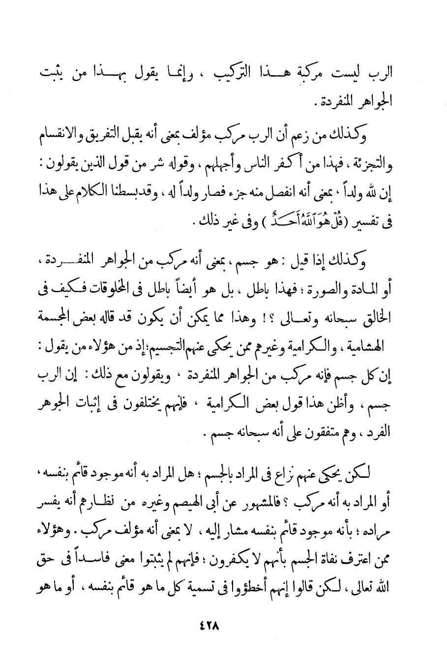الرَّبِّ لَيْسَتْ مُرَكَّبَةً هَذَا التَّرْكِيبَ وَإِنَّمَا يَقُولُ بِهَذَا مَنْ يُثْبِتُ الْجَوَاهِرَ الْمُنْفَرِدَةَ.