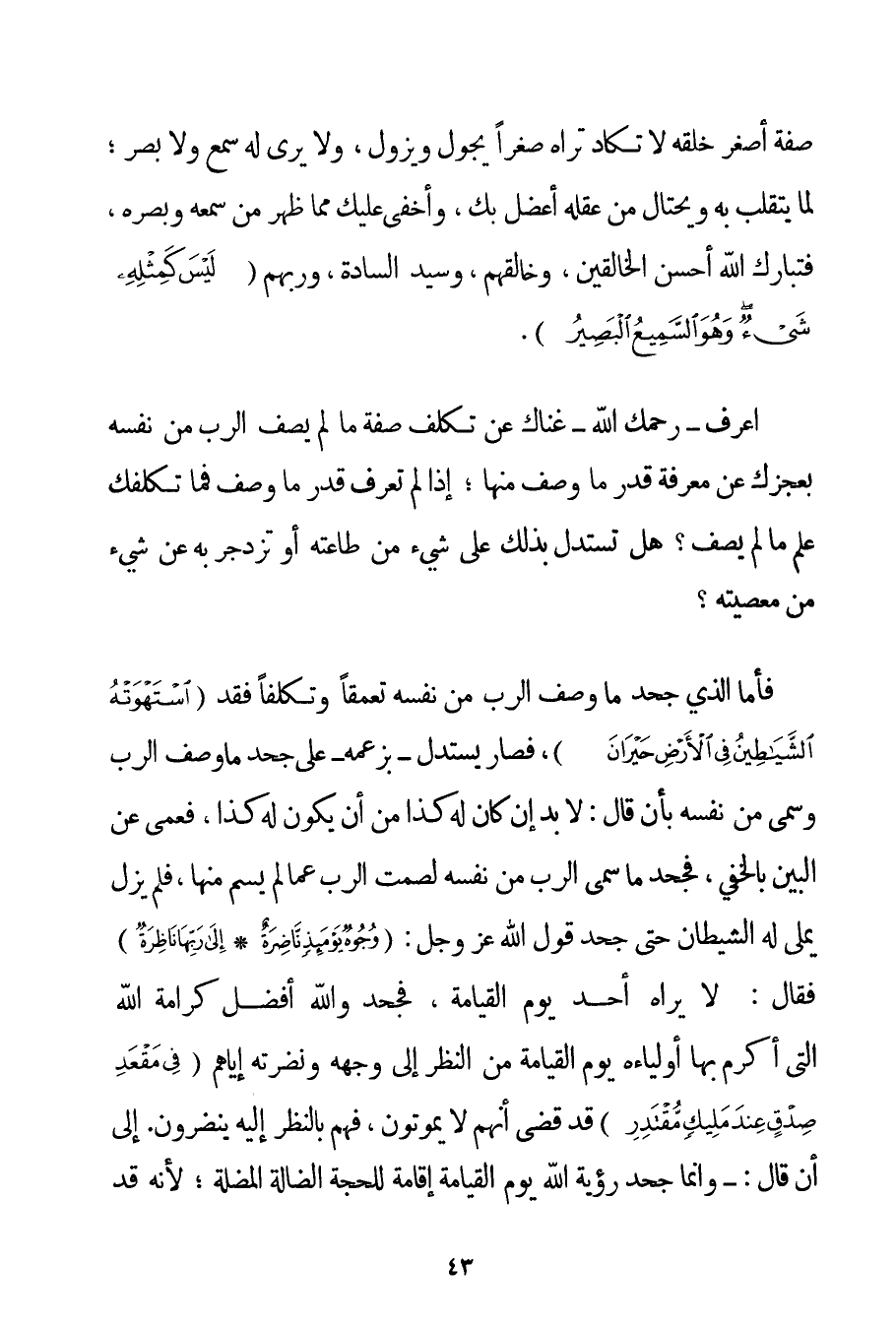 صِفَةِ أَصْغَرِ خَلْقِهِ لَا تَكَادُ تَرَاهُ صِغَرًا يَجُولُ وَيَزُولُ وَلَا يُرَى لَهُ سَمْعٌ وَلَا بَصَرٌ؛ لِمَا يَتَقَلَّبُ بِهِ وَيَحْتَالُ مِنْ عَقْلِهِ أَعْضَلُ بِك وَأَخْفَى عَلَيْك مِمَّا ظَهَرَ مِنْ سَمْعِهِ وَبَصَرِهِ فَتَبَارَكَ اللَّهُ أَحْسَنُ الْخَالِقِينَ وَخَالِقُهُمْ وَسَيِّدُ السَّادَةِ وَرَبُّهُمْ {لَيْسَ كَمِثْلِهِ شَيْءٌ وَهُوَ السَّمِيعُ الْبَصِيرُ} . اعْرِفْ - رَحِمَك اللَّهُ - غِنَاك عَنْ تَكَلُّفِ صِفَةِ مَا لَمْ يَصِفْ الرَّبُّ مِنْ نَفْسِهِ بِعَجْزِك عَنْ مَعْرِفَةِ قَدْرِ مَا وَصَفَ مِنْهَا؛ إذَا لَمْ تَعْرِفْ قَدْرَ مَا وَصَفَ فَمَا تُكَلِّفُك عِلْمَ مَا لَمْ يَصِفْ؟ هَلْ تَسْتَدِلُّ بِذَلِكَ عَلَى شَيْءٍ مِنْ طَاعَتِهِ أَوْ تَزْدَجِرُ بِهِ عَنْ شَيْءٍ مِنْ مَعْصِيَتِهِ؟ فَأَمَّا الَّذِي جَحَدَ مَا وَصَفَ الرَّبُّ مِنْ نَفْسِهِ تَعَمُّقًا وَتَكَلُّفًا فَقَدَ {اسْتَهْوَتْهُ الشَّيَاطِينُ فِي الْأَرْضِ حَيْرَانَ} فَصَارَ يَسْتَدِلُّ - بِزَعْمِهِ - عَلَى جَحْدِ مَا وَصَفَ الرَّبُّ وَسَمَّى مِنْ نَفْسِهِ بِأَنْ قَالَ: لَا بُدَّ إنْ كَانَ لَهُ كَذَا مِنْ أَنْ يَكُونَ لَهُ كَذَا فَعَمَى عَنْ الْبَيْنِ بِالْخَفِيِّ فَجَحَدَ مَا سَمَّى الرَّبُّ مِنْ نَفْسِهِ لِصَمْتِ الرَّبِّ عَمَّا لَمْ يُسَمِّ مِنْهَا فَلَمْ يَزَلْ يُمْلِي لَهُ الشَّيْطَانُ حَتَّى جَحَدَ قَوْلَ اللَّهِ عَزَّ وَجَلَّ: {وُجُوهٌ يَوْمَئِذٍ نَاضِرَةٌ} {إلَى رَبِّهَا نَاظِرَةٌ} فَقَالَ: لَا يَرَاهُ أَحَدٌ يَوْمَ الْقِيَامَةِ فَجَحَدَ وَاَللَّهِ أَفْضَلَ كَرَامَةِ اللَّهِ الَّتِي أَكْرَمَ بِهَا أَوْلِيَاءَهُ يَوْمَ الْقِيَامَةِ مِنْ النَّظَرِ إلَى وَجْهِهِ وَنَضْرَتِهِ إيَّاهُمْ {فِي مَقْعَدِ صِدْقٍ عِنْدَ مَلِيكٍ مُقْتَدِرٍ} قَدْ قَضَى أَنَّهُمْ لَا يَمُوتُونَ فَهُمْ بِالنَّظَرِ إلَيْهِ يَنْضُرُونَ. إلَى أَنْ قَالَ: - وَإِنَّمَا جَحَدَ رُؤْيَةَ اللَّهِ يَوْمَ الْقِيَامَةِ إقَامَةً لِلْحُجَّةِ الضَّالَّةِ الْمُضِلَّةِ؛ لِأَنَّهُ