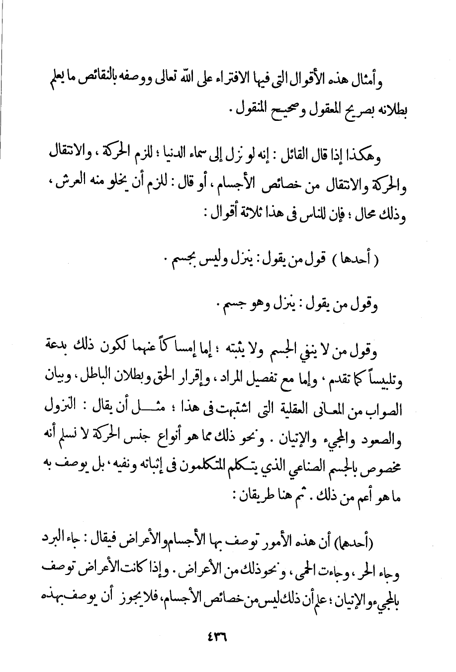 وَهَكَذَا إذَا قَالَ الْقَائِلُ: إنَّهُ لَوْ نَزَلَ إلَى سَمَاءِ الدُّنْيَا؛ لَلَزِمَ الْحَرَكَةُ وَالِانْتِقَالُ وَالْحَرَكَةُ وَالِانْتِقَالُ مِنْ خَصَائِصِ الْأَجْسَامِ أَوْ قَالَ: لَلَزِمَ أَنْ يَخْلُوَ مِنْهُ الْعَرْشُ وَذَلِكَ مُحَالٌ؛ فَإِنَّ لِلنَّاسِ فِي هَذَا ثَلَاثَةَ أَقْوَالٍ. (أَحَدُهَا قَوْلُ مَنْ يَقُولُ: يَنْزِلُ وَلَيْسَ بِجِسْمِ. وَقَوْلُ مَنْ يَقُولُ: يَنْزِلُ وَهُوَ جِسْمٌ. وَقَوْلُ مَنْ لَا يَنْفِي الْجِسْمَ وَلَا يُثْبِتُهُ؛ إمَّا إمْسَاكًا عَنْهُمَا لِكَوْنِ ذَلِكَ بِدْعَةً وَتَلْبِيسًا كَمَا تَقَدَّمَ وَإِمَّا مَعَ تَفْصِيلِ الْمُرَادِ وَإِقْرَارِ الْحَقِّ وَبُطْلَانِ الْبَاطِلِ وَبَيَانِ الصَّوَابِ مِنْ الْمَعَانِي الْعَقْلِيَّةِ الَّتِي اشْتَبَهَتْ فِي هَذَا؛ مِثْلَ أَنْ يُقَالَ: النُّزُولُ وَالصُّعُودُ وَالْمَجِيءُ وَالْإِتْيَانُ وَنَحْوُ ذَلِكَ مِمَّا هُوَ أَنْوَاعُ جِنْسِ الْحَرَكَةِ لَا نُسَلِّمُ أَنَّهُ مَخْصُوصٌ بِالْجِسْمِ الصِّنَاعِيِّ الَّذِي يَتَكَلَّمُ الْمُتَكَلِّمُونَ فِي إثْبَاتِهِ وَنَفْيِهِ بَلْ يُوصَفُ بِهِ مَا هُوَ أَعَمُّ مِنْ ذَلِكَ. ثُمَّ هُنَا طَرِيقَانِ: أَحَدُهُمَا أَنَّ هَذِهِ الْأُمُورَ تُوصَفُ بِهَا الْأَجْسَامُ وَالْأَعْرَاضُ فَيُقَالُ: جَاءَ الْبَرْدُ وَجَاءَ الْحَرُّ وَجَاءَتْ الْحُمَّى وَنَحْوُ ذَلِكَ مِنْ الْأَعْرَاضِ. وَإِذَا كَانَتْ الْأَعْرَاضُ تُوصَفُ بِالْمَجِيءِ وَالْإِتْيَانِ؛ عُلِمَ أَنَّ ذَلِكَ لَيْسَ مِنْ خَصَائِصِ الْأَجْسَامِ فَلَا يَجُوزُ أَنْ يُوصَفَ بِهَذِهِ