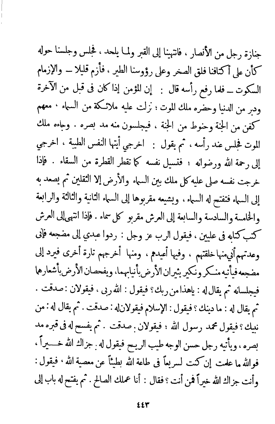 جِنَازَةِ رَجُلٍ مِنْ الْأَنْصَارِ فَانْتَهَيْنَا إلَى الْقَبْرِ وَلَمَّا يُلْحَدْ فَجَلَسَ وَجَلَسْنَا حَوْلَهُ كَأَنَّ عَلَى أَكْتَافِنَا فَلَقَ الصَّخْرِ وَعَلَى رُءُوسِنَا الطَّيْرَ فَأَزِمَ قَلِيلًا - وَالْإِزْمَامُ السُّكُوتُ - فَلَمَّا رَفَعَ رَأْسَهُ قَالَ: إنَّ الْمُؤْمِنَ إذَا كَانَ فِي قُبُلٍ مِنْ الْآخِرَةِ وَدُبُرٍ مِنْ الدُّنْيَا وَحَضَرَهُ مَلَكُ الْمَوْتِ؛ نَزَلَتْ عَلَيْهِ مَلَائِكَةٌ مِنْ السَّمَاءِ مَعَهُمْ كَفَنٌ مِنْ الْجَنَّةِ وَحَنُوطٌ مِنْ الْجَنَّةِ فَيَجْلِسُونَ مِنْهُ مَدَّ بَصَرِهِ. وَجَاءَهُ مَلَكُ الْمَوْتِ فَجَلَسَ عِنْدَ رَأْسِهِ ثُمَّ يَقُولُ: اُخْرُجِي أَيَّتُهَا النَّفْسُ الطَّيِّبَةُ اُخْرُجِي إلَى رَحْمَةِ اللَّهِ وَرِضْوَانِهِ؛ فَتَسِيلُ نَفْسُهُ كَمَا تَقْطُرُ الْقَطْرَةُ مِنْ السِّقَاءِ. فَإِذَا خَرَجَتْ نَفْسُهُ صَلَّى عَلَيْهِ كُلُّ مَلَكٍ بَيْنَ السَّمَاءِ وَالْأَرْضِ إلَّا الثَّقَلَيْنِ ثُمَّ يَصْعَدُ بِهِ إلَى السَّمَاءِ فَتُفْتَحُ لَهُ السَّمَاءُ وَيُشَيِّعُهُ مُقَرَّبُوهَا إلَى السَّمَاءِ الثَّانِيَةِ وَالثَّالِثَةِ وَالرَّابِعَةِ وَالْخَامِسَةِ وَالسَّادِسَةِ وَالسَّابِعَةِ إلَى الْعَرْشِ مُقَرَّبُو كُلِّ سَمَاءٍ. فَإِذَا انْتَهَى إلَى الْعَرْشِ كُتِبَ كِتَابُهُ فِي عِلِّيِّينَ فَيَقُولُ الرَّبُّ عَزَّ وَجَلَّ: رُدُّوا عَبْدِي إلَى مَضْجَعِهِ فَإِنِّي وَعَدْتهمْ أَنِّي مِنْهَا خَلَقْتهمْ وَفِيهَا أُعِيدُهُمْ وَمِنْهَا أُخْرِجُهُمْ تَارَةً أُخْرَى فَيُرَدُّ إلَى مَضْجَعِهِ فَيَأْتِيهِ مُنْكَرٌ وَنَكِيرٌ يُثِيرَانِ الْأَرْضَ بِأَنْيَابِهِمَا وَيَفْحَصَانِ الْأَرْضَ بِأَشْعَارِهِمَا فَيُجْلِسَانِهِ ثُمَّ يُقَالُ لَهُ: يَا هَذَا مَنْ رَبُّك؟ فَيَقُولُ: اللَّهُ رَبِّي فَيَقُولَانِ: صَدَقْت. ثُمَّ يُقَالُ لَهُ: مَا دِينُك؟ فَيَقُولُ: الْإِسْلَامُ فَيَقُولَانِ لَهُ صَدَقْت. ثُمَّ يُقَالُ لَهُ مَنْ نَبِيُّك؟ فَيَقُولُ مُحَمَّدٌ رَسُولُ اللَّهِ؛ فَيَقُولَانِ: صَدَقْت. ثُمَّ يُفْسَحُ لَهُ فِي قَبْرِهِ مَدَّ بَصَرِهِ وَيَأْتِيهِ رَجُلٌ حَسَنُ الْوَجْهِ طَيِّبُ الرِّيحِ فَيَقُولُ لَهُ: جَزَاك اللَّهُ خَيْرًا فَوَاَللَّهِ مَا عَلِمْت إنْ كُنْت لَسَرِيعًا فِي طَاعَةِ اللَّهِ بَطِيئًا عَنْ مَعْصِيَةِ اللَّهِ فَيَقُولُ: وَأَنْتَ جَزَاك اللَّهُ خَيْرًا فَمَنْ أَنْتَ؟ فَقَالَ: أَنَا عَمَلُك الصَّالِحُ. ثُمَّ يُفْتَحُ لَهُ بَابٌ إلَى
