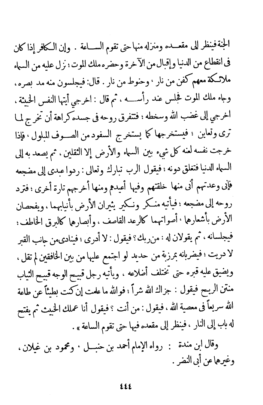 الْجَنَّةِ فَيَنْظُرُ إلَى مَقْعَدِهِ وَمَنْزِلِهِ مِنْهَا حَتَّى تَقُومَ السَّاعَةُ. وَإِنَّ الْكَافِرَ إذَا كَانَ فِي انْقِطَاعٍ مِنْ الدُّنْيَا وَإِقْبَالٍ مِنْ الْآخِرَةِ وَحَضَرَهُ مَلَكُ الْمَوْتِ؛ نَزَلَ عَلَيْهِ مِنْ السَّمَاءِ مَلَائِكَةٌ مَعَهُمْ كَفَنٌ مِنْ نَارٍ وَحَنُوطٌ مِنْ نَارٍ. قَالَ: فَيَجْلِسُونَ مِنْهُ مَدَّ بَصَرِهِ وَجَاءَ مَلَكُ الْمَوْتِ فَجَلَسَ عِنْدَ رَأْسِهِ ثُمَّ قَالَ: اُخْرُجِي أَيَّتُهَا النَّفْسُ الْخَبِيثَةُ اُخْرُجِي إلَى غَضَبِ اللَّهِ وَسَخَطِهِ؛ فَتَتَفَرَّقُ رُوحُهُ فِي جَسَدِهِ كَرَاهَةَ أَنْ تَخْرُجَ لِمَا تَرَى وَتُعَايِنُ؛ فَيَسْتَخْرِجُهَا كَمَا يُسْتَخْرَجُ السَّفُّودُ مِنْ الصُّوفِ الْمَبْلُولِ فَإِذَا خَرَجَتْ نَفْسُهُ لَعَنَهُ كُلُّ شَيْءٍ بَيْنَ السَّمَاءِ وَالْأَرْضِ إلَّا الثَّقَلَيْنِ ثُمَّ يُصْعَدُ بِهِ إلَى السَّمَاءِ الدُّنْيَا فَتُغْلَقُ دُونَهُ؛ فَيَقُولُ الرَّبُّ تَبَارَكَ وَتَعَالَى: رُدُّوا عَبْدِي إلَى مَضْجَعِهِ فَإِنِّي وَعَدْتهمْ أَنِّي مِنْهَا خَلَقْتهمْ وَفِيهَا أُعِيدُهُمْ وَمِنْهَا أُخْرِجُهُمْ تَارَةً أُخْرَى؛ فَتُرَدُّ رُوحُهُ إلَى مَضْجَعِهِ؛ فَيَأْتِيهِ مُنْكَرٌ وَنَكِيرٌ يُثِيرَانِ الْأَرْضَ بِأَنْيَابِهِمَا وَيَفْحَصَانِ الْأَرْضَ بِأَشْعَارِهِمَا أَصْوَاتُهُمَا كَالرَّعْدِ الْقَاصِفِ وَأَبْصَارُهُمَا كَالْبَرْقِ الْخَاطِفِ؛ فَيُجْلِسَانِهِ ثُمَّ يَقُولَانِ لَهُ: مَنْ رَبُّك؟ فَيَقُولُ: لَا أَدْرِي؛ فَيُنَادَى مِنْ جَانِبِ الْقَبْرِ لَا دَرَيْت؛ فَيَضْرِبَانِهِ بِمِرْزَبَّةِ مِنْ حَدِيدٍ لَوْ اجْتَمَعَ عَلَيْهَا مَنْ بَيْنَ الْخَافِقَيْنِ لَمْ تَقِلَّ وَيُضَيَّقُ عَلَيْهِ قَبْرُهُ حَتَّى تَخْتَلِفَ أَضْلَاعُهُ وَيَأْتِيهِ رَجُلٌ قَبِيحُ الْوَجْهِ قَبِيحُ الثِّيَابِ مُنْتِنُ الرِّيحِ فَيَقُولُ: جَزَاك اللَّهُ شَرًّا؛ فَوَاَللَّهِ مَا عَلِمْت إنْ كُنْت بَطِيئًا عَنْ طَاعَةِ اللَّهِ سَرِيعًا فِي مَعْصِيَةِ اللَّهِ فَيَقُولُ: مَنْ أَنْتَ؟ فَيَقُولُ أَنَا عَمَلُك الْخَبِيثُ ثُمَّ يُفْتَحُ لَهُ بَابٌ إلَى النَّارِ فَيَنْظُرُ إلَى مَقْعَدِهِ فِيهَا حَتَّى تَقُومَ السَّاعَةُ} . وَقَالَ ابْنُ منده: رَوَاهُ الْإِمَامُ أَحْمَد بْنُ حَنْبَلٍ وَمَحْمُودُ بْنُ غَيْلَانَ وَغَيْرُهُمَا عَنْ أَبِي النَّضْرِ.