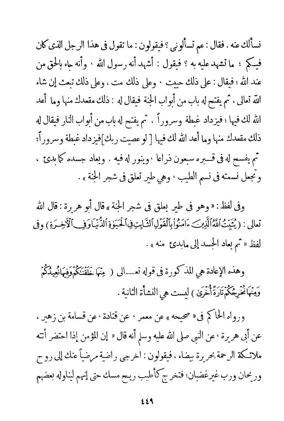 نَسْأَلُك عَنْهُ. فَقَالَ: عَمَّ تَسْأَلُونِي؟ فَيَقُولُونَ: مَا تَقُولُ فِي هَذَا الرَّجُلِ الَّذِي كَانَ فِيكُمْ؛ مَا تَشْهَدُ عَلَيْهِ بِهِ؟ فَيَقُولُ: أَشْهَدُ أَنَّهُ رَسُولُ اللَّهِ وَأَنَّهُ جَاءَ بِالْحَقِّ مِنْ عِنْدِ اللَّهِ؛ فَيُقَالُ: عَلَى ذَلِكَ حَيِيت وَعَلَى ذَلِكَ مُتّ وَعَلَى ذَلِكَ تُبْعَثُ إنْ شَاءَ اللَّهُ تَعَالَى ثُمَّ يُفْتَحُ لَهُ بَابًا مِنْ أَبْوَابِ الْجَنَّةِ فَيُقَالُ لَهُ: ذَلِكَ مَقْعَدُك مِنْهَا وَمَا أَعَدَّ اللَّهُ لَك فِيهَا؛ فَيَزْدَادُ غِبْطَةً وَسُرُورًا ثُمَّ يُفْتَحُ لَهُ بَابٌ مِنْ أَبْوَابِ النَّارِ فَيُقَالُ لَهُ ذَلِكَ مَقْعَدُك مِنْهَا وَمَا أَعَدَّ اللَّهُ لَك فِيهَا لَوْ عَصَيْت رَبَّك فَيَزْدَادُ غِبْطَةً وَسُرُورًا؛ ثُمَّ يُفْسَحُ لَهُ فِي قَبْرِهِ سَبْعُونَ ذِرَاعًا وَيُنَوَّرُ لَهُ فِيهِ. وَيُعَادُ جَسَدُهُ كَمَا بُدِئَ وَتُجْعَلُ نَسَمَتُهُ فِي نَسَمِ الطِّيبِ وَهِيَ طَيْرٌ تَعْلُقُ فِي شَجَرِ الْجَنَّةِ. وَفِي لَفْظٍ: وَهُوَ فِي طَيْرٍ يَعْلُقُ فِي شَجَرِ الْجَنَّةِ قَالَ أَبُو هُرَيْرَةَ: قَالَ اللَّهُ تَعَالَى: {يُثَبِّتُ اللَّهُ الَّذِينَ آمَنُوا بِالْقَوْلِ الثَّابِتِ فِي الْحَيَاةِ الدُّنْيَا وَفِي الْآخِرَةِ} وَفِي لَفْظٍ ثُمَّ يُعَادُ الْجَسَدُ إلَى مَا بُدِئَ مِنْهُ} . وَهَذِهِ الْإِعَادَةُ هِيَ الْمَذْكُورَةُ فِي قَوْله تَعَالَى {مِنْهَا خَلَقْنَاكُمْ وَفِيهَا نُعِيدُكُمْ وَمِنْهَا نُخْرِجُكُمْ تَارَةً أُخْرَى} لَيْسَتْ هِيَ النَّشْأَةَ الثَّانِيَةَ. وَرَوَاهُ الْحَاكِمُ فِي " صَحِيحِهِ " عَنْ مَعْمَرٍ عَنْ قتادة عَنْ قَسَامَةَ بْنِ زُهَيْرٍ عَنْ أَبِي هُرَيْرَةَ عَنْ النَّبِيِّ صَلَّى اللَّهُ عَلَيْهِ وَسَلَّمَ أَنَّهُ قَالَ {إنَّ الْمُؤْمِنَ إذَا اُحْتُضِرَ أَتَتْهُ مَلَائِكَةُ الرَّحْمَةِ بِحَرِيرَةِ بَيْضَاءَ فَيَقُولُونَ: اُخْرُجِي رَاضِيَةً مَرْضِيًّا عَنْك إلَى رَوْحٍ وَرَيْحَانٍ وَرَبٍّ غَيْرِ غَضْبَانَ؛ فَتَخْرُجُ كَأَطْيَبِ رِيحِ مِسْكٍ حَتَّى إنَّهُمْ لَيُنَاوِلُهُ بَعْضُهُمْ