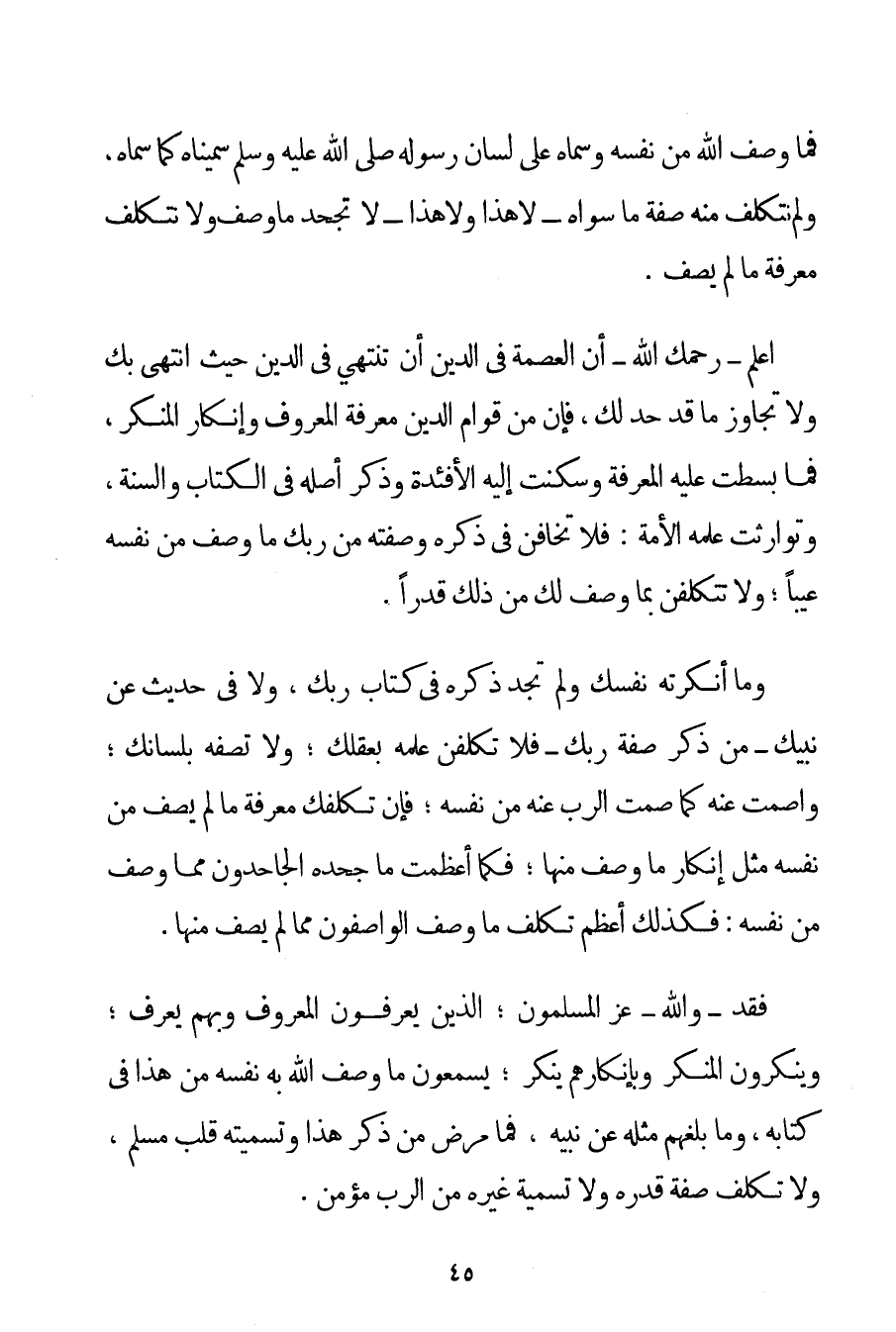 فَمَا وَصَفَ اللَّهُ مِنْ نَفْسِهِ وَسَمَّاهُ عَلَى لِسَانِ رَسُولِهِ صَلَّى اللَّهُ عَلَيْهِ وَسَلَّمَ سَمَّيْنَاهُ كَمَا سَمَّاهُ وَلَمْ نَتَكَلَّفْ مِنْهُ صِفَةَ مَا سِوَاهُ - لَا هَذَا وَلَا هَذَا - لَا نَجْحَدُ مَا وَصَفَ وَلَا نَتَكَلَّفُ مَعْرِفَةَ مَا لَمْ يَصِفْ. اعْلَمْ - رَحِمَك اللَّهُ - أَنَّ الْعِصْمَةَ فِي الدِّينِ أَنْ تَنْتَهِيَ فِي الدِّينِ حَيْثُ انْتَهَى بِك وَلَا تُجَاوِزْ مَا قَدْ حَدَّ لَك فَإِنَّ مِنْ قِوَامِ الدِّينِ مَعْرِفَةَ الْمَعْرُوفِ وَإِنْكَارَ الْمُنْكَرِ فَمَا بُسِطَتْ عَلَيْهِ الْمَعْرِفَةُ وَسَكَنَتْ إلَيْهِ الْأَفْئِدَةُ وَذُكِرَ أَصْلُهُ فِي الْكِتَابِ وَالسُّنَّةِ وَتَوَارَثَتْ عِلْمَهُ الْأُمَّةُ: فَلَا تَخَافَنَّ فِي ذِكْرِهِ وَصِفَتِهِ مِنْ رَبِّك مَا وَصَفَ مِنْ نَفْسِهِ عَيْبًا؛ وَلَا تَتَكَلَّفَنَّ بِمَا وُصِفَ لَك مِنْ ذَلِكَ قَدْرًا. وَمَا أَنْكَرَتْهُ نَفْسُك وَلَمْ تَجِدْ ذِكْرَهُ فِي كِتَابِ رَبِّك وَلَا فِي حَدِيثٍ عَنْ نَبِيِّك - مِنْ ذِكْرِ صِفَةِ رَبِّك - فَلَا تُكَلِّفَنَّ عَلَمَهُ بِعَقْلِك؛ وَلَا تَصِفْهُ بِلِسَانِك؛ وَاصْمُتْ عَنْهُ كَمَا صَمَتَ الرَّبُّ عَنْهُ مِنْ نَفْسِهِ فَإِنَّ تَكَلُّفَك مَعْرِفَةَ مَا لَمْ يَصِفْ مِنْ نَفْسِهِ مِثْلُ إنْكَارِ مَا وَصَفَ مِنْهَا؛ فَكَمَا أَعْظَمْت مَا جَحَدَهُ الْجَاحِدُونَ مِمَّا وَصَفَ مِنْ نَفْسِهِ: فَكَذَلِكَ أَعْظِمْ تَكَلُّفَ مَا وَصَفَ الْوَاصِفُونَ مِمَّا لَمْ يَصِفْ مِنْهَا. فَقَدَ - وَاَللَّهِ - عَزَّ الْمُسْلِمُونَ؛ الَّذِينَ يَعْرِفُونَ الْمَعْرُوفَ وَبِهِمْ يُعْرَفُ؛ وَيُنْكِرُونَ الْمُنْكَرَ وَبِإِنْكَارِهِمْ يُنْكَرُ؛ يَسْمَعُونَ مَا وَصَفَ اللَّهُ بِهِ نَفْسَهُ مِنْ هَذَا فِي كِتَابِهِ وَمَا بَلَغَهُمْ مِثْلُهُ عَنْ نَبِيِّهِ فَمَا مَرِضَ مِنْ ذِكْرِ هَذَا وَتَسْمِيَتِهِ قَلْبُ مُسْلِمٍ وَلَا تَكَلَّفَ صِفَةَ قَدْرِهِ وَلَا تَسْمِيَةَ غَيْرِهِ مِنْ الرَّبِّ مُؤْمِنٌ.