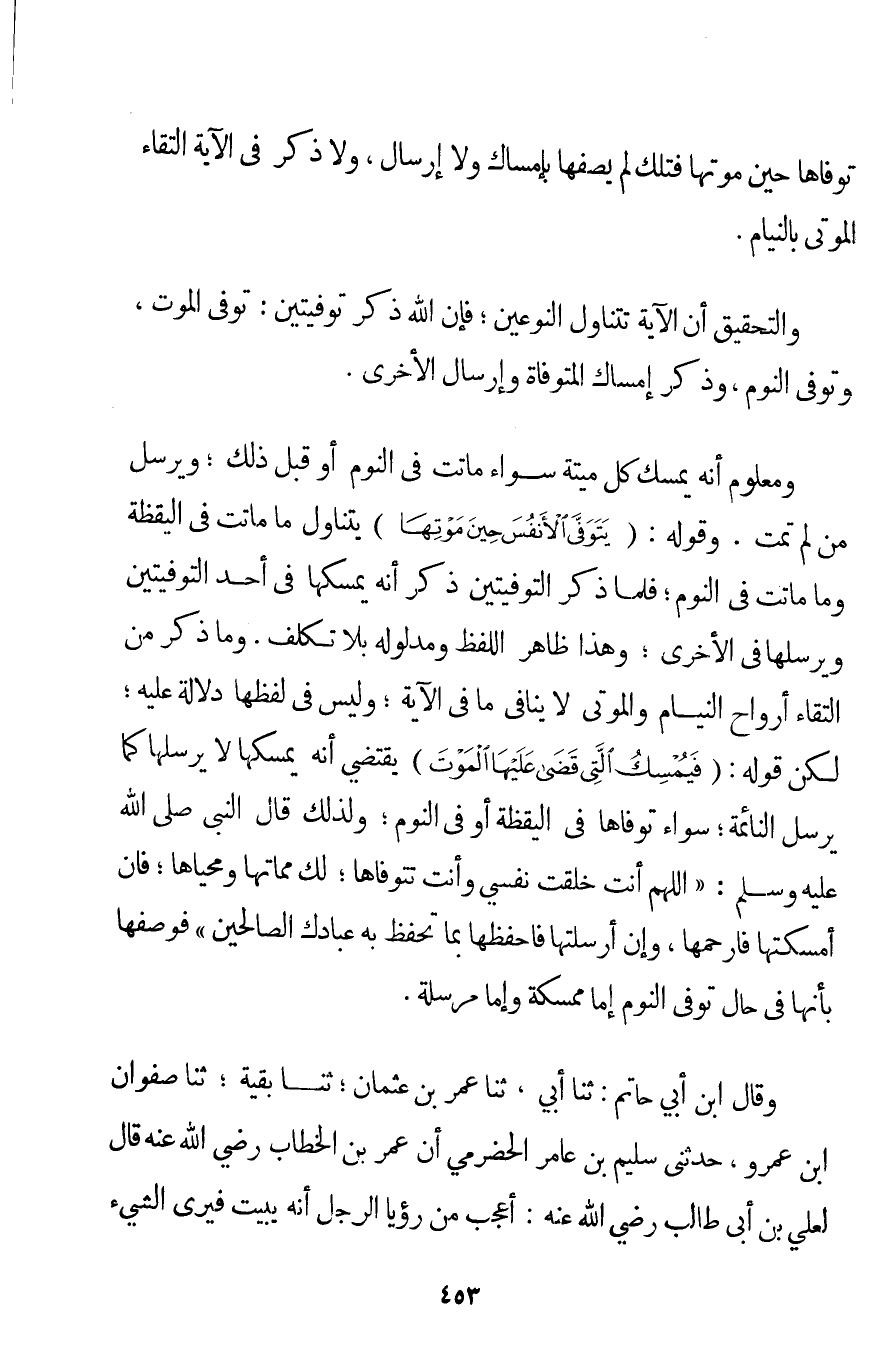 تَوَفَّاهَا حِينَ مَوْتِهَا فَتِلْكَ لَمْ يَصِفْهَا بِإِمْسَاكِ وَلَا إرْسَالٍ وَلَا ذَكَرَ فِي الْآيَةِ الْتِقَاءَ الْمَوْتَى بِالنِّيَامِ. وَالتَّحْقِيقُ أَنَّ الْآيَةَ تَتَنَاوَلُ النَّوْعَيْنِ؛ فَإِنَّ اللَّهَ ذَكَرَ تَوْفِيَتَيْنِ: تَوَفِّي الْمَوْتِ وَتَوَفِّي النَّوْمِ وَذَكَرَ إمْسَاكَ الْمُتَوَفَّاةِ وَإِرْسَالَ الْأُخْرَى. وَمَعْلُومٌ أَنَّهُ يُمْسِكُ كُلَّ مَيْتَةٍ سَوَاءٌ مَاتَتْ فِي النَّوْمِ أَوْ قَبْلَ ذَلِكَ؛ وَيُرْسِلُ مَنْ لَمْ تَمُتْ. وَقَوْلُهُ: {يَتَوَفَّى الْأَنْفُسَ حِينَ مَوْتِهَا} يَتَنَاوَلُ مَا مَاتَتْ فِي الْيَقَظَةِ وَمَا مَاتَتْ فِي النَّوْمِ؛ فَلَمَّا ذَكَرَ التَّوْفِيَتَيْنِ ذَكَرَ أَنَّهُ يُمْسِكُهَا فِي أَحَدِ التَّوْفِيَتَيْنِ وَيُرْسِلُهَا فِي الْأُخْرَى؛ وَهَذَا ظَاهِرُ اللَّفْظِ وَمَدْلُولُهُ بِلَا تَكَلُّفٍ. وَمَا ذَكَرَ مِنْ الْتِقَاءِ أَرْوَاحِ النِّيَامِ وَالْمَوْتَى لَا يُنَافِي مَا فِي الْآيَةِ؛ وَلَيْسَ فِي لَفْظِهَا دَلَالَةٌ عَلَيْهِ؛ لَكِنَّ قَوْلَهُ: {فَيُمْسِكُ الَّتِي قَضَى عَلَيْهَا الْمَوْتَ} يَقْتَضِي أَنَّهُ يُمْسِكُهَا لَا يُرْسِلُهَا كَمَا يُرْسِلُ النَّائِمَةَ؛ سَوَاءٌ تَوَفَّاهَا فِي الْيَقَظَةِ أَوْ فِي النَّوْمِ؛ وَلِذَلِكَ قَالَ النَّبِيُّ صَلَّى اللَّهُ عَلَيْهِ وَسَلَّمَ {اللَّهُمَّ أَنْتَ خَلَقْت نَفْسِي وَأَنْتَ تَتَوَفَّاهَا؛ لَك مَمَاتُهَا وَمَحْيَاهَا؛ فَإِنْ أَمْسَكْتهَا فَارْحَمْهَا وَإِنْ أَرْسَلْتهَا فَاحْفَظْهَا بِمَا تَحْفَظُ بِهِ عِبَادَك الصَّالِحِينَ} فَوَصَفَهَا بِأَنَّهَا فِي حَالِ تَوَفِّي النَّوْمِ إمَّا مُمْسَكَةٌ وَإِمَّا مُرْسَلَةٌ. وَقَالَ ابْنُ أَبِي حَاتِمٍ: ثنا أَبِي ثنا عُمَرُ بْنُ عُثْمَانَ؛ ثنا بَقِيَّةُ؛ ثنا صَفْوَانُ بْنُ عَمْرٍو حَدَّثَنِي سُلَيْمُ بْنُ عَامِرٍ الْحَضْرَمِيُّ أَنَّ عُمَرَ بْنَ الْخَطَّابِ رَضِيَ اللَّهُ عَنْهُ قَالَ لِعَلِيِّ بْنِ أَبِي طَالِبٍ رَضِيَ اللَّهُ عَنْهُ أَعْجَبُ مِنْ رُؤْيَا الرَّجُلِ أَنَّهُ يَبِيتُ فَيَرَى الشَّيْءَ