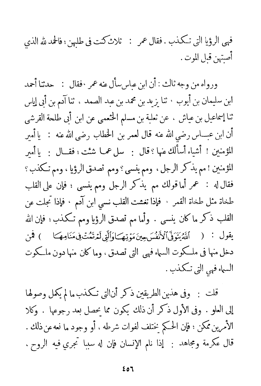 فَهِيَ الرُّؤْيَا الَّتِي تَكْذِبُ. فَقَالَ عُمَرُ: ثَلَاثٌ كُنْت فِي طَلَبِهِنَّ؛ فَالْحَمْدُ لِلَّهِ الَّذِي أَصَبْتهنَّ قَبْلَ الْمَوْتِ.} وَرَوَاهُ مِنْ وَجْهٍ ثَالِثٍ: أَنَّ ابْنَ عَبَّاسٍ سَأَلَ عَنْهُ عُمَرَ فَقَالَ: حَدَّثَنَا أَحْمَد بْنُ سُلَيْمَانَ بْنِ أَيُّوبَ ثَنَا يَزِيدُ بْنُ مُحَمَّدِ بْنِ عَبْدِ الصَّمَدِ ثَنَا آدَمَ بْنُ أَبِي إيَاسٍ ثَنَا إسْمَاعِيلُ بْنُ عَيَّاشٍ عَنْ ثَعْلَبَةَ بْنِ مُسْلِمٍ الخثعمي عَنْ ابْنِ أَبِي طَلْحَةَ الْقُرَشِيِّ أَنَّ ابْنَ عَبَّاسٍ رَضِيَ اللَّهُ عَنْهُ قَالَ لِعُمَرِ بْنِ الْخَطَّابِ رَضِيَ اللَّهُ عَنْهُ يَا أَمِيرَ الْمُؤْمِنِينَ أَشْيَاءُ أَسْأَلُك عَنْهَا؟ قَالَ: سَلْ عَمَّا شِئْت؛ فَقَالَ: يَا أَمِيرَ الْمُؤْمِنِينَ مِمَّ يَذْكُرُ الرَّجُلُ وَمِمَّ يَنْسَى؟ وَمِمَّ تَصْدُقُ الرُّؤْيَا وَمِمَّ تَكْذِبُ؟ فَقَالَ لَهُ عُمَرُ أَمَّا قَوْلُك مِمَّ يَذْكُرُ الرَّجُلُ وَمِمَّ يَنْسَى؛ فَإِنَّ عَلَى الْقَلْبِ طخاة مِثْلَ طخاة الْقَمَرِ فَإِذَا تَغَشَّتْ الْقَلْبَ نَسِيَ ابْنُ آدَمَ فَإِذَا تَجَلَّتْ عَنْ الْقَلْبِ ذَكَرَ مِمَّا كَانَ يَنْسَى. وَأَمَّا مِمَّ تَصْدُقُ الرُّؤْيَا وَمِمَّ تَكْذِبُ؛ فَإِنَّ اللَّهَ يَقُولُ: {اللَّهُ يَتَوَفَّى الْأَنْفُسَ حِينَ مَوْتِهَا وَالَّتِي لَمْ تَمُتْ فِي مَنَامِهَا} فَمَنْ دَخَلَ مِنْهَا فِي مَلَكُوتِ السَّمَاءِ فَهِيَ الَّتِي تَصْدُقُ وَمَا كَانَ مِنْهَا دُونَ مَلَكُوتِ السَّمَاءِ فَهِيَ الَّتِي تَكْذِبُ. قُلْت: وَفِي هَذَيْنِ الطَّرِيقَيْنِ ذَكَرَ أَنَّ الَّتِي تَكْذِبُ مَا لَمْ يَكْمُلْ وُصُولُهَا إلَى الْعُلُوِّ. وَفِي الْأَوَّلِ ذَكَرَ أَنَّ ذَلِكَ يَكُونُ مِمَّا يَحْصُلُ بَعْدَ رُجُوعِهَا. وَكِلَا الْأَمْرَيْنِ مُمْكِنٌ؛ فَإِنَّ الْحُكْمَ يَخْتَلِفُ لِفَوَاتِ شَرْطِهِ أَوْ وُجُودِ مَانِعِهِ عَنْ ذَلِكَ. قَالَ عِكْرِمَةُ وَمُجَاهِدٌ إذَا نَامَ الْإِنْسَانُ فَإِنَّ لَهُ سَبَبًا تَجْرِي فِيهِ الرُّوحُ