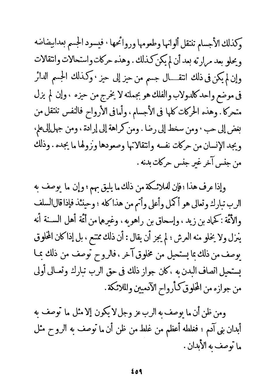 وَكَذَلِكَ الْأَجْسَامُ تَنْتَقِلُ أَلْوَانُهَا وَطَعُومُهَا وَرَوَائِحُهَا فَيَسُودُ الْجِسْمَ بَعْدَ ابْيِضَاضِهِ وَيَحْلُو بَعْدَ مَرَارَتِهِ بَعْدَ أَنْ لَمْ يَكُنْ كَذَلِكَ. وَهَذِهِ حَرَكَاتٌ وَاسْتِحَالَاتٌ وَانْتِقَالَاتٌ وَإِنْ لَمْ يَكُنْ فِي ذَلِكَ انْتِقَالُ جِسْمٍ مِنْ حَيِّزٍ إلَى حَيِّزٍ وَكَذَلِكَ الْجِسْمُ الدَّائِرُ فِي مَوْضِعٍ وَاحِدٍ كَالدُّولَابِ وَالْفَلَكِ هُوَ بِجُمْلَتِهِ لَا يَخْرُجُ مِنْ حَيِّزِهِ وَإِنْ لَمْ يَزَلْ مُتَحَرِّكًا. وَهَذِهِ الْحَرَكَاتُ كُلُّهَا فِي الْأَجْسَامِ وَأَمَّا فِي الْأَرْوَاحِ فَالنَّفْسُ تَنْتَقِلُ مِنْ بُغْضٍ إلَى حُبٍّ وَمِنْ سَخَطٍ إلَى رِضَا. وَمِنْ كَرَاهَةٍ إلَى إرَادَةٍ وَمِنْ جَهْلٍ إلَى عِلْمٍ وَيَجِدُ الْإِنْسَانُ مِنْ حَرَكَاتِ نَفْسِهِ وَانْتِقَالَاتِهَا وَصُعُودِهَا وَنُزُولِهَا مَا يَجِدُهُ. وَذَلِكَ مِنْ جِنْسٍ آخَرَ غَيْرِ جِنْسِ حَرَكَاتِ بَدَنِهِ. وَإِذَا عُرِفَ هَذَا؛ فَإِنَّ لِلْمَلَائِكَةِ مِنْ ذَلِكَ مَا يَلِيقُ بِهِمْ؛ وَإِنَّ مَا يُوصَفُ بِهِ الرَّبُّ تَبَارَكَ وَتَعَالَى هُوَ أَكْمَلُ وَأَعْلَى وَأَتَمُّ مِنْ هَذَا كُلِّهِ؛ وَحِينَئِذٍ فَإِذَا قَالَ السَّلَفُ وَالْأَئِمَّةُ: كَحَمَّادِ بْنِ زَيْدٍ وَإِسْحَاقَ بْنِ رَاهَوَيْه وَغَيْرِهِمَا مِنْ أَئِمَّةِ أَهْلِ السُّنَّةِ أَنَّهُ يَنْزِلُ وَلَا يَخْلُو مِنْهُ الْعَرْشُ؛ لَمْ يَجُزْ أَنْ يُقَالَ: إنَّ ذَلِكَ مُمْتَنِعٌ بَلْ إذَا كَانَ الْمَخْلُوقُ يُوصَفُ مِنْ ذَلِكَ بِمَا يَسْتَحِيلُ مِنْ مَخْلُوقٍ آخَرَ فَالرُّوحُ تُوصَفُ مِنْ ذَلِكَ بِمَا يَسْتَحِيلُ اتِّصَافُ الْبَدَنِ بِهِ كَانَ جَوَازُ ذَلِكَ فِي حَقِّ الرَّبِّ تَبَارَكَ وَتَعَالَى أَوْلَى مِنْ جَوَازِهِ مِنْ الْمَخْلُوقِ كَأَرْوَاحِ الْآدَمِيِّينَ وَالْمَلَائِكَةِ.