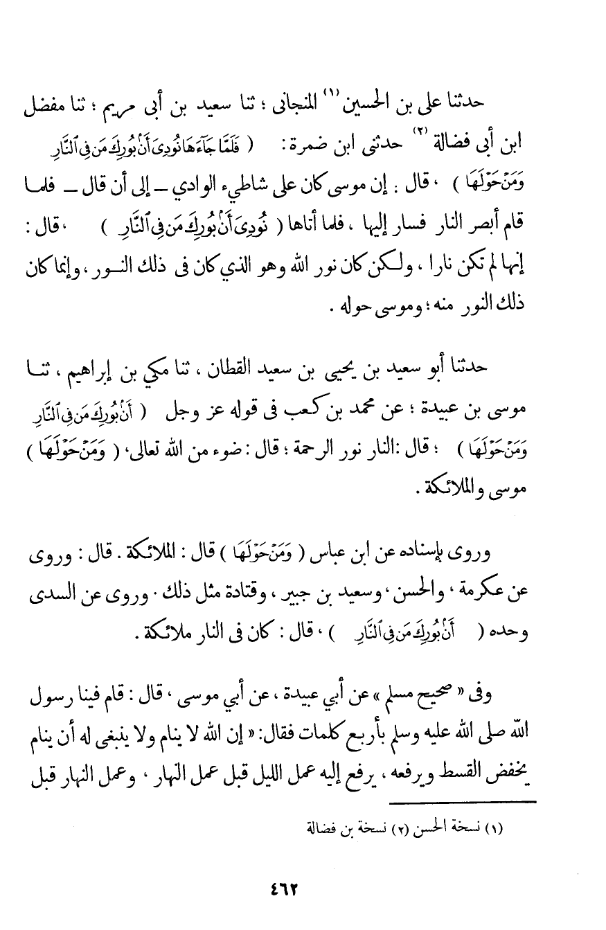حَدَّثَنَا عَلِيُّ بْنُ الْحُسَيْنِ المنجاني؛ ثَنَا سَعِيدُ بْنُ أَبِي مَرْيَمَ؛ ثَنَا مُفَضَّلُ بْنُ أَبِي فَضَالَةَ حَدَّثَنِي ابْنُ ضَمْرَةَ: {فَلَمَّا جَاءَهَا نُودِيَ أَنْ بُورِكَ مَنْ فِي النَّارِ وَمَنْ حَوْلَهَا} قَالَ: إنَّ مُوسَى كَانَ عَلَى شَاطِئِ الْوَادِي - إلَى أَنْ قَالَ - فَلَمَّا قَامَ أَبْصَرَ النَّارَ فَسَارَ إلَيْهَا فَلَمَّا أَتَاهَا {نُودِيَ أَنْ بُورِكَ مَنْ فِي النَّارِ} قَالَ: إنَّهَا لَمْ تَكُنْ نَارًا وَلَكِنْ كَانَ نُورَ اللَّهِ وَهُوَ الَّذِي كَانَ فِي ذَلِكَ النُّورِ وَإِنَّمَا كَانَ ذَلِكَ النُّورُ مِنْهُ؛ وَمُوسَى حَوْلَهُ. حَدَّثَنَا أَبُو سَعِيدِ بْنُ يَحْيَى بْنِ سَعِيدٍ الْقَطَّانُ ثَنَا مَكِّيُّ بْنُ إبْرَاهِيمَ ثَنَا مُوسَى بْنُ عُبَيْدَةَ؛ عَنْ مُحَمَّدِ بْنِ كَعْبٍ فِي قَوْلِهِ عَزَّ وَجَلَّ {أَنْ بُورِكَ مَنْ فِي النَّارِ وَمَنْ حَوْلَهَا} قَالَ: النَّارُ نُورُ الرَّحْمَةِ؛ قَالَ: ضَوْءٌ مِنْ اللَّهِ تَعَالَى {وَمَنْ حَوْلَهَا} مُوسَى وَالْمَلَائِكَةُ. وَرُوِيَ بِإِسْنَادِهِ عَنْ ابْنِ عَبَّاسٍ {وَمَنْ حَوْلَهَا} قَالَ: الْمَلَائِكَةُ. قَالَ: وَرُوِيَ عَنْ عِكْرِمَةَ وَالْحُسْنِ وَسَعِيدِ بْنِ جُبَيْرٍ وقتادة مِثْلُ ذَلِكَ. وَرُوِيَ عَنْ السدي وَحْدَهُ {أَنْ بُورِكَ مَنْ فِي النَّارِ} قَالَ: كَانَ فِي النَّارِ مَلَائِكَةٌ. وَفِي " صَحِيحِ مُسْلِمٍ " عَنْ أَبِي عُبَيْدَةَ {عَنْ أَبِي مُوسَى قَالَ: قَامَ فِينَا رَسُولُ اللَّهِ صَلَّى اللَّهُ عَلَيْهِ وَسَلَّمَ بِأَرْبَعِ كَلِمَاتٍ فَقَالَ: إنَّ اللَّهَ لَا يَنَامُ وَلَا يَنْبَغِي لَهُ أَنْ يَنَامَ يَخْفِضُ الْقِسْطَ وَيَرْفَعُهُ يُرْفَعُ إلَيْهِ عَمَلُ اللَّيْلِ قَبْلَ عَمَلِ النَّهَارِ وَعَمَلُ النَّهَارِ قَبْلَ