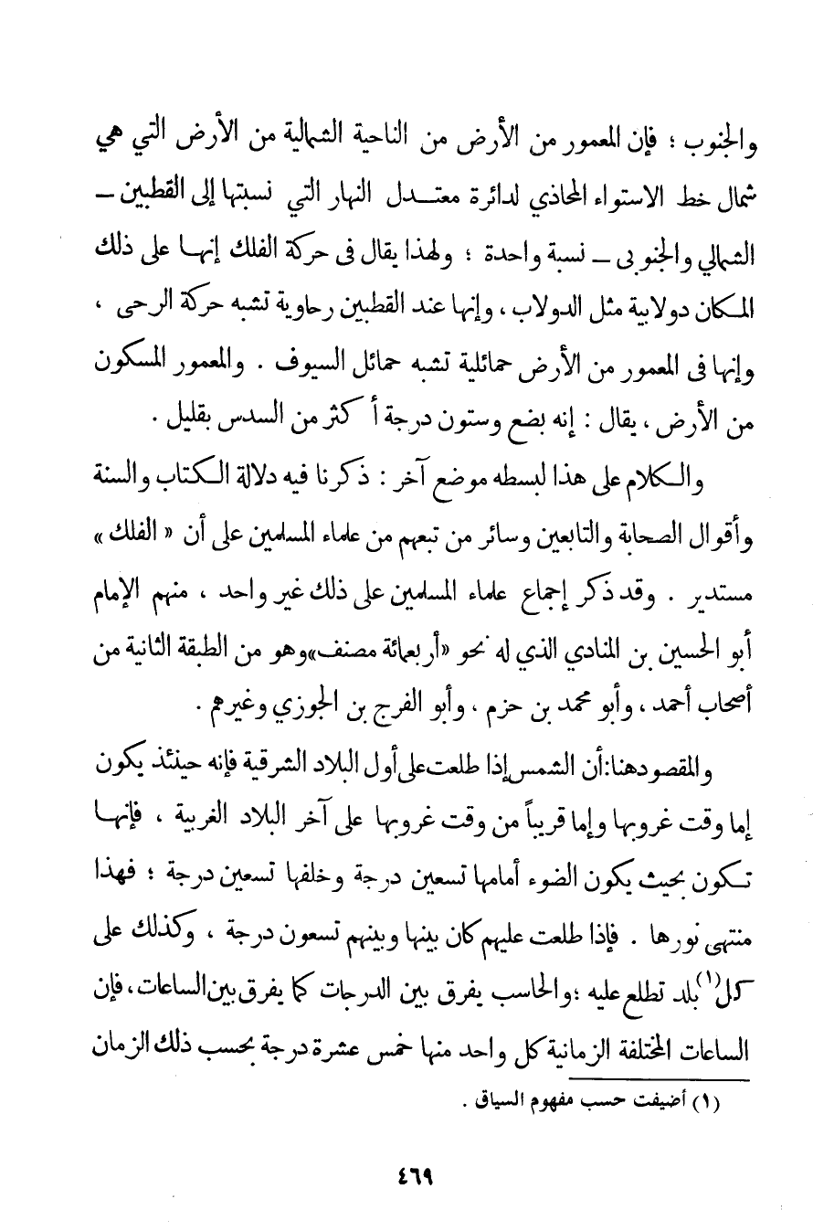 وَالْجَنُوبِ؛ فَإِنَّ الْمَعْمُورَ مِنْ الْأَرْضِ مِنْ النَّاحِيَةِ الشَّمَالِيَّةِ مِنْ الْأَرْضِ الَّتِي هِيَ شَمَالُ خَطِّ الِاسْتِوَاءِ الْمُحَاذِي لِدَائِرَةِ مُعْتَدِلِ النَّهَارِ الَّتِي نِسْبَتُهَا إلَى الْقُطْبَيْنِ - الشَّمَالِيِّ وَالْجَنُوبِيِّ - نِسْبَةٌ وَاحِدَةٌ؛ وَلِهَذَا يُقَالُ فِي حَرَكَةِ الْفَلَكِ إنَّهَا عَلَى ذَلِكَ الْمَكَانِ دولابية مِثْلُ الدُّولَابِ وَإِنَّهَا عِنْدَ الْقُطْبَيْنِ رحاوية تُشْبِهُ حَرَكَةَ الرَّحَى وَإِنَّهَا فِي الْمَعْمُورِ مِنْ الْأَرْضِ حمائلية تُشْبِهُ حَمَائِلَ السُّيُوفِ. وَالْمَعْمُورُ الْمَسْكُونُ مِنْ الْأَرْضِ يُقَالُ: إنَّهُ بِضْعٌ وَسِتُّونَ دَرَجَةً أَكْثَرُ مِنْ السُّدُسِ بِقَلِيلِ. وَالْكَلَامُ عَلَى هَذَا لِبَسْطِهِ مَوْضِعٌ آخَرُ: ذَكَرْنَا فِيهِ دِلَالَةَ الْكِتَابِ وَالسُّنَّةِ وَأَقْوَالَ الصَّحَابَةِ وَالتَّابِعِينَ وَسَائِرَ مَنْ تَبِعَهُمْ مِنْ عُلَمَاءِ الْمُسْلِمِينَ عَلَى أَنَّ " الْفَلَكَ " مُسْتَدِيرٌ. وَقَدْ ذَكَرَ إجْمَاعَ عُلَمَاءِ الْمُسْلِمِينَ عَلَى ذَلِكَ غَيْرُ وَاحِدٍ مِنْهُمْ الْإِمَامُ أَبُو الْحُسَيْنِ بْنُ الْمُنَادِي الَّذِي لَهُ نَحْوُ " أَرْبَعِمِائَةِ مُصَنَّفٍ " وَهُوَ مِنْ الطَّبَقَةِ الثَّانِيَةِ مِنْ أَصْحَابِ أَحْمَد وَأَبُو مُحَمَّدِ بْنُ حَزْمٍ وَأَبُو الْفَرَجِ بْنُ الْجَوْزِيِّ وَغَيْرُهُمْ. وَالْمَقْصُودُ هُنَا: أَنَّ الشَّمْسَ إذَا طَلَعَتْ عَلَى أَوَّلِ الْبِلَادِ الشَّرْقِيَّةِ فَإِنَّهُ حِينَئِذٍ يَكُونُ إمَّا وَقْتَ غُرُوبِهَا وَإِمَّا قَرِيبًا مِنْ وَقْتِ غُرُوبِهَا عَلَى آخِرِ الْبِلَادِ الْغَرْبِيَّةِ فَإِنَّهَا تَكُونُ بِحَيْثُ يَكُونُ الضَّوْءُ أَمَامَهَا تِسْعِينَ دَرَجَةً وَخَلْفَهَا تِسْعِينَ دَرَجَةً؛ فَهَذَا مُنْتَهَى نُورِهَا. فَإِذَا طَلَعَتْ عَلَيْهِمْ كَانَ بَيْنَهَا وَبَيْنَهُمْ تِسْعُونَ دَرَجَةً وَكَذَلِكَ عَلَى كُلِّ بَلَدٍ تَطْلُعُ عَلَيْهِ؛ وَالْحَاسِبُ يُفَرِّقُ بَيْنَ الدَّرَجَاتِ كَمَا يُفَرِّقُ بَيْنَ السَّاعَاتِ فَإِنَّ السَّاعَاتِ الْمُخْتَلِفَةَ الزَّمَانِيَّةَ كُلُّ وَاحِدٍ مِنْهَا خَمْسَ عَشْرَةَ دَرَجَةً بِحَسَبِ ذَلِكَ الزَّمَانِ