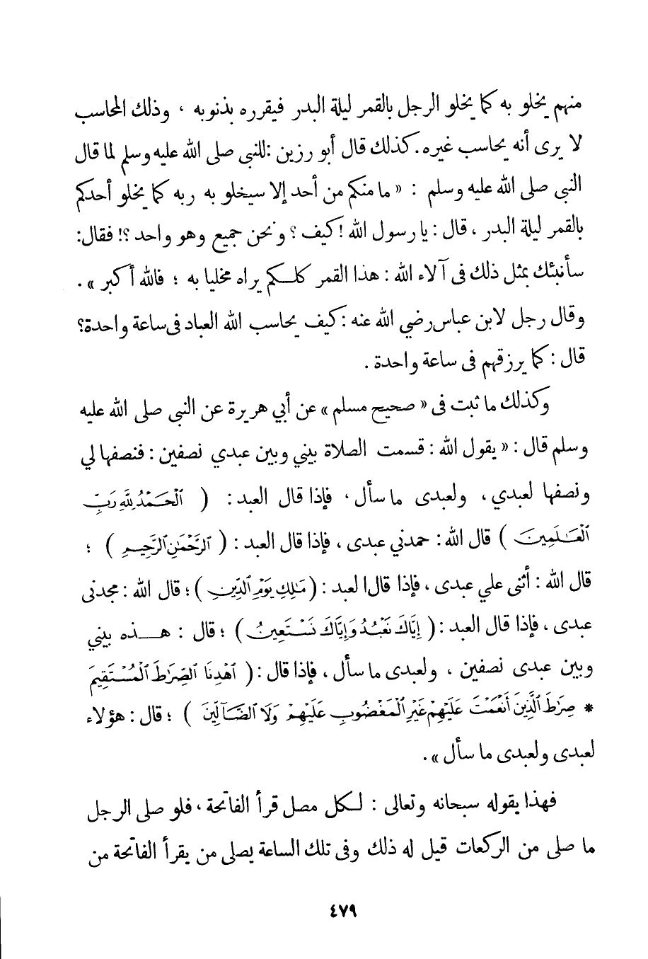 مِنْهُمْ يَخْلُو بِهِ كَمَا يَخْلُو الرَّجُلُ بِالْقَمَرِ لَيْلَةَ الْبَدْرِ فَيُقَرِّرُهُ بِذُنُوبِهِ وَذَلِكَ الْمُحَاسَبُ لَا يَرَى أَنَّهُ يُحَاسِبُ غَيْرَهُ. كَذَلِكَ {قَالَ أَبُو رَزِينٍ: لِلنَّبِيِّ صَلَّى اللَّهُ عَلَيْهِ وَسَلَّمَ لَمَّا قَالَ النَّبِيُّ صَلَّى اللَّهُ عَلَيْهِ وَسَلَّمَ مَا مِنْكُمْ مِنْ أَحَدٍ إلَّا سَيَخْلُو بِهِ رَبُّهُ كَمَا يَخْلُو أَحَدُكُمْ بِالْقَمَرِ لَيْلَةَ الْبَدْرِ قَالَ: يَا رَسُولَ اللَّهِ كَيْفَ؟ وَنَحْنُ جَمِيعٌ وَهُوَ وَاحِدٌ فَقَالَ: سَأُنَبِّئُك بِمِثْلِ ذَلِكَ فِي آلَاءِ اللَّهِ: هَذَا الْقَمَرُ كُلُّكُمْ يَرَاهُ مُخْلِيًا بِهِ؛ فَاَللَّهُ أَكْبَرُ} . وَقَالَ رَجُلٌ لِابْنِ عَبَّاسٍ رَضِيَ اللَّهُ عَنْهُ كَيْفَ يُحَاسِبُ اللَّهُ الْعِبَادَ فِي سَاعَةٍ وَاحِدَةٍ؟ قَالَ: كَمَا يَرْزُقُهُمْ فِي سَاعَةٍ وَاحِدَةٍ. وَكَذَلِكَ مَا ثَبَتَ فِي " صَحِيحِ مُسْلِمٍ " عَنْ أَبِي هُرَيْرَةَ عَنْ النَّبِيِّ صَلَّى اللَّهُ عَلَيْهِ وَسَلَّمَ قَالَ: {يَقُولُ اللَّهُ: قَسَمْت الصَّلَاةَ بَيْنِي وَبَيْنَ عَبْدِي نِصْفَيْنِ: فَنِصْفُهَا لِي وَنِصْفُهَا لِعَبْدِي وَلِعَبْدِي مَا سَأَلَ فَإِذَا قَالَ الْعَبْدُ: {الْحَمْدُ لِلَّهِ رَبِّ الْعَالَمِينَ} قَالَ اللَّهُ: حَمِدَنِي عَبْدِي فَإِذَا قَالَ الْعَبْدُ: {الرَّحْمَنِ الرَّحِيمِ} قَالَ اللَّهُ: أَثْنَى عَلَيَّ عَبْدِي فَإِذَا قَالَ الْعَبْدُ: {مَالِكِ يَوْمِ الدِّينِ} قَالَ اللَّهُ: مَجَّدَنِي عَبْدِي فَإِذَا قَالَ الْعَبْدُ: {إيَّاكَ نَعْبُدُ وَإِيَّاكَ نَسْتَعِينُ} قَالَ: هَذِهِ بَيْنِي وَبَيْنَ عَبْدِي نِصْفَيْنِ وَلِعَبْدِي مَا سَأَلَ فَإِذَا قَالَ: {اهْدِنَا الصِّرَاطَ الْمُسْتَقِيمَ} {صِرَاطَ الَّذِينَ أَنْعَمْتَ عَلَيْهِمْ غَيْرِ الْمَغْضُوبِ عَلَيْهِمْ وَلَا الضَّالِّينَ} قَالَ: هَؤُلَاءِ لِعَبْدِي وَلِعَبْدِي مَا سَأَلَ} . فَهَذَا يَقُولُهُ سُبْحَانَهُ وَتَعَالَى: لِكُلِّ مُصَلٍّ قَرَأَ الْفَاتِحَةَ فَلَوْ صَلَّى الرَّجُلُ مَا صَلَّى مِنْ الرَّكَعَاتِ قِيلَ لَهُ ذَلِكَ وَفِي تِلْكَ السَّاعَةِ يُصَلِّي مَنْ يَقْرَأُ الْفَاتِحَةَ مَنْ