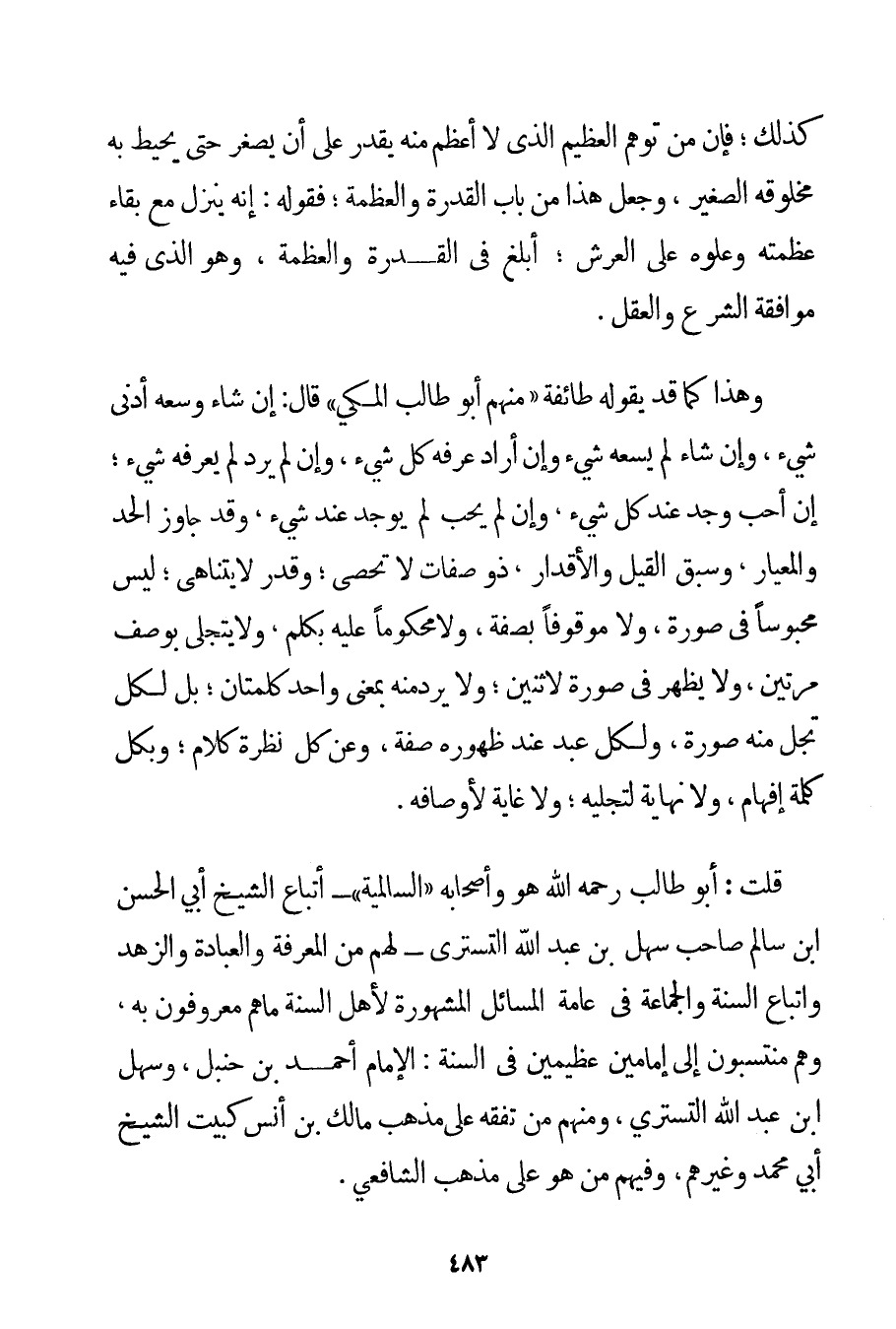 وَهَذَا كَمَا قَدْ يَقُولُهُ طَائِفَةٌ " مِنْهُمْ أَبُو طَالِبٍ الْمَكِّيُّ " قَالَ: إنْ شَاءَ وَسِعَهُ أَدْنَى شَيْءٍ وَإِنْ شَاءَ لَمْ يَسَعْهُ شَيْءٌ وَإِنْ أَرَادَ عَرَفَهُ كُلُّ شَيْءٍ وَإِنْ لَمْ يُرِدْ لَمْ يَعْرِفْهُ شَيْءٌ؛ إنْ أَحَبَّ وُجِدَ عِنْدَ كُلِّ شَيْءٍ وَإِنْ لَمْ يُحِبَّ لَمْ يُوجَدْ عِنْدَ شَيْءٍ وَقَدْ جَاوَزَ الْحَدَّ وَالْمِعْيَارَ وَسَبَقَ الْقِيلَ وَالْأَقْدَارَ ذُو صِفَاتٍ لَا تُحْصَى؛ وَقَدْرٍ لَا يَتَنَاهَى؛ لَيْسَ مَحْبُوسًا فِي صُورَةٍ وَلَا مَوْقُوفًا بِصِفَةِ وَلَا مَحْكُومًا عَلَيْهِ بِكَلِمِ وَلَا يَتَجَلَّى بِوَصْفِ مَرَّتَيْنِ وَلَا يَظْهَرُ فِي صُورَةٍ لِاثْنَيْنِ؛ وَلَا يَرِدُ مِنْهُ بِمَعْنَى وَاحِدٍ كَلِمَتَانِ؛ بَلْ لِكُلِّ تَجَلٍّ مِنْهُ صُورَةٌ وَلِكُلِّ عَبْدٍ عِنْدَ ظُهُورِهِ صِفَةٌ وَعَنْ كُلِّ نَظْرَةٍ كَلَامٌ؛ وَبِكُلِّ كَلِمَةٍ إفْهَامٌ وَلَا نِهَايَةَ لِتَجَلِّيهِ؛ وَلَا غَايَةَ لِأَوْصَافِهِ. قُلْت: أَبُو طَالِبٍ رَحِمَهُ اللَّهُ هُوَ وَأَصْحَابُهُ " السالمية " أَتْبَاعُ الشَّيْخِ أَبِي الْحَسَنِ بْنِ سَالِمٍ صَاحِبِ سَهْلِ بْنِ عَبْدِ اللَّهِ التستري - لَهُمْ مِنْ الْمَعْرِفَةِ وَالْعِبَادَةِ وَالزُّهْدِ وَاتِّبَاعِ السُّنَّةِ وَالْجَمَاعَةِ فِي عَامَّةِ الْمَسَائِلِ الْمَشْهُورَةِ لِأَهْلِ السُّنَّةِ مَا هُمْ مَعْرُوفُونَ بِهِ وَهُمْ مُنْتَسِبُونَ إلَى إمَامَيْنِ عَظِيمَيْنِ فِي السُّنَّةِ: الْإِمَامِ أَحْمَد بْنِ حَنْبَلٍ وَسَهْلِ بْنِ عَبْدِ اللَّهِ التستري وَمِنْهُمْ مَنْ تَفَقَّهَ عَلَى مَذْهَبِ مَالِكِ بْنِ أَنَس كَبَيْتِ الشَّيْخِ أَبِي مُحَمَّدٍ وَغَيْرِهِمْ وَفِيهِمْ مَنْ هُوَ عَلَى مَذْهَبِ الشَّافِعِيِّ.